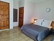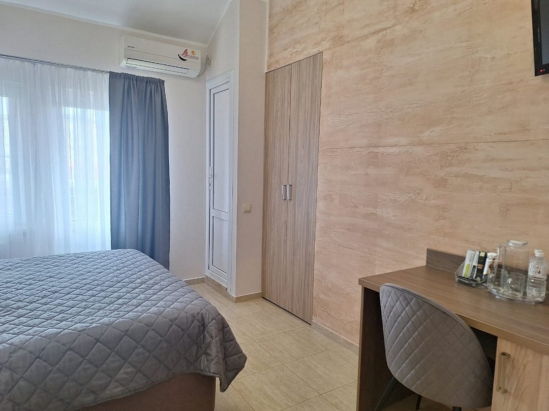 В номере 1 двуспальная кровать. Имеется москитная сетка, плотные шторы, телевизор, кондиционер, шкаф, вешалка, зеркало, стол рабочий, посуда, холодильник, стулья, корзина для мусора.