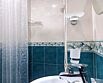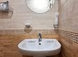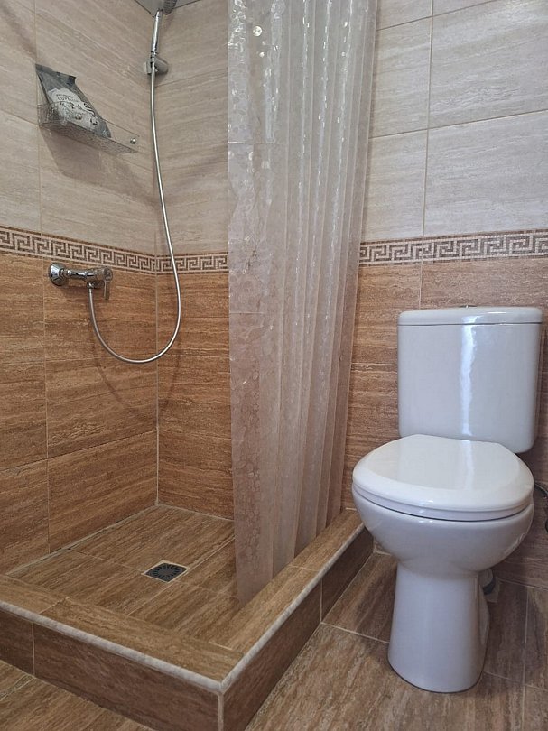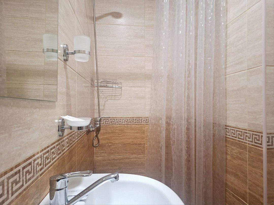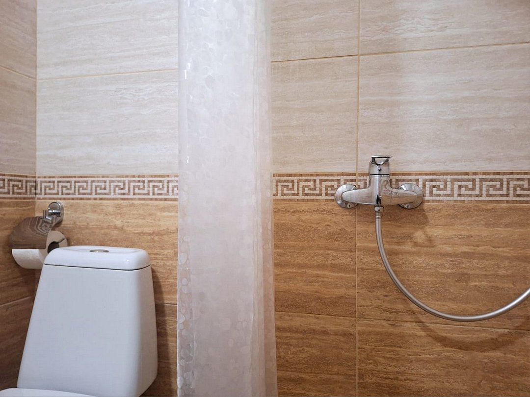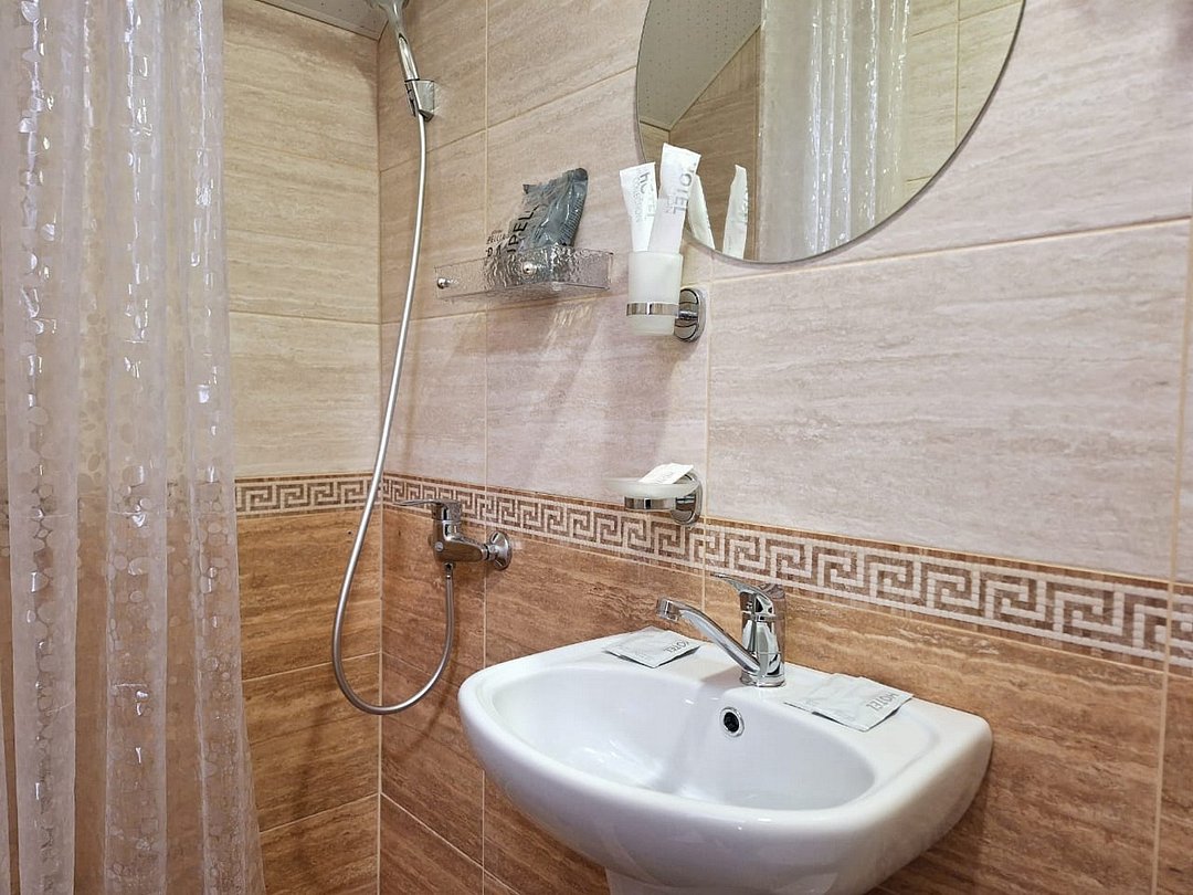 Индивидуальная ванная комната: душ, раковина, туалет, фен, тапочки, ванные принадлежности.