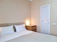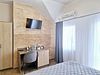 Имеет спальню с приятным интерьером, балкон, витражное панорамное окно.
