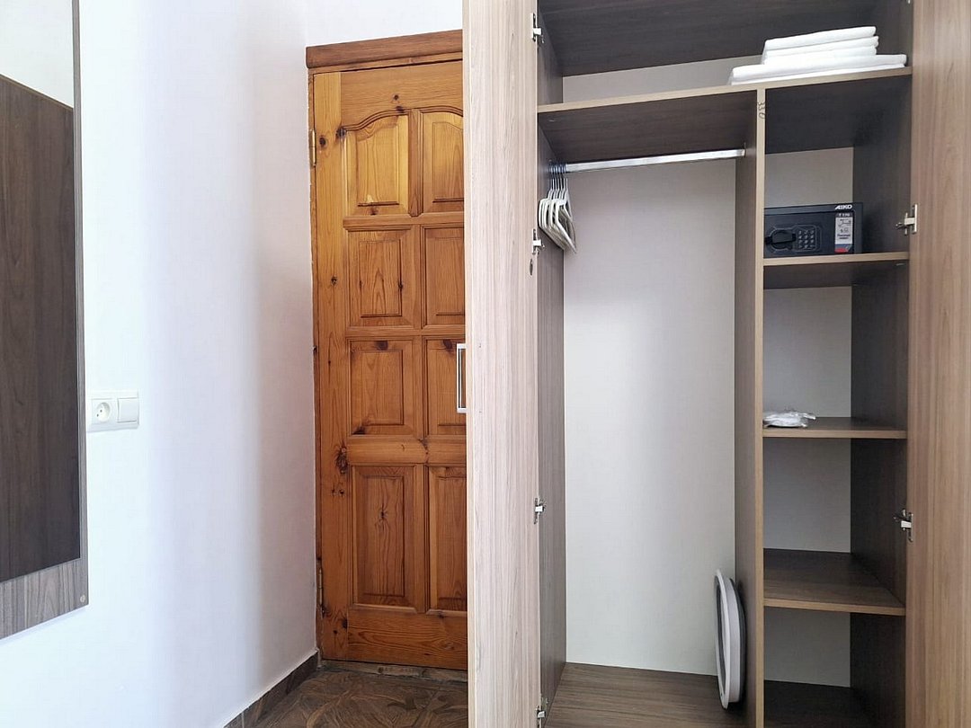 Имеется сейф, антимоскитная сетка, плотные шторы, телевизор, кондиционер, шкаф, вешалка, зеркало, стол рабочий, посуда, столовые принадлежности, холодильник, стулья, корзина для мусора.