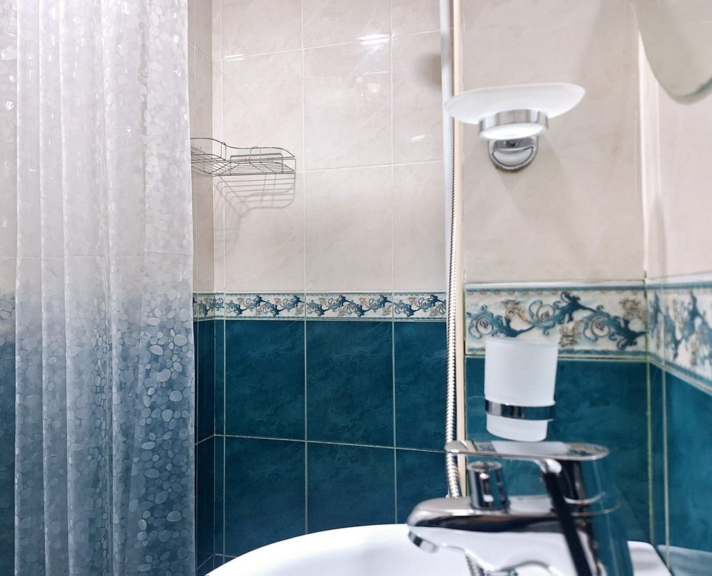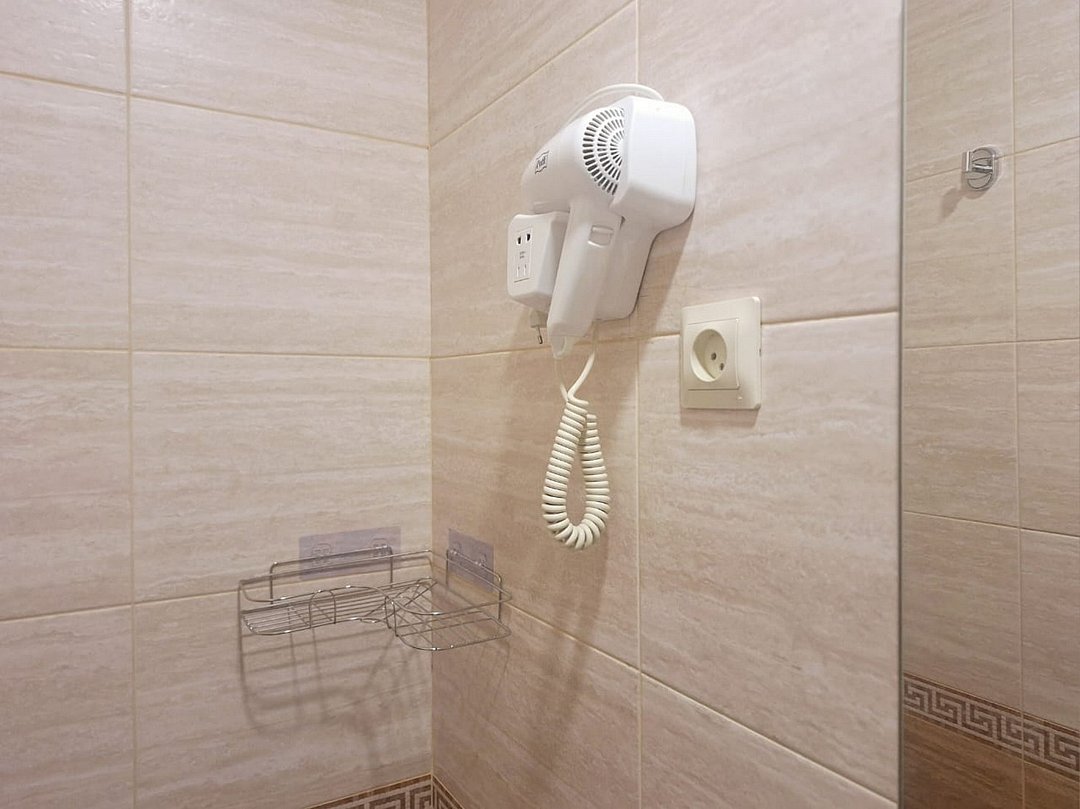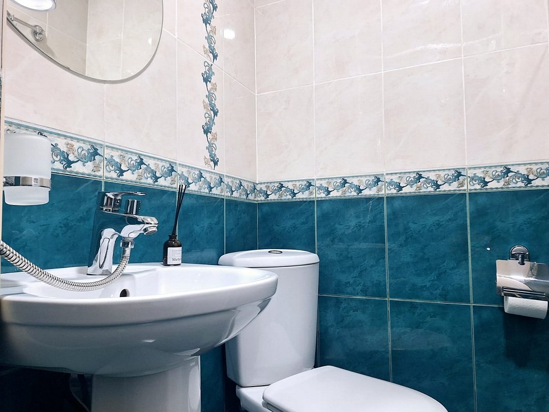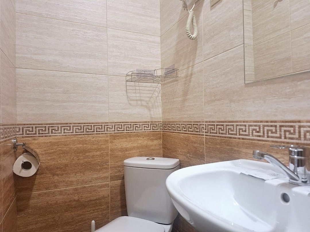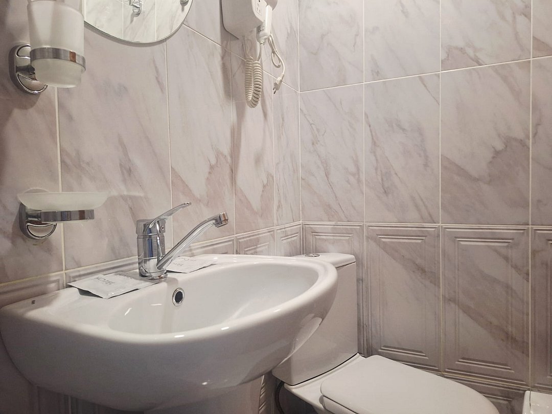 Индивидуальная ванная комната: душ, раковина, туалет, тапочки, фен, ванные принадлежности.