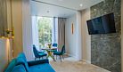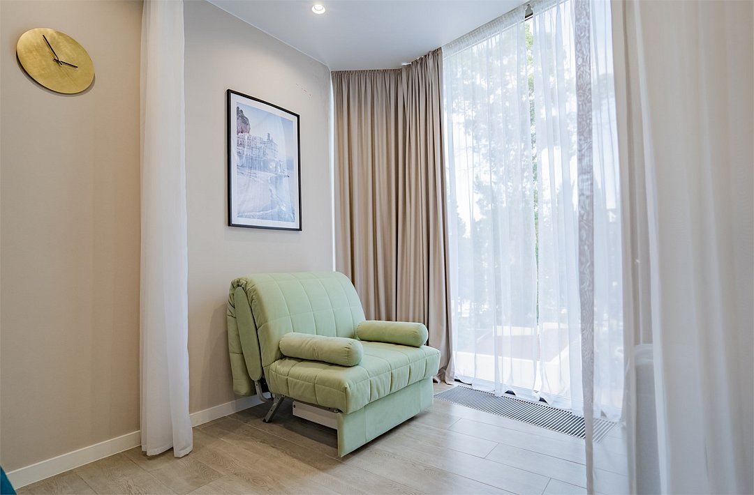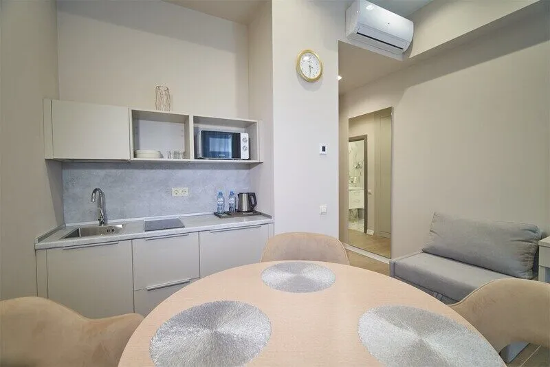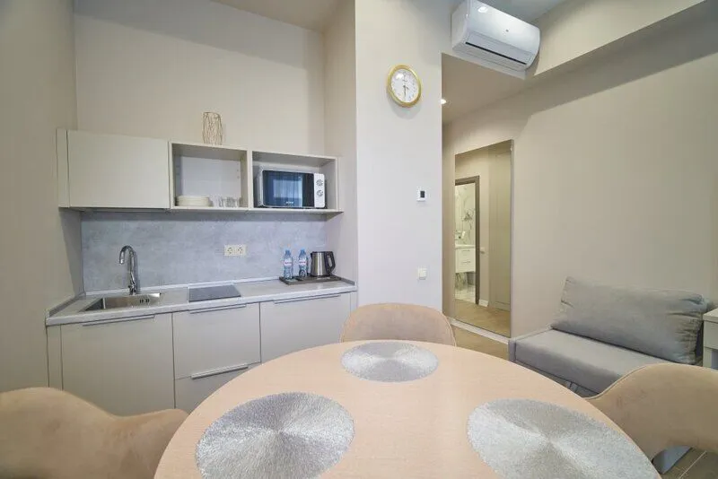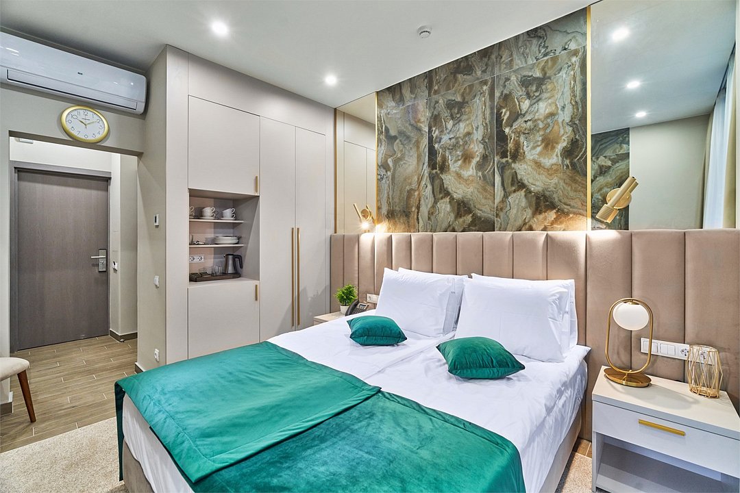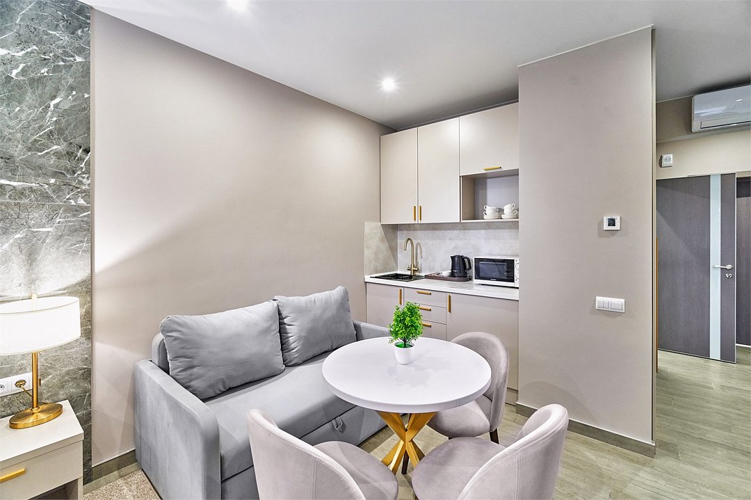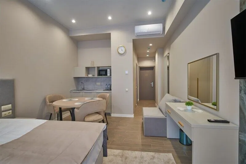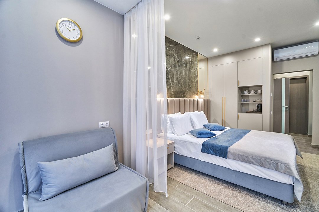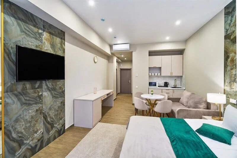 Во всех апартаментах присутствует современный дизайнерский интерьер с полным набором удобств, включая Wi-Fi, кондиционирование, телевизор, чайную станцию, холодильник, фен и банные принадлежности.