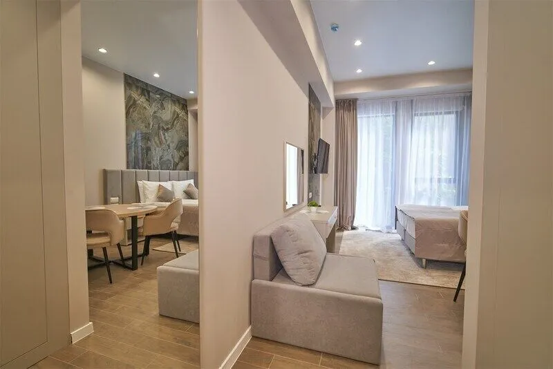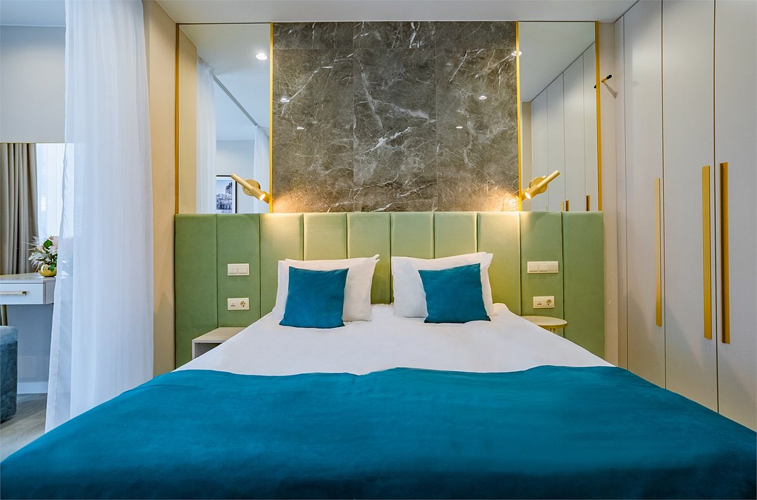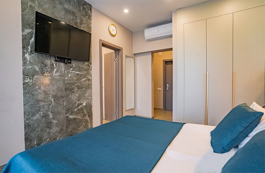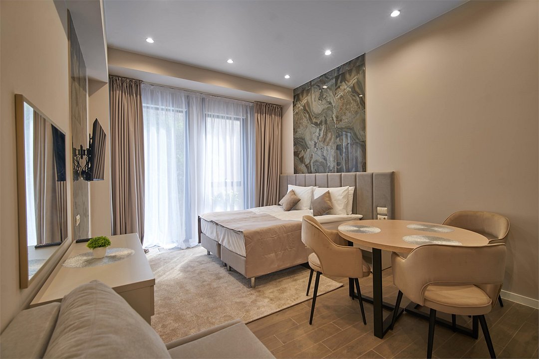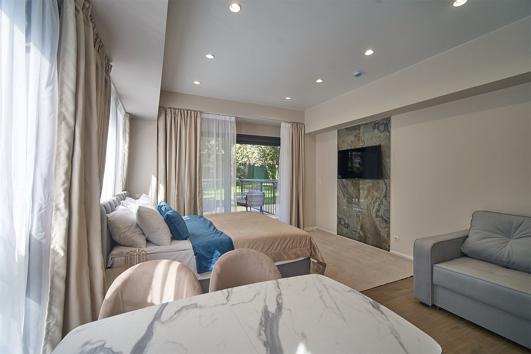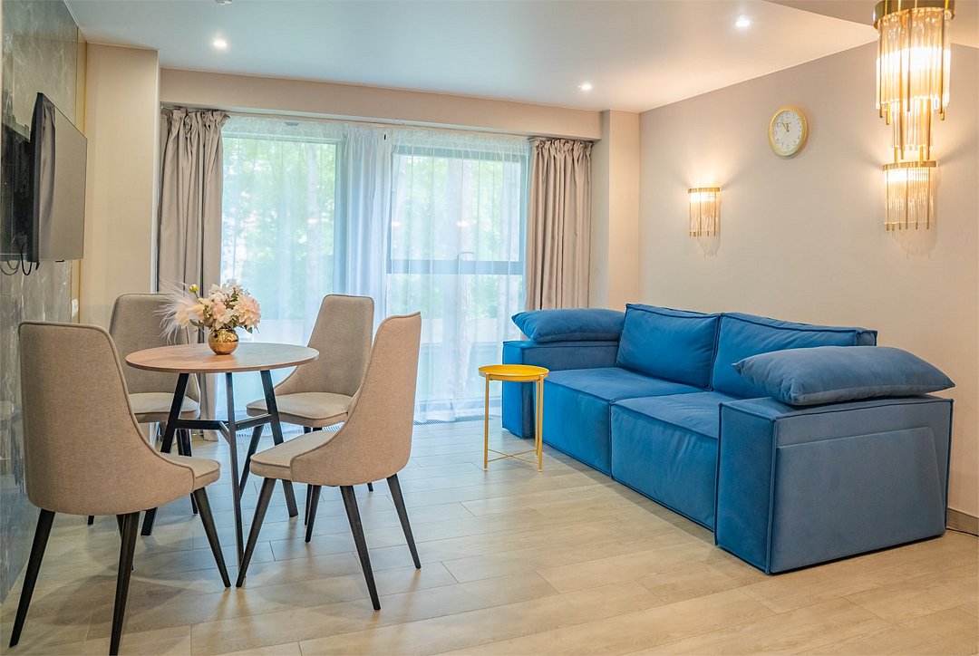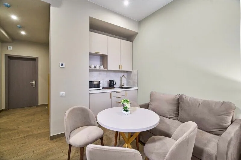 Во всех апартаментах присутствует современный дизайнерский интерьер с полным набором удобств, включая Wi-Fi, кондиционирование, телевизор, чайную станцию, холодильник, фен и банные принадлежности.