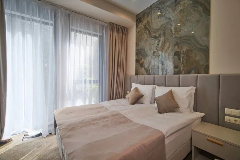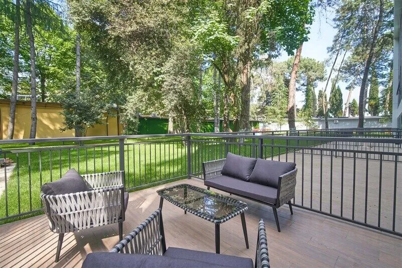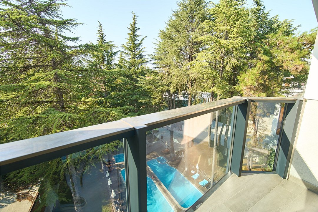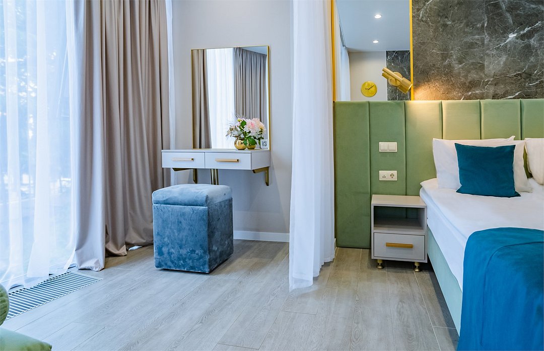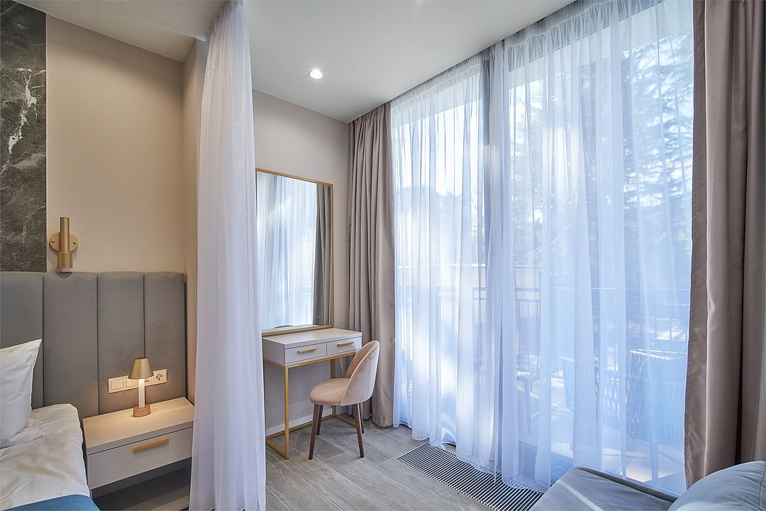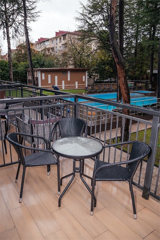 На территории отеля есть закрытая и хорошо благоустроенная зона с авторским ландшафтным дизайном, детской площадкой, собственным бассейном и комфортными номерами с прекрасными видами на зелень и горы.