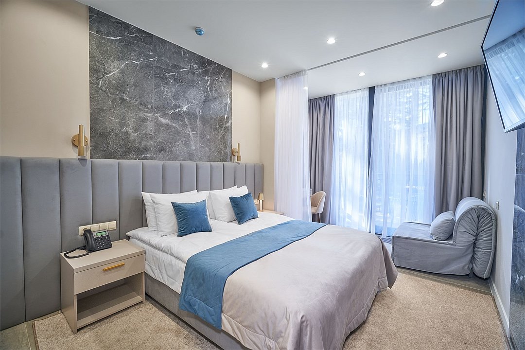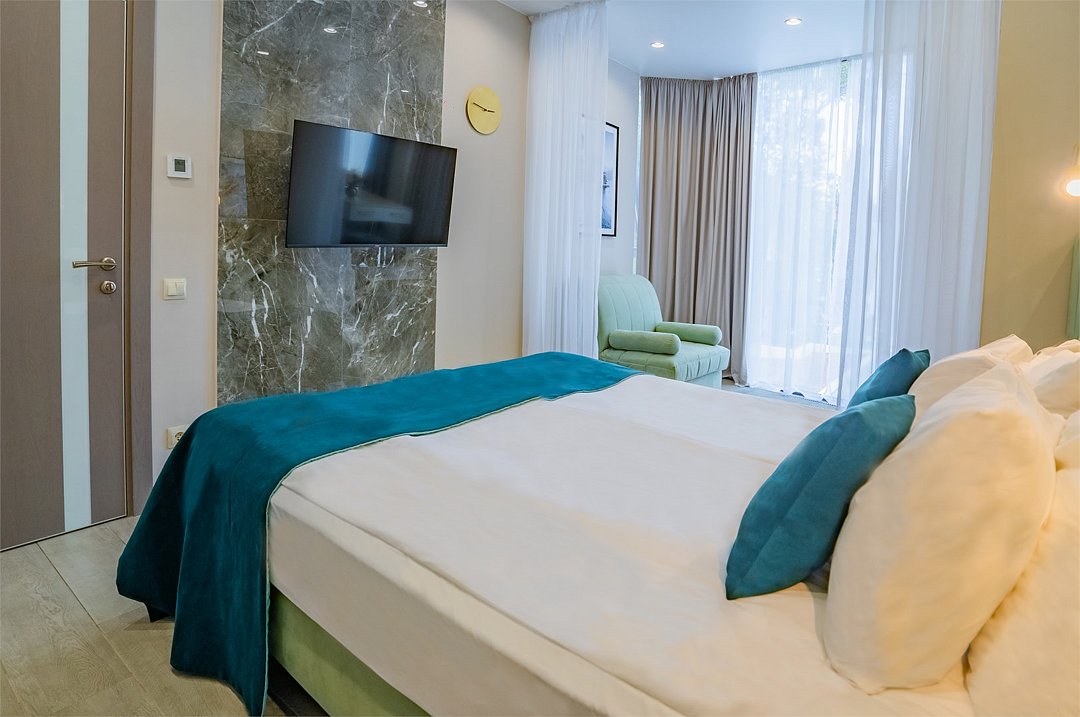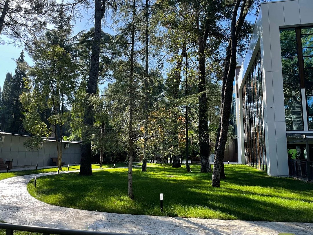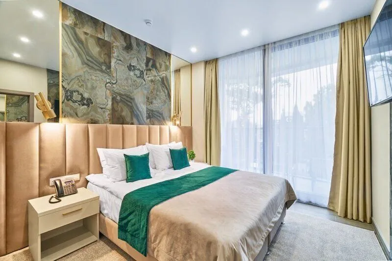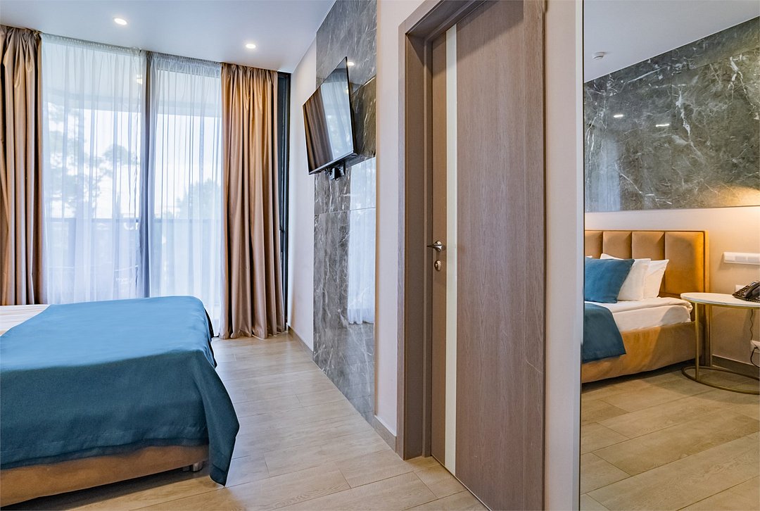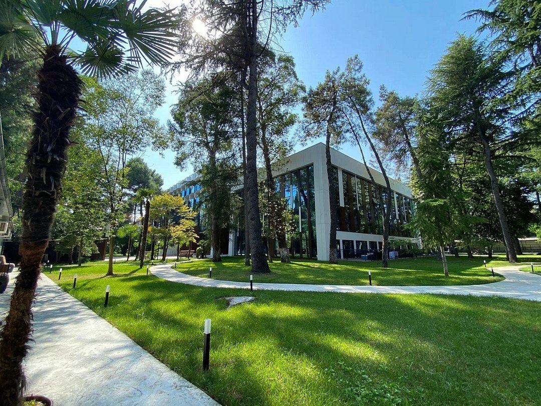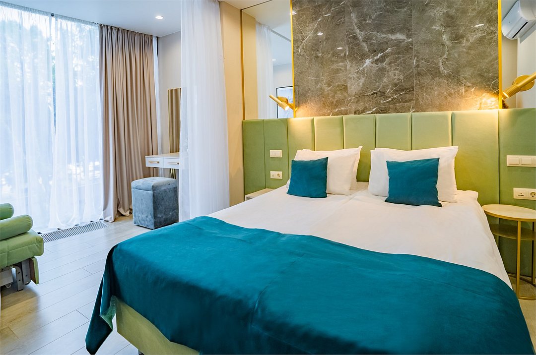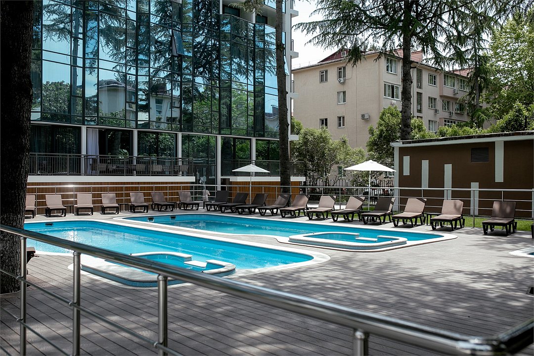 Отель с современным дизайном находится в самом центре Адлера, всего в 950 метрах от моря. Гостиничный комплекс уютно расположен в собственной зеленой парковой зоне, окруженной гималайскими соснами, эвкалиптами и кипарисами. Он предлагает 167 апартаментов с дизайнерским ремонтом и отделкой из высококачественных премиальных материалов.