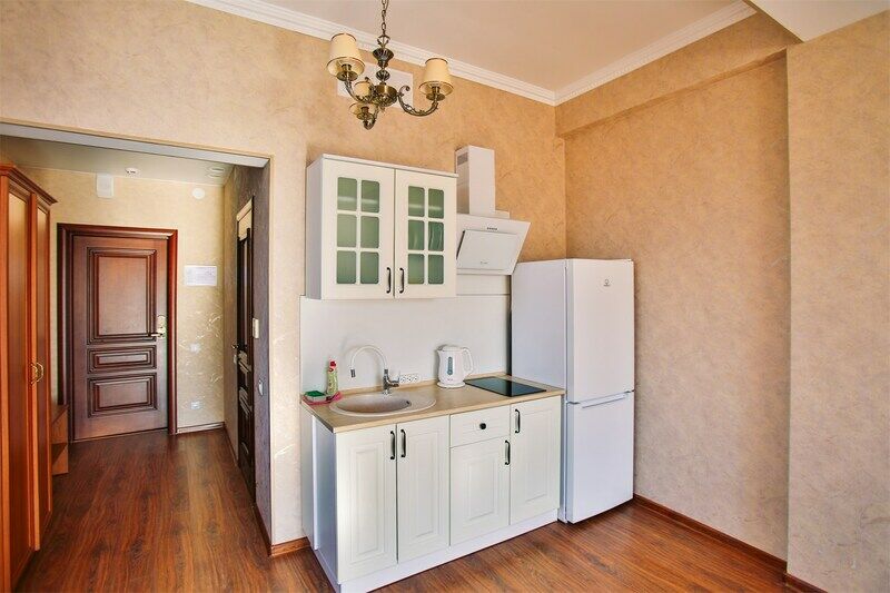 Есть холодильник,чайник и набор чайной посуды на двоих,телевизор.