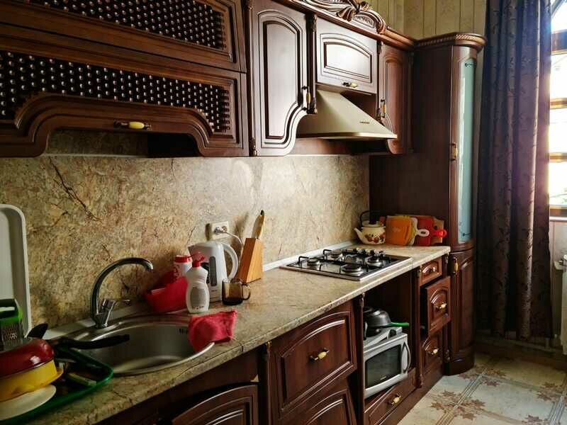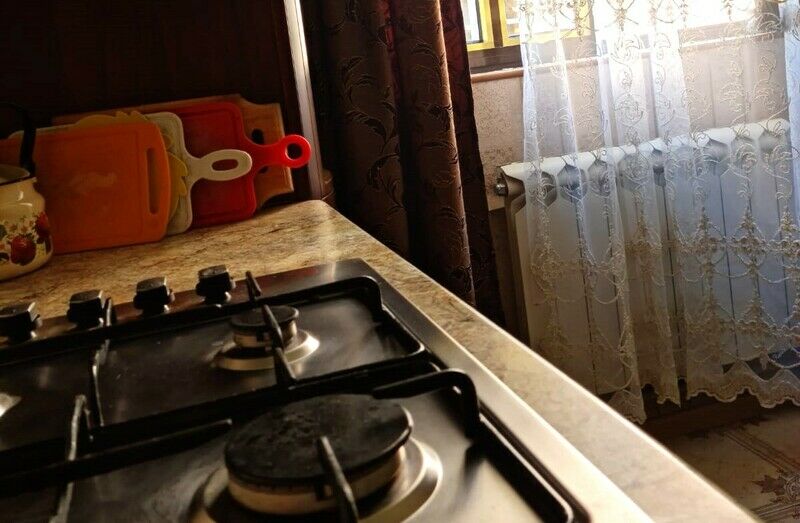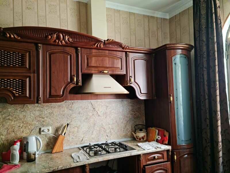 Кухня оборудована микроволновкой, чайником, плитой, столовыми приборами и посудой.