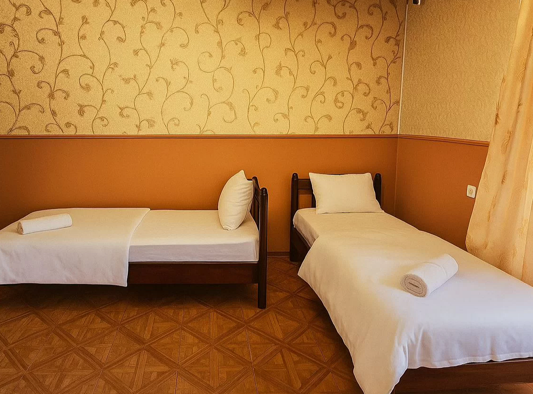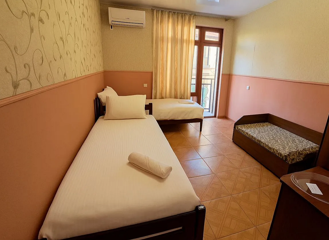 Всего в гостевом доме 12 номеров. В каждом номере есть кондиционер, телевизор и отдельная ванная комната. Все номера выходят на ленточный балкон, где установлены столики со стульями и холодильники общего пользования.