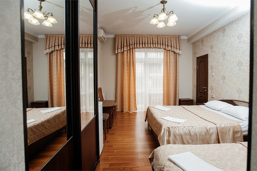 телевизор, Wi-Fi, холодильник, кондиционер, фен, ванная комната, ванна, санузел, банные принадлежности, банные полотенца, балкон, двуспальная кровать, две односпальные кровати, стулья, шкаф для одежды, вешалки, журнальный столик, зеркало, мебельный гарнитур, сейф, унитаз, вид во двор, стаканы, тумба, туалетные средства, туалет, внутренний телефон, мини-холодильник, шкаф-купе, холодильный шкаф, уборка номера, вешалки-плечики, мыло, затемняющая штора, можно с питомцамиВ гостиничном номере