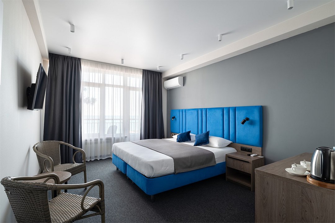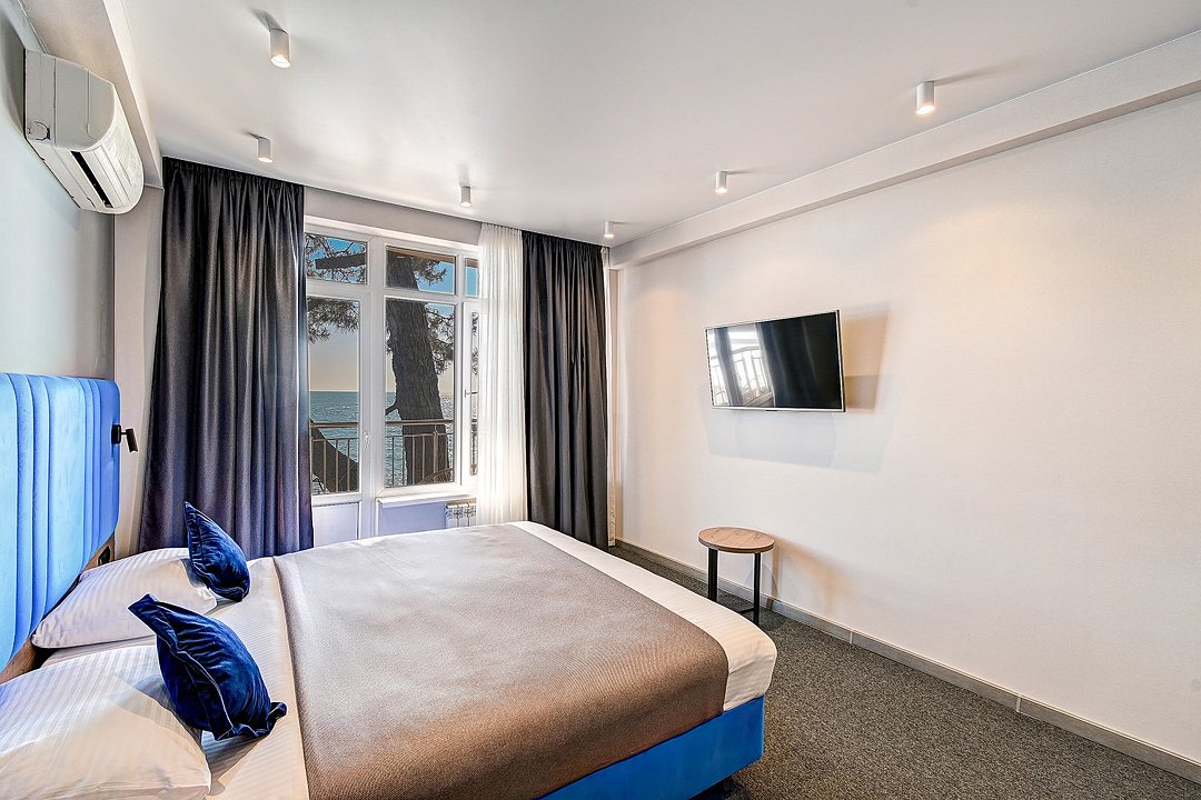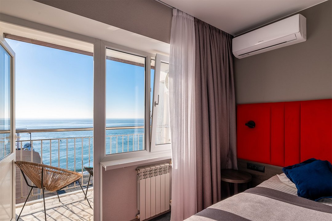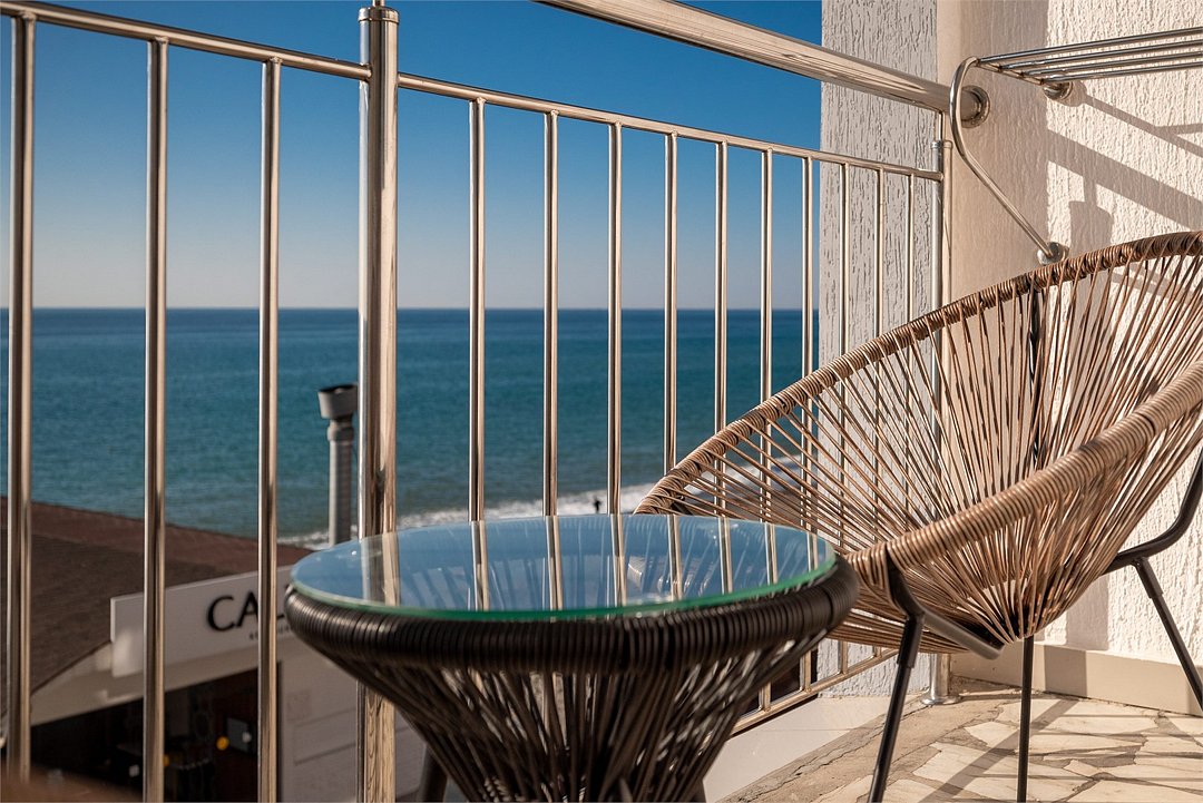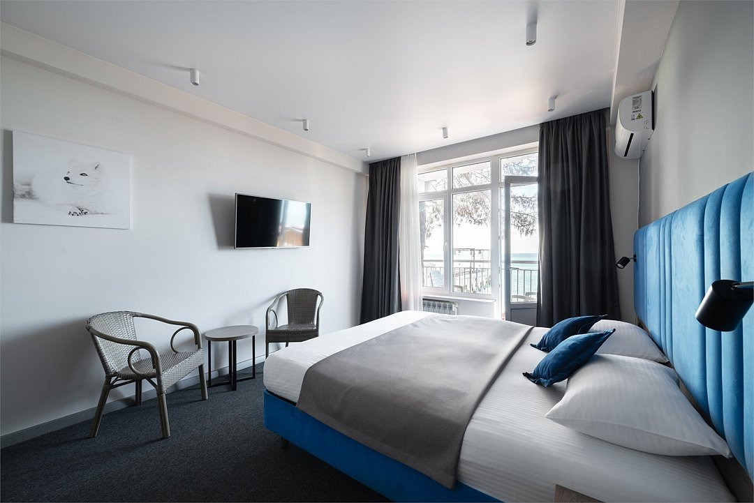 Наш отель включает в себя 18 номера категории «Стандарт c видом на море» Номер оборудован собственной душевой комнатой и туалетом, а так же балконом. Из окна номера открывается шикарный вид на море. Проживая в данной категории, вы получаете возможность засыпать и просыпаться под шум морского прибоя. Номер оформлен в современном стиле. Яркие и наоборот бежевые оттенки стен. Ванная комната оформлена в те же тона, что и комната. Номер оснащен электронным замком,кондиционером, осветительными приборами, холодильником, феном, телевизором, в номере есть доступ к сети wi-fi. Средства гигиены и ванные принадлежности пополняются ежедневно, уборка производится так же - ежедневно, смена полотенец- каждые 3 дня, смена постельного белья- каждые 3 дня. *P.S. SPA комплекс отеля (бассейн, финская сауна, хамам, тренажерный зал) не входит в стоимость проживания!Услуги и удобства