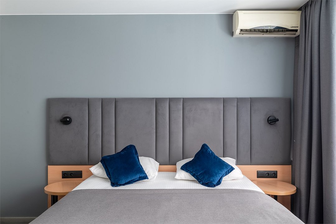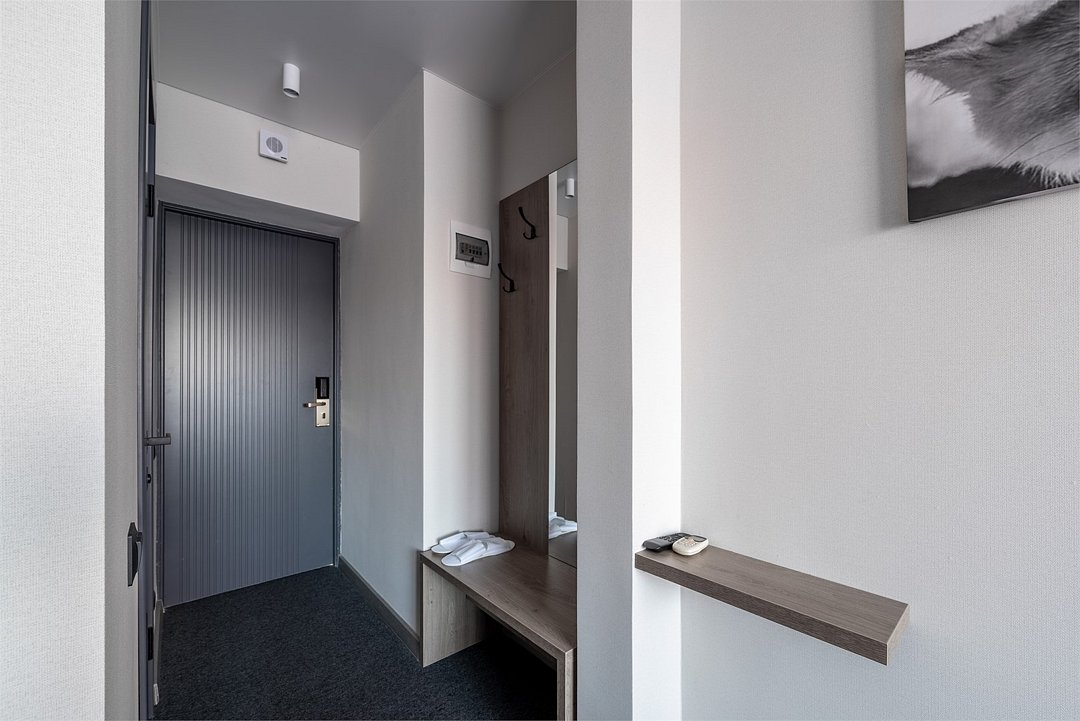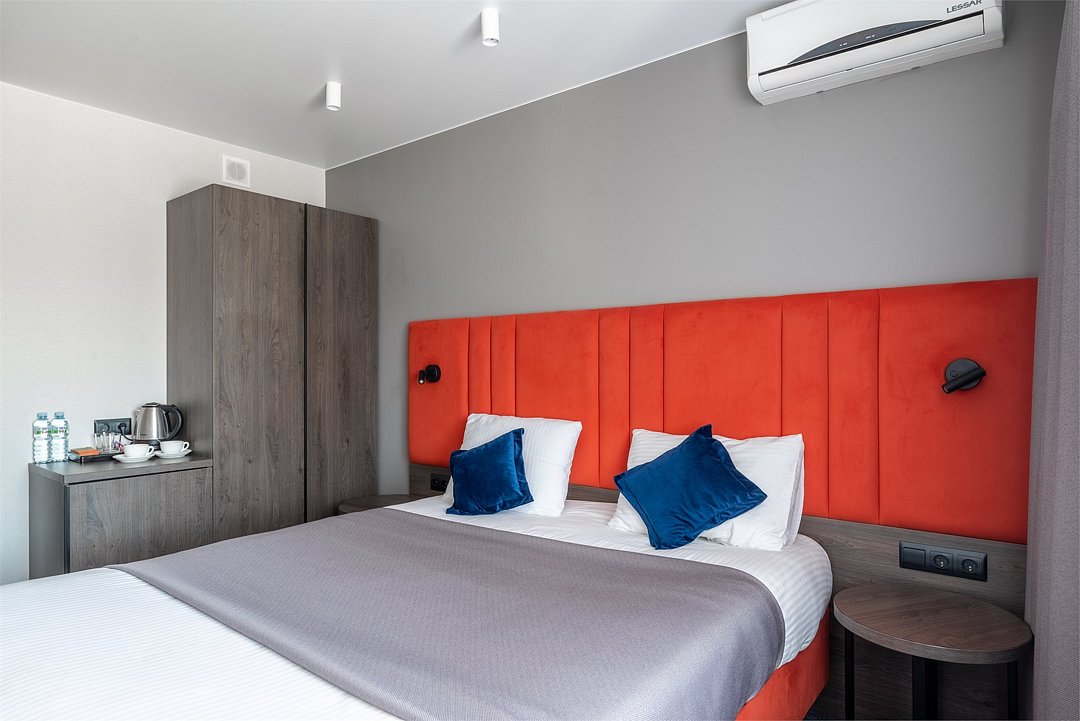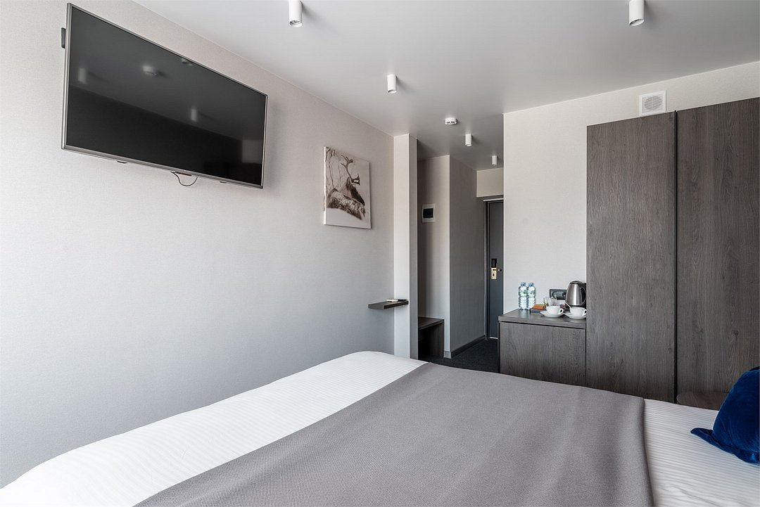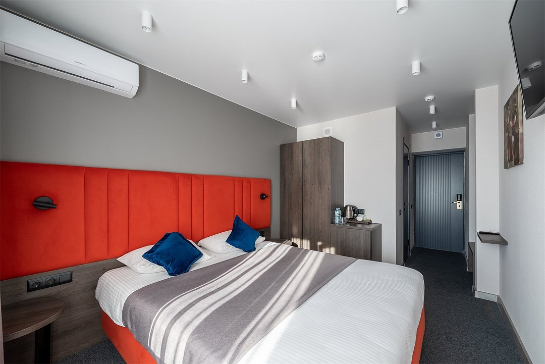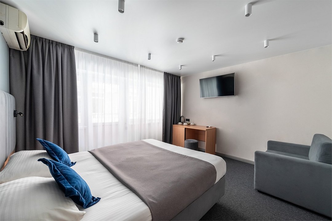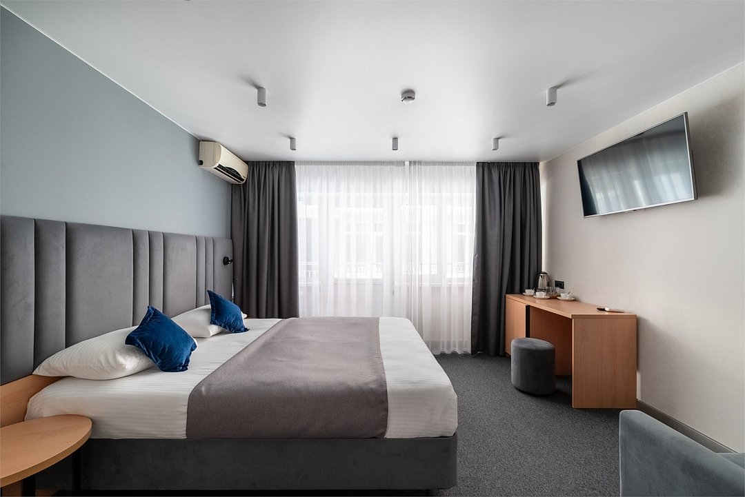 Однокомнатный номер с видом во двор или на соседние строения, двуспальная кровать 160х200 см Напольное покрытие - ковролин, балкон, ванная комната с душем В ванной комнате: Тапочки для взрослых Фен Туалетно-косметические принадлежности Оснащение: Индивидуальный кондиционер Телевизор Чайный набор (чайник, чайная посуда) Сейф Мини-бар Сушилка для одежды и полотенец Услуги: Wi-Fi Уборка номера (ежедневно) Смена постельного белья Смена полотенец Чай и кофе приветственная вода Утюг, гладильная доска (на этаже) *P.S SPA комплекс отеля (бассейн, финская сауна, хамам, тренажерный зал) не входит в стоимость проживания!Услуги и удобства