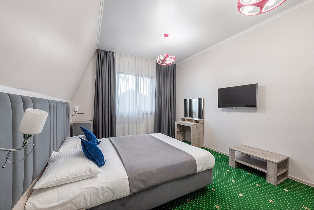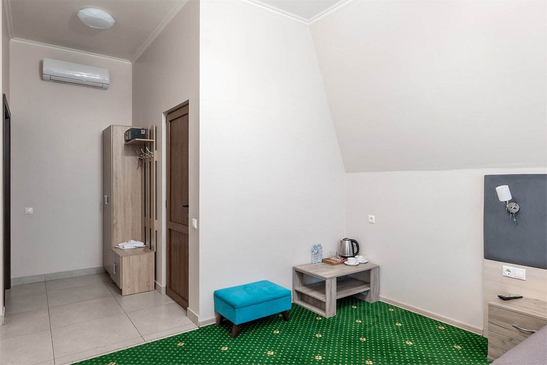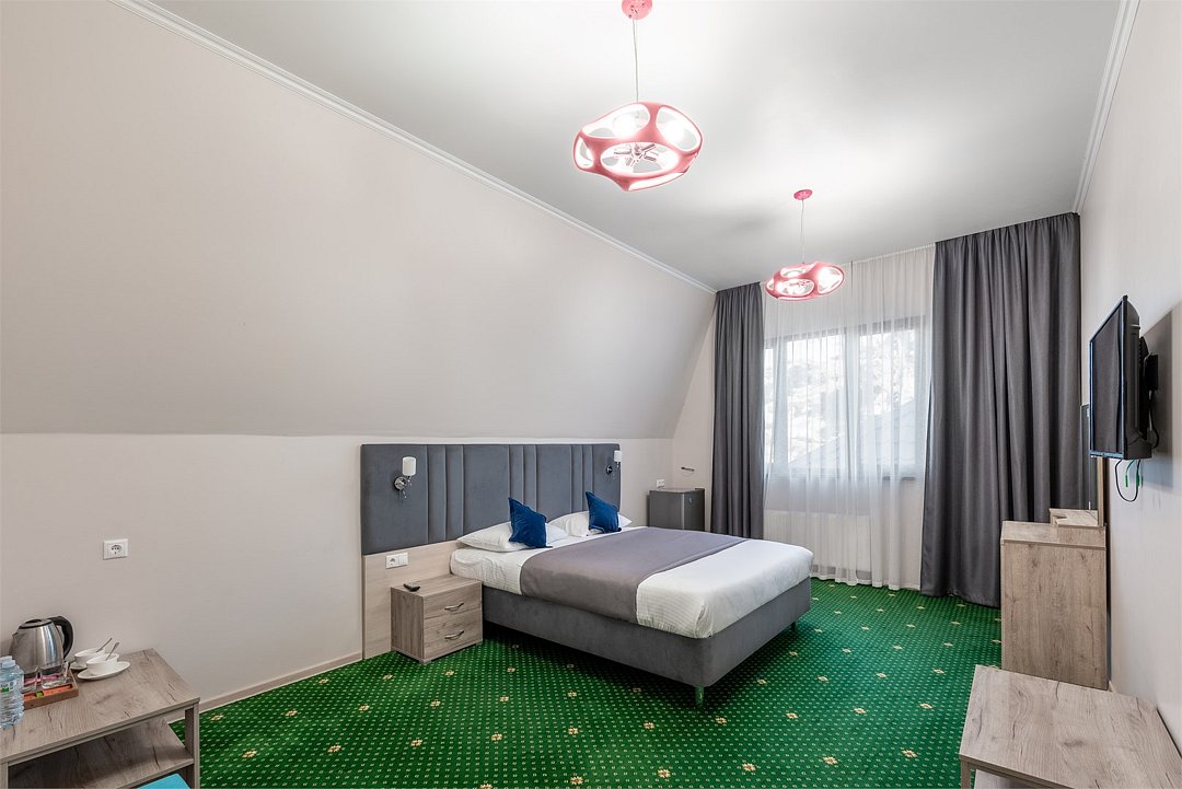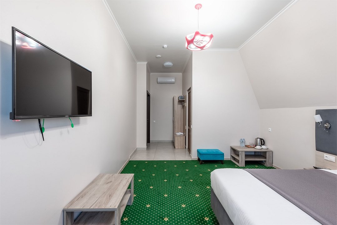 Наш отель включает в себя 7 номеров категории «Стандарт семейный» Номер оборудован собственной душевой комнатой и туалетом, а так же балконом. Из окна открывается вид на окрестности. Номер оформлен в современном стиле. Яркие и наоборот бежевые оттенки стен. Душевая комната оформлена в те же тона, что и комната. Номер оснащен электронным замком, кондиционером, осветительными приборами, холодильником, феном, телевизором, в номере есть доступ к сети wi-fi. Средства гигиены и ванные принадлежности пополняются ежедневно, уборка производится так же - ежедневно, смена полотенец- ежедневная, смена постельного белья - каждые 3 дня. *P.S. SPA комплекс отеля (бассейн, финская сауна, хамам, тренажерный зал) не входит в стоимость проживания!Услуги и удобства