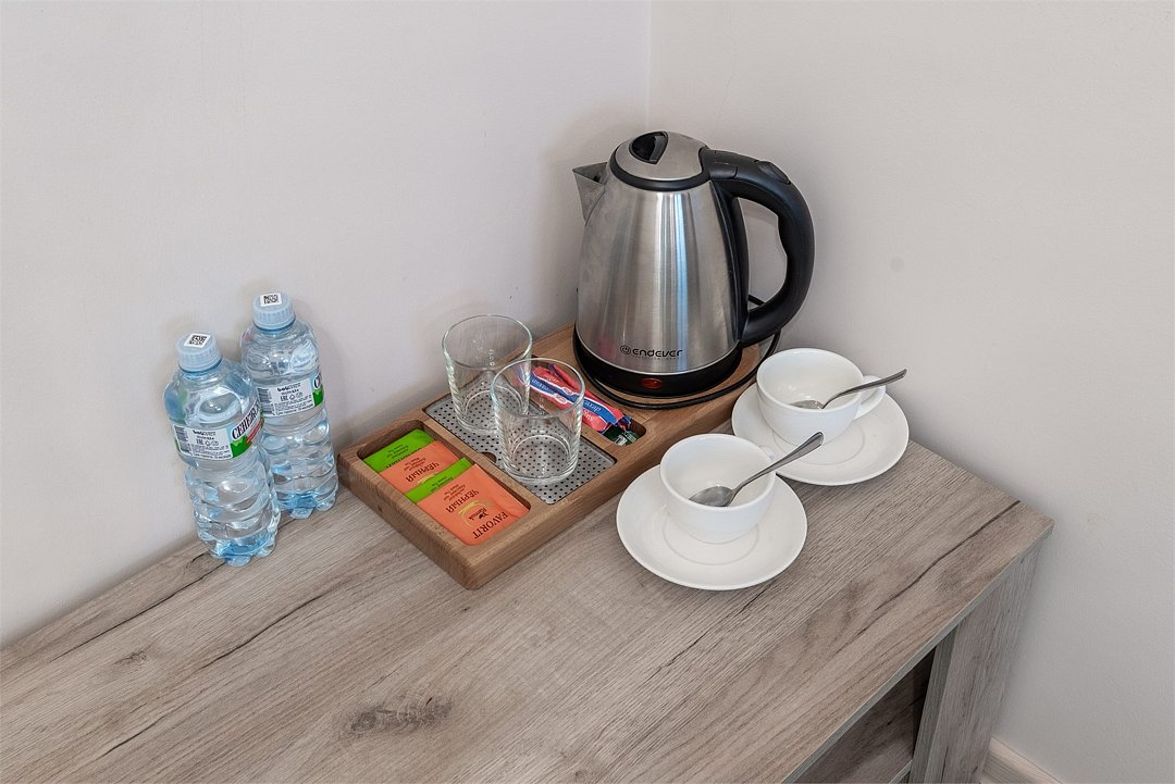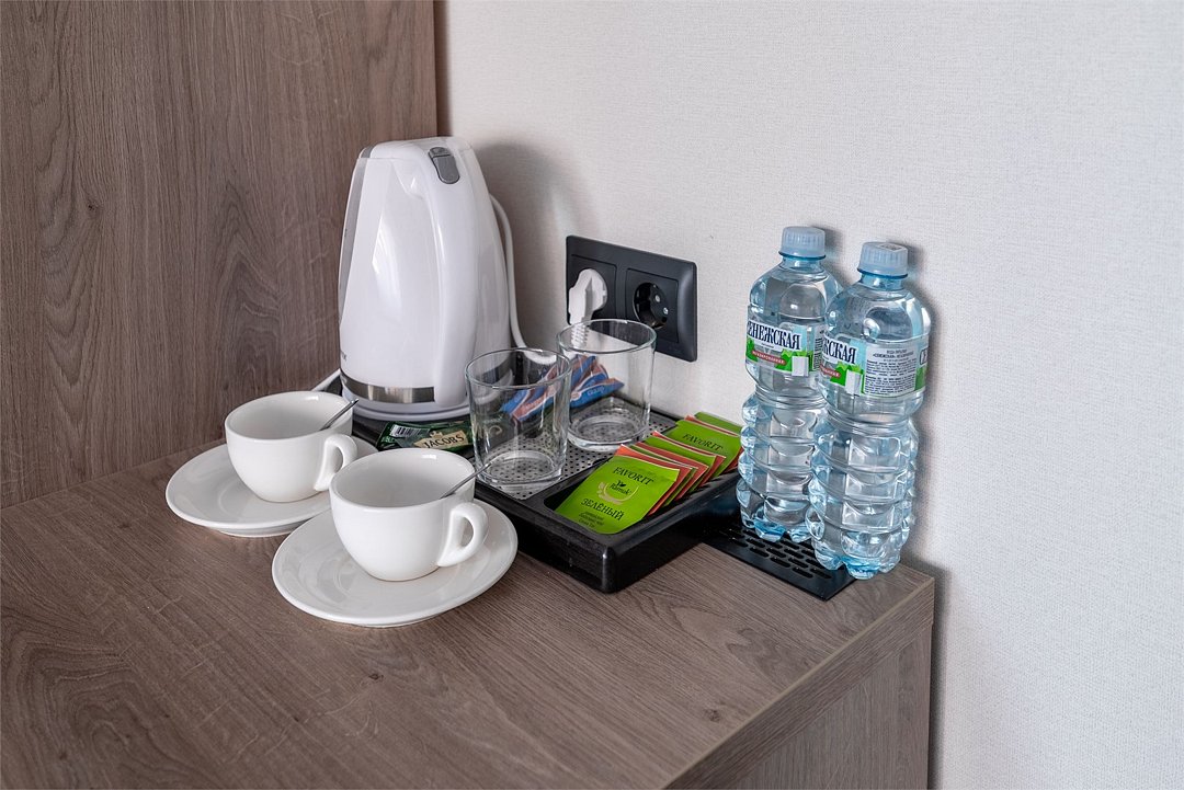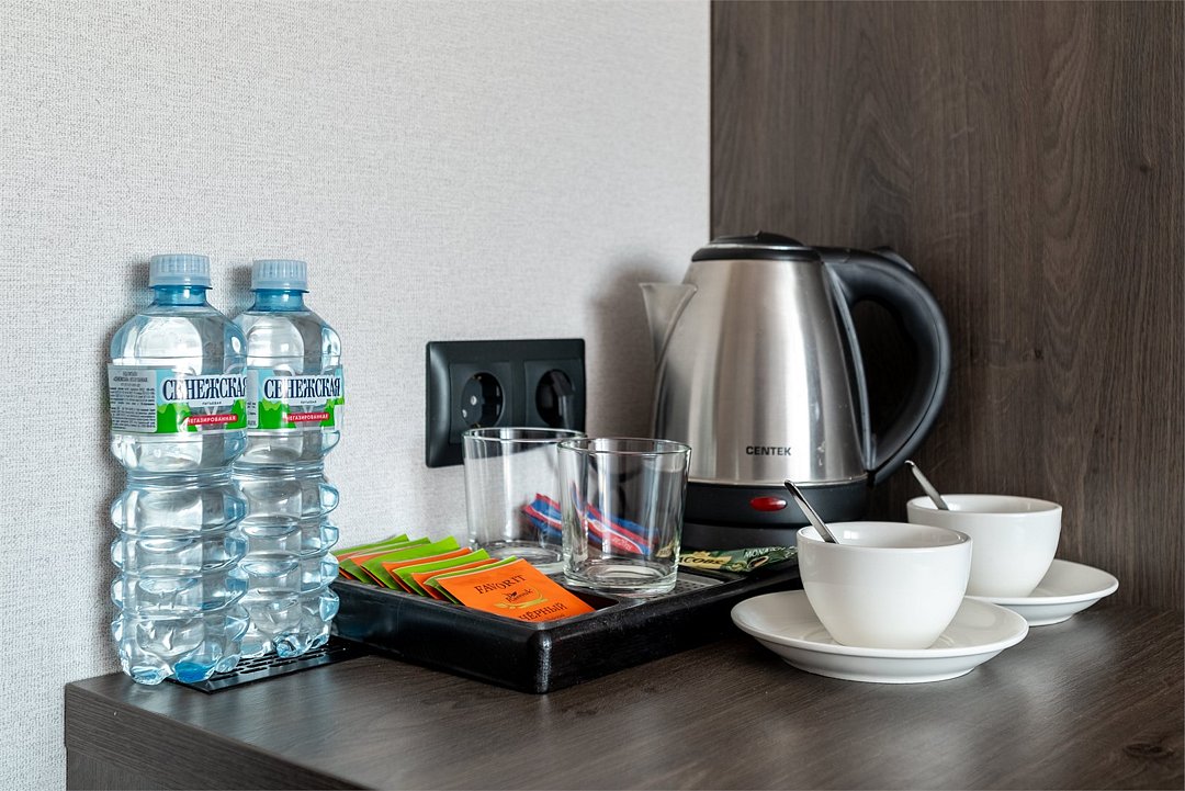 Чайник, чай, кофе сахар есть в номере. Кулер на этаже. Есть волейбольная площадка на заднем дворе. Действительно что мешает, это вертолеты, у них тут проходит маршрут. Но это не вина отеля. Это во всех отелях рядом стоящих тоже их слышно.