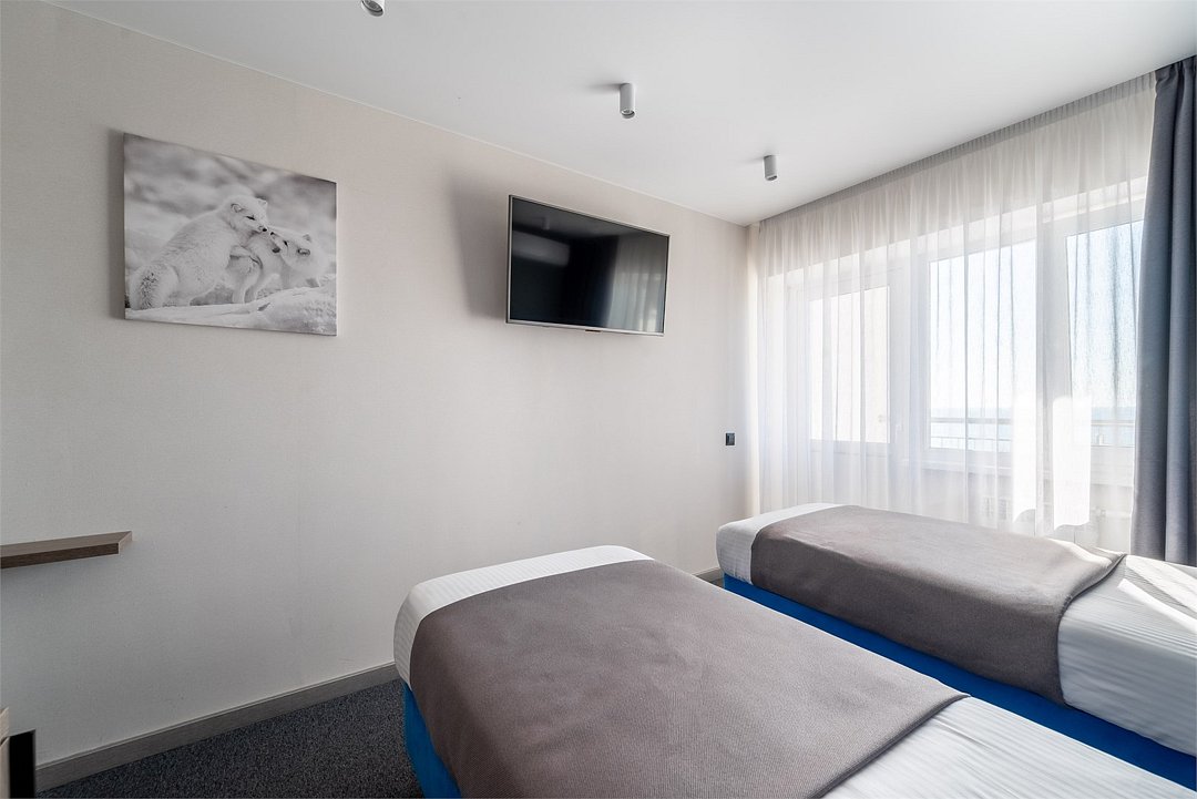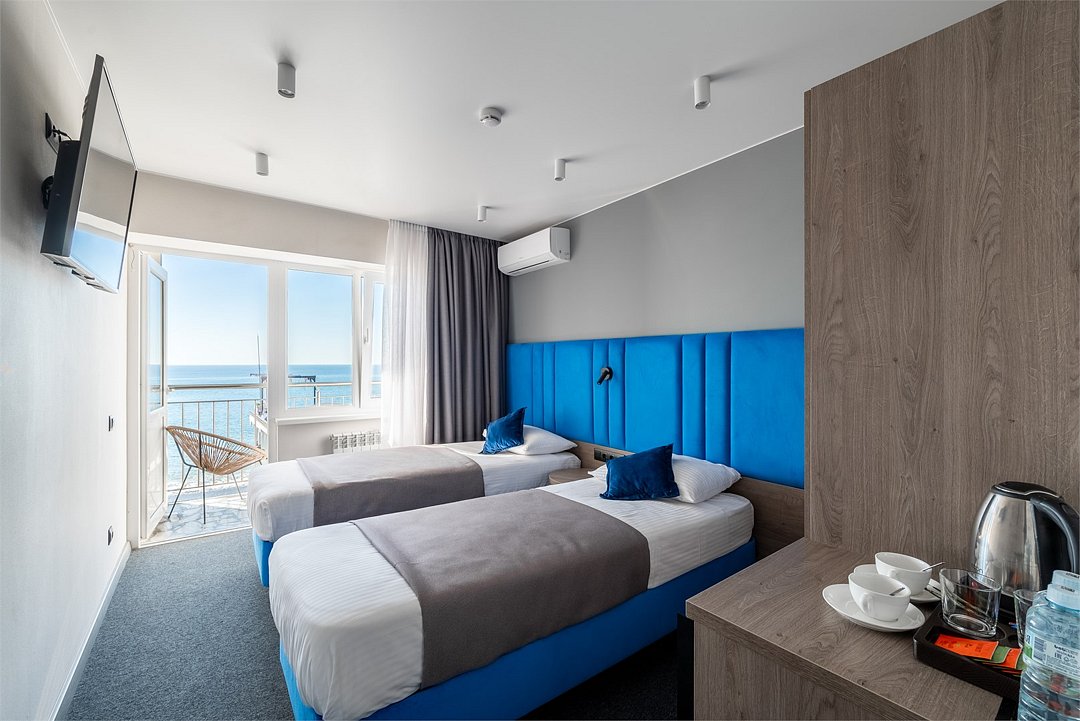 телевизор, Wi-Fi, интернет, холодильник, кондиционер, фен, электронные замки, ванная комната, душевая кабина, ванна или душевая кабина, санузел, банные принадлежности, банные полотенца, пляжные полотенца, тапочки, гигиенические средства, косметические средства, балкон, две односпальные кровати, шкаф для одежды, вешалки, багажная тумба, зеркало, мебельный гарнитур, звуконепроницаемые стены и окна, чайный набор, обслуживание номеров, сейф, чайник, унитаз, раковина, косметическое зеркало, питьевая вода, ковровое покрытие, отопление, душ, вид на море, стаканы, туалетные средства, туалет, сплит-система, цифровое тв, телевизор с плоским экраном, мини-холодильник, телевизор со Smart TV, номер для некурящих, уборка номера, набор для приготовления чая и кофе, вешалки-плечики, бутилированная вода, без питомцевВ гостиничном номере