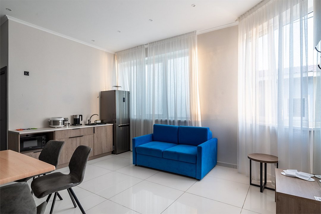 Уютная студия с прямым видом на море с 1 большой кроватью и 1 дополнительным спальным местом. Mебелированна прихожая зона. Комплектация номера: отопление, кондиционер, собственная ванная комната, телевизор с плоским экраном, звукоизоляция, бесплатный Wi-Fi, диван, холодильник, электрический чайник. Санузел c душевой, укомплектован одноразовыми косметическими принадлежностями, комплектом полотенец, тапочками на каждого гостя. На балконе есть стол и два стула. В данной категории представлены разные фотографии, это может означать, что номера внутри категории могут немного отличаться по дизайну или расположению, или фотографии показывают разные варианты этого типа номера. *P.S. SPA комплекс отеля (бассейн, финская сауна, хамам) не входит в стоимость проживания!Услуги и удобства