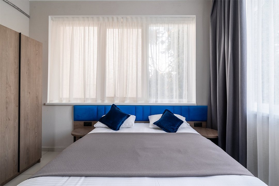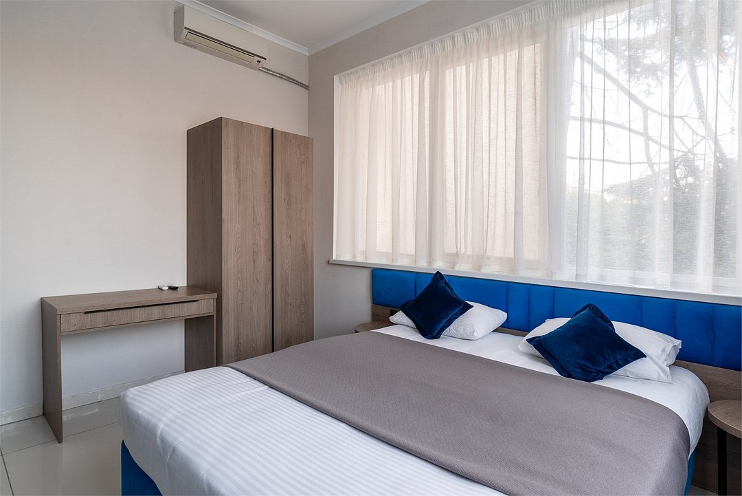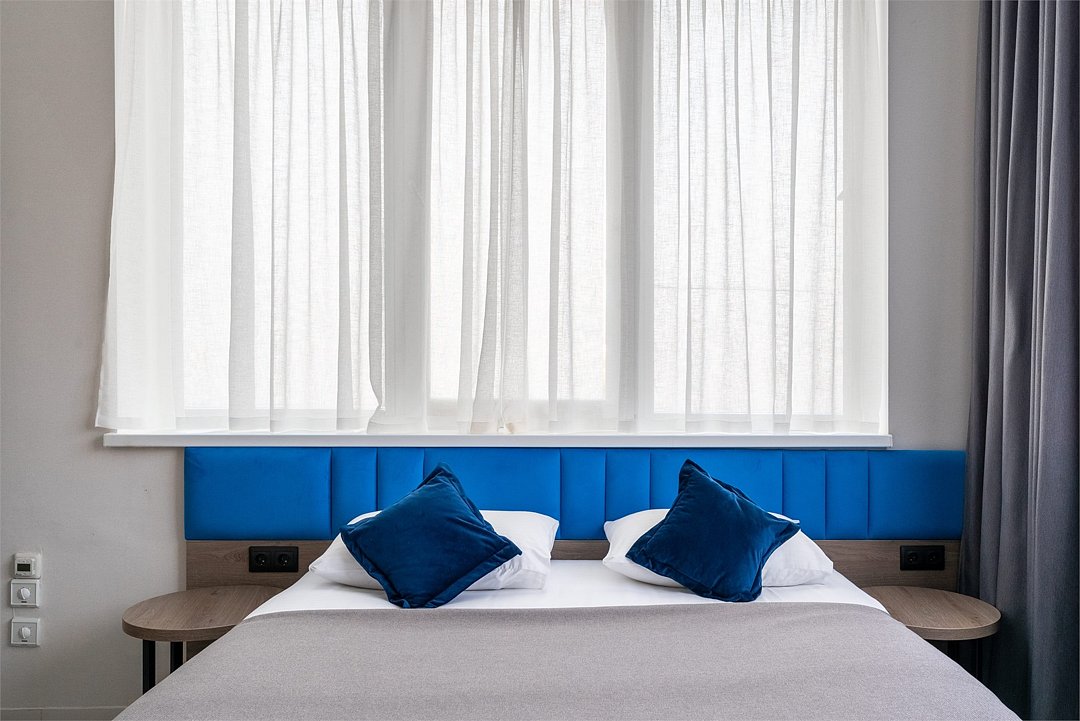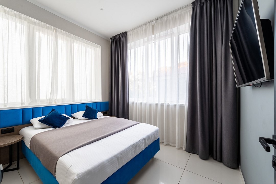 Четырехэтажный корпус отеля занимает охраняемую благоустроенную территорию. Жилой фонд, способный разместить более 150 человек, предлагает отдыхающим комфортабельных номеров различных ценовых категорий комфорта: стандартные номера, просторные апартаменты с кухней, комнаты для маломобильных гостей. Во всех номерах стильный приятный интерьер, есть балкончики с видом на море.