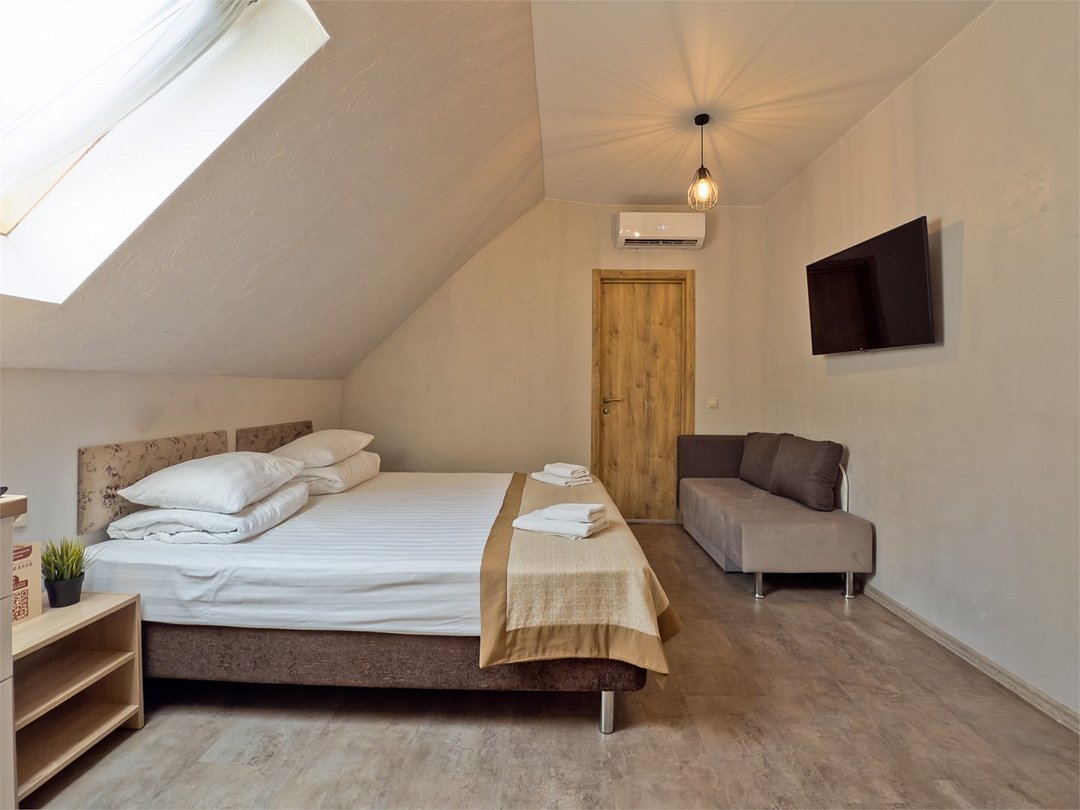 Номер категории Стандарт мансардный предназначен для комфортного проживания одного, двух или трех человек. В каждом номере две раздельные односпальные кровати или одна двуспальная кровать. Дополнительное место - раскладной диван. Номер в современном стиле. Мансардные окна. Небольшой кухонный уголок с раковиной, микроволновой печью, минибаром, чайником, набором для чая. Рабочая зона, стулья, кресло, журнальный столик, тумбы, шкаф для одежды, багажная полка. Для безопасности - сейф и система пожаротушения. Система климат-контроля позволит поддерживать комфортную температуру, а отопление позволит согреться в холодное время. Для вашего комфортного пребывания в каждом номере есть дополнительные удобства: набор махровых полотенец, фен, тапочки, зубной набор и другие гигиенические принадлежности.Услуги и удобства