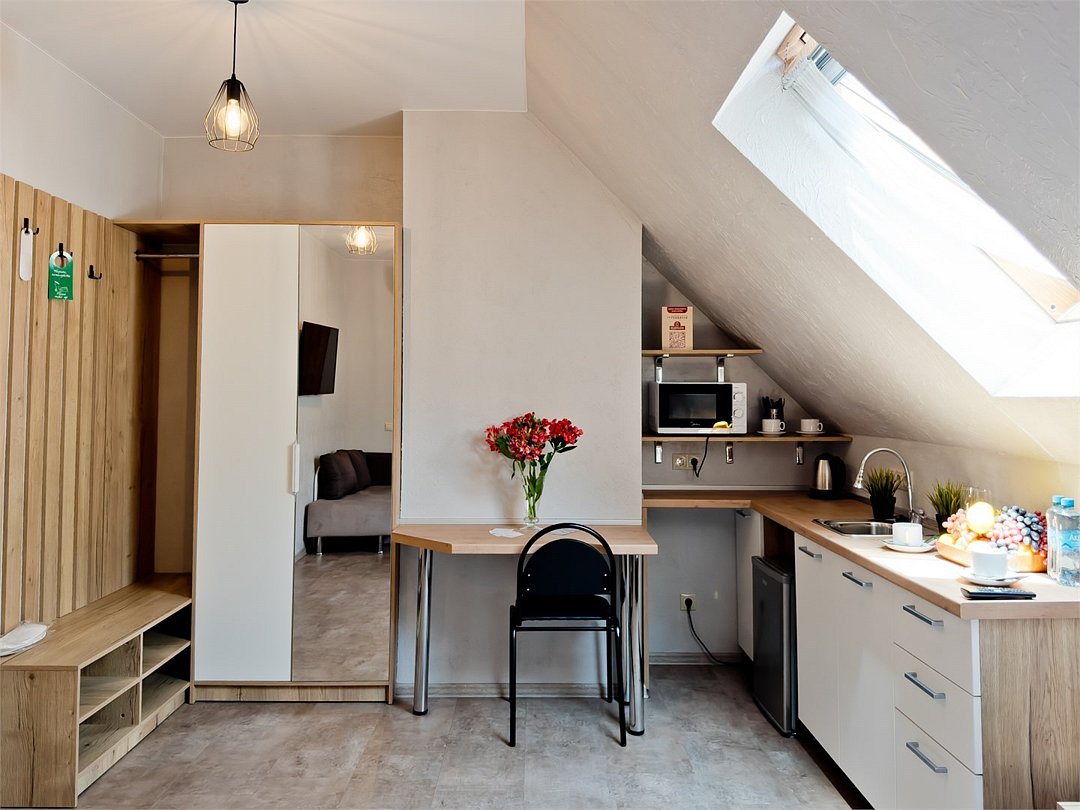 Одноместный уютный номер в стиле лофт. Односпальная кровать, шкаф, рабочее место, стул, журнальный столик. Оборудован кухонным уголком: раковина, минибар, чайник, СВЧ, стиральная машинка, посуда. Без балкона. Окно мансардное, вид на крыши и небо. Кондиционер, сейф. Ванная с душевой кабиной. Фен, косметическое зеркалоУслуги и удобства