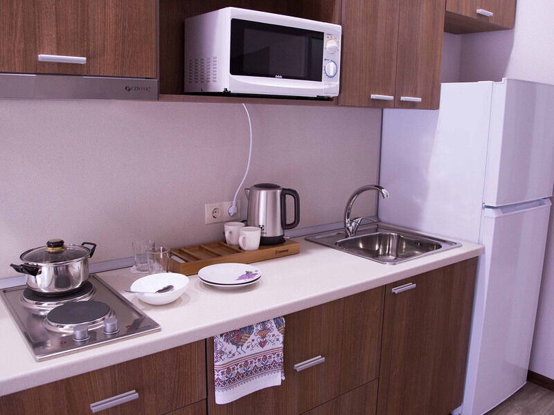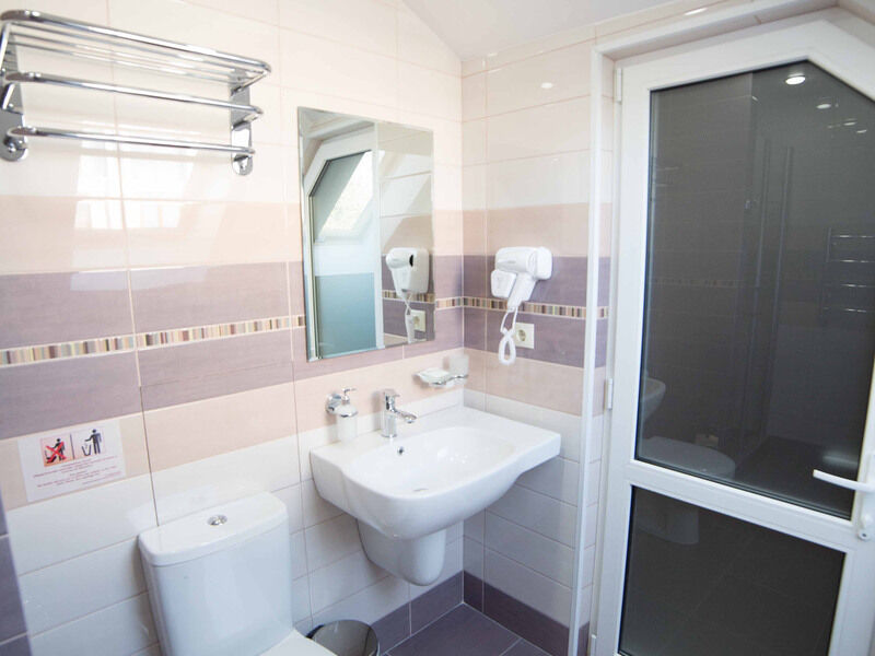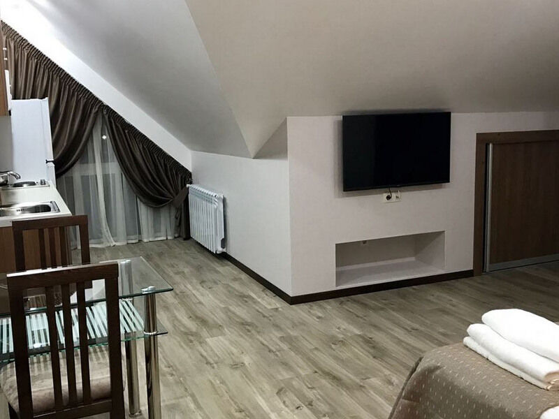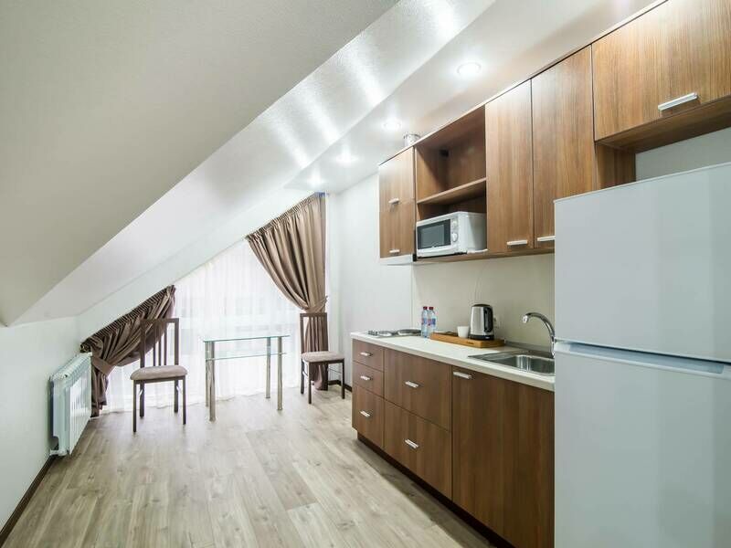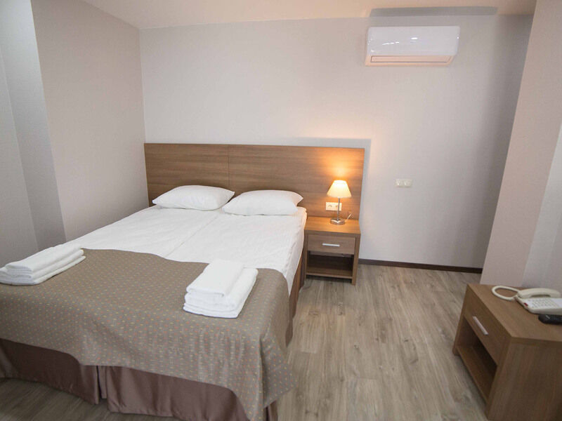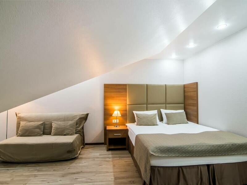 Трехэтажный корпус отеля с мансардой занимает небольшую закрытую территорию площадью 1100 кв.м. Гостиница предлагает отдыхающим номера Стандарт и двухместные Апартаменты с кухней. Лаконичные интерьеры номеров выдержаны в пастельной гамме.