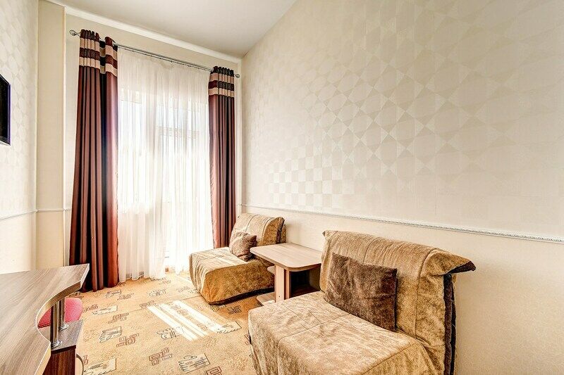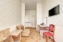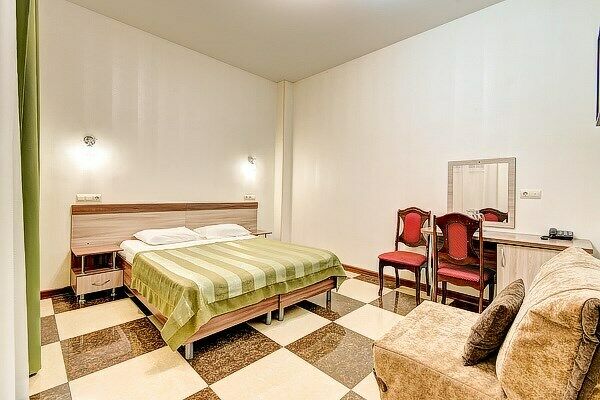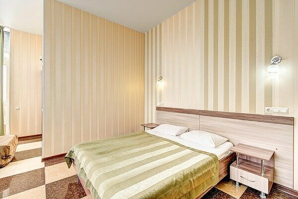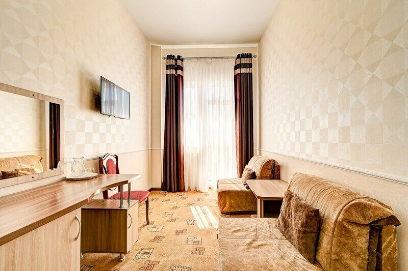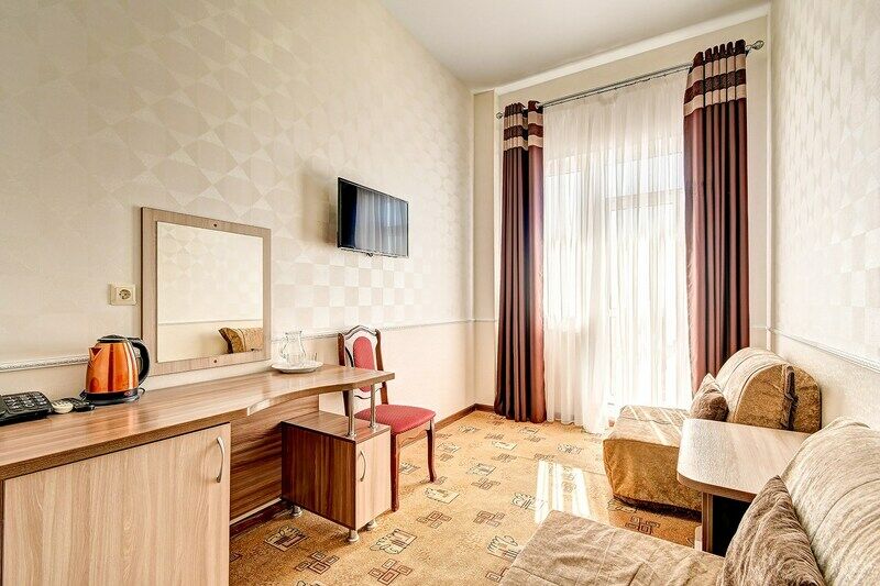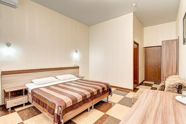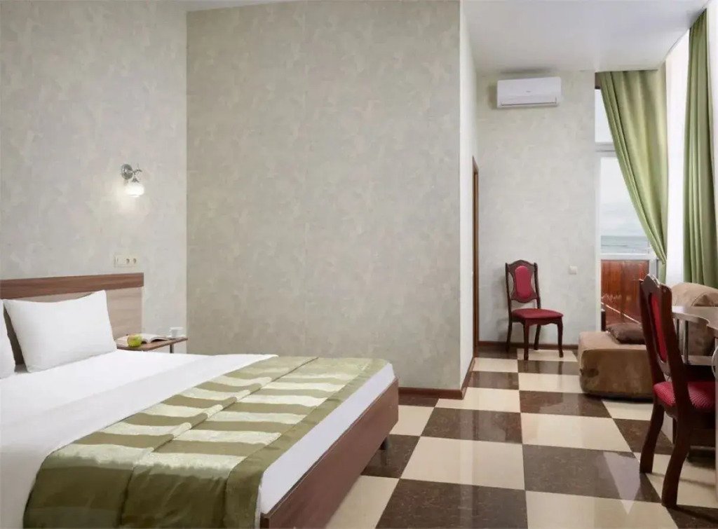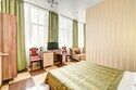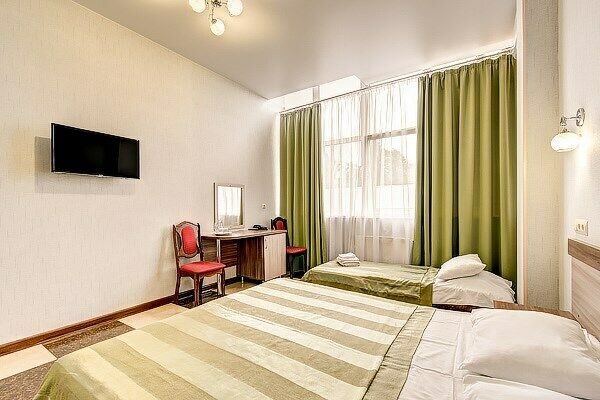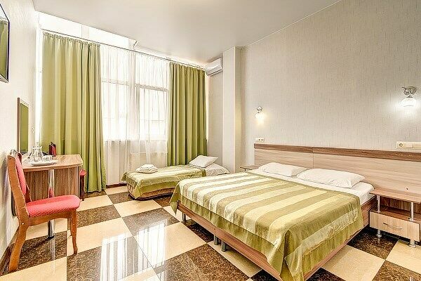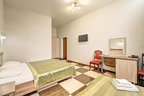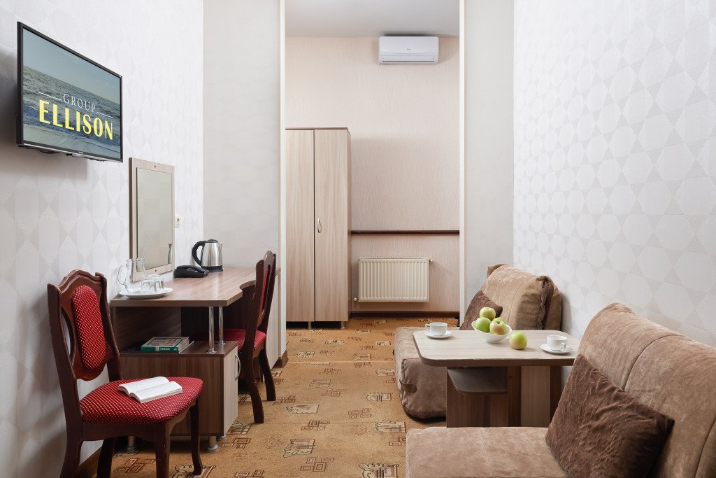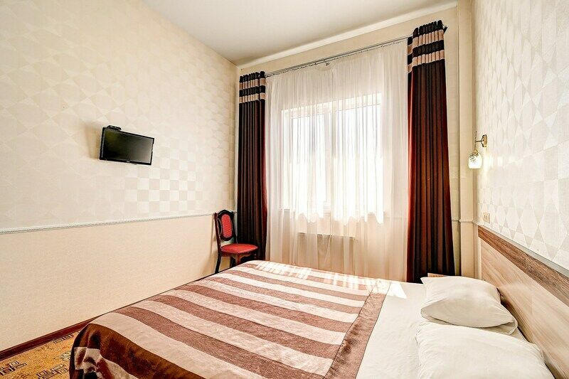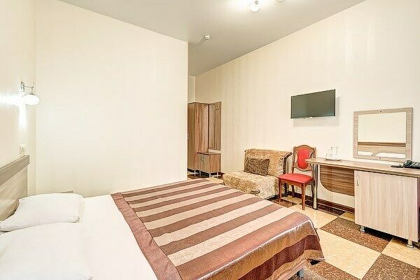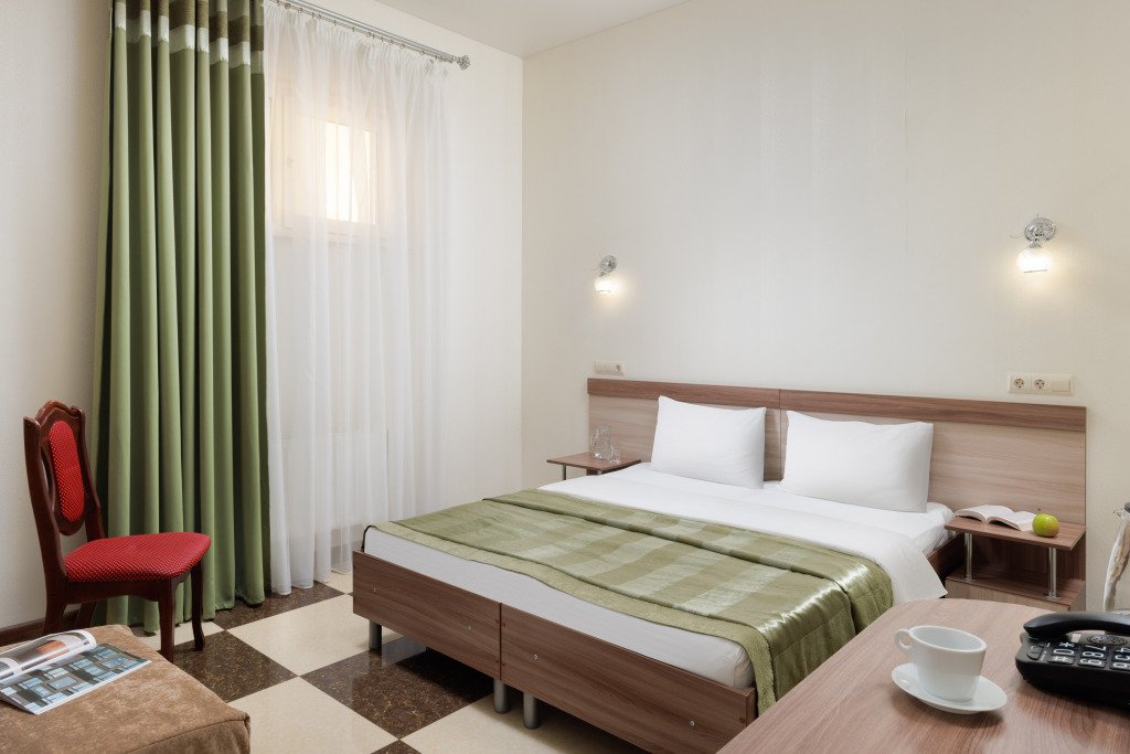 Небольшой бюджетный номер для одного-двух гостей с одной двуспальной кроватью или двумя односпальными. В номерах установлены кондиционер, телевизор, холодильник. В стоимость номера также входит набор косметических принадлежностей.