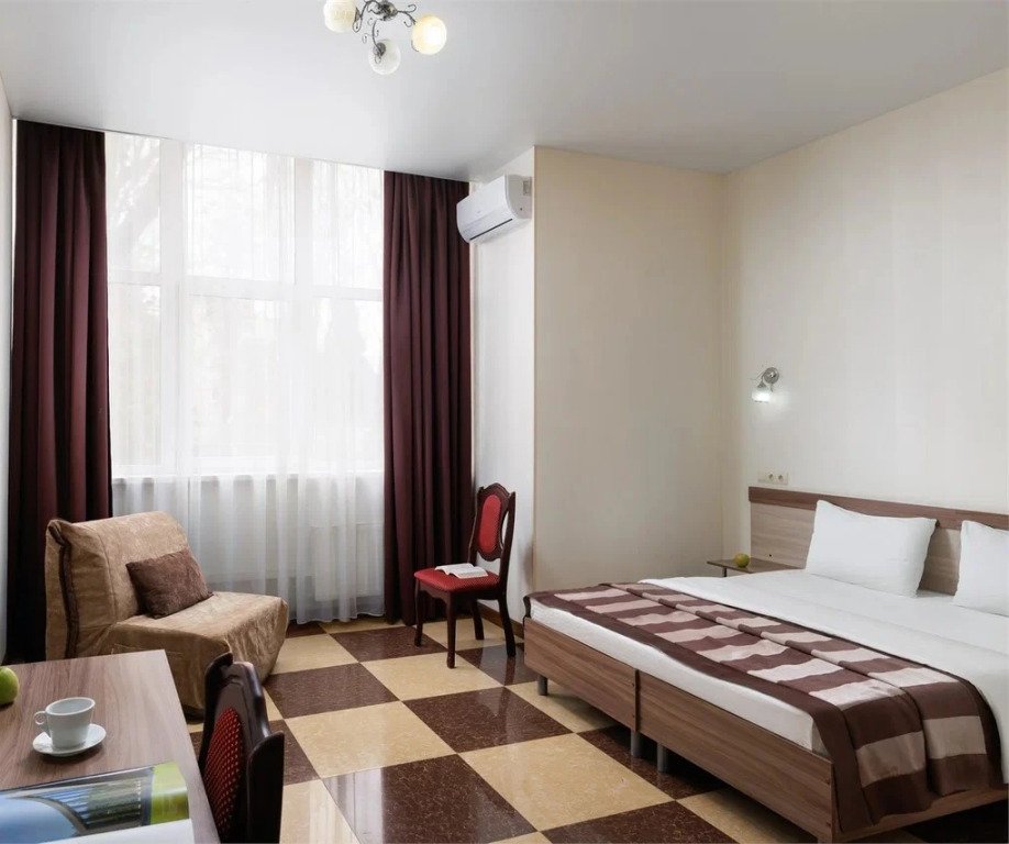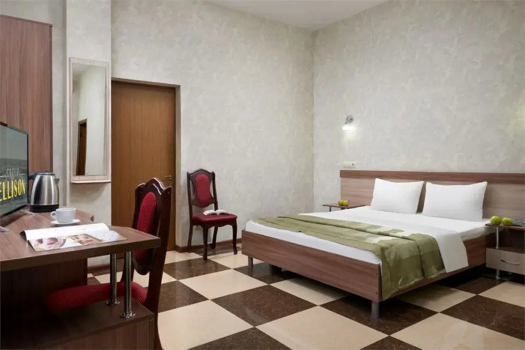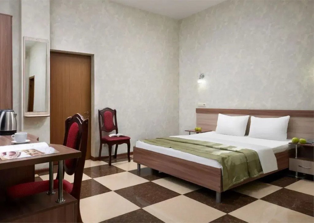 2-х местный номер для одного-двух гостей с одной двуспальной кроватью . В номерах установлены кондиционер, телевизор, холодильник. В стоимость номера также входит набор косметических принадлежностей.