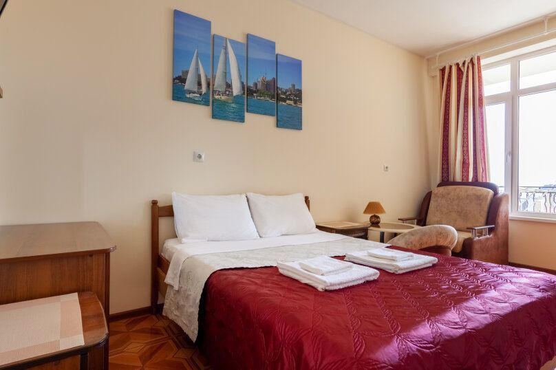 Номер оснащён удобной двуспальной кроватью, прикроватными тумбочками, пуфами, столиком, электронным сейфом и сплит-системой.