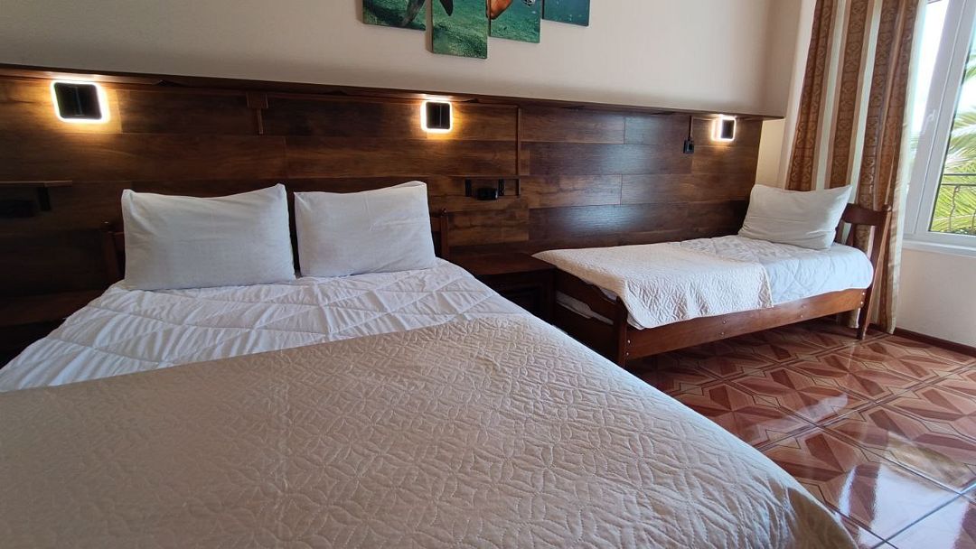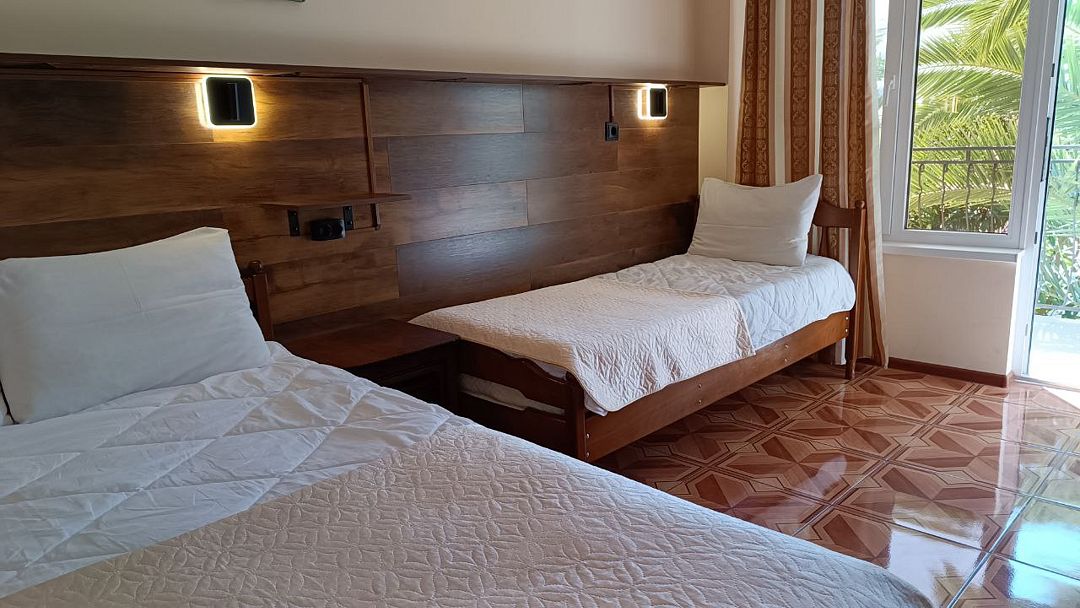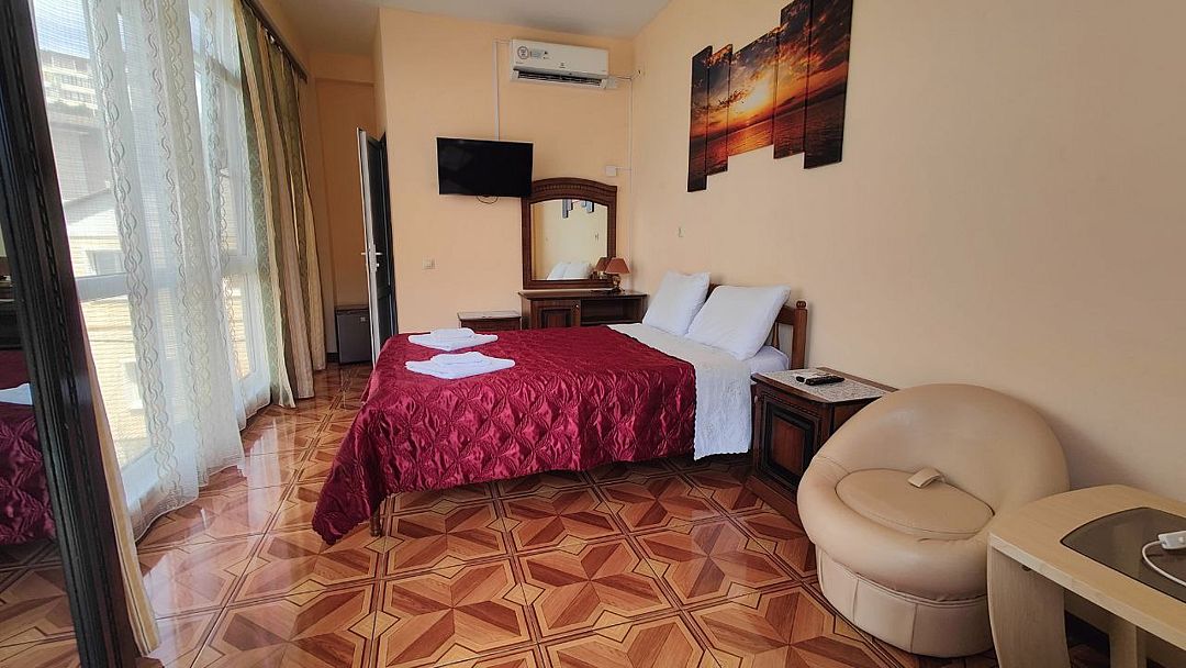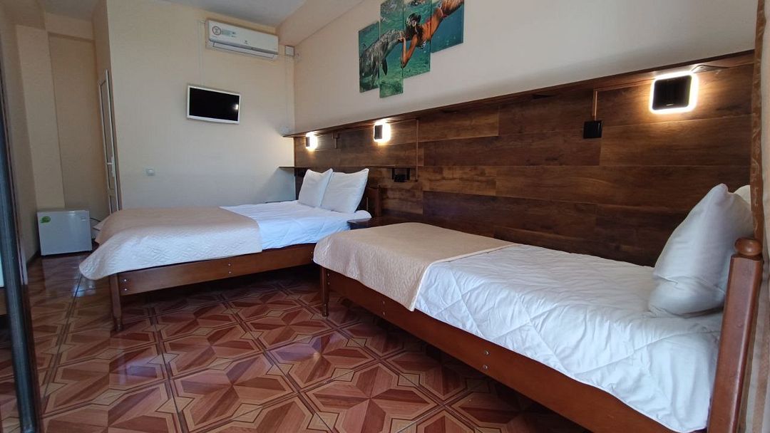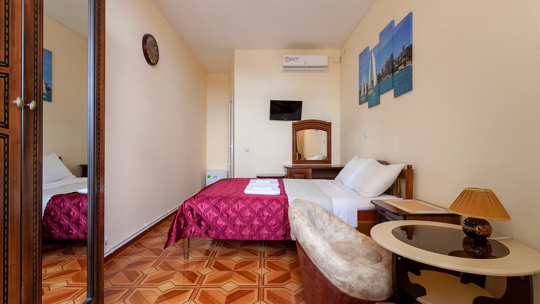 Номер оснащён удобной двуспальной и односпальной кроватью, прикроватными тумбочками, пуфами, столиком, электронным сейфом и сплит-системой.