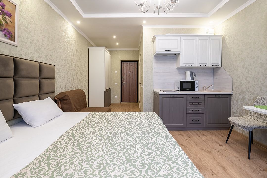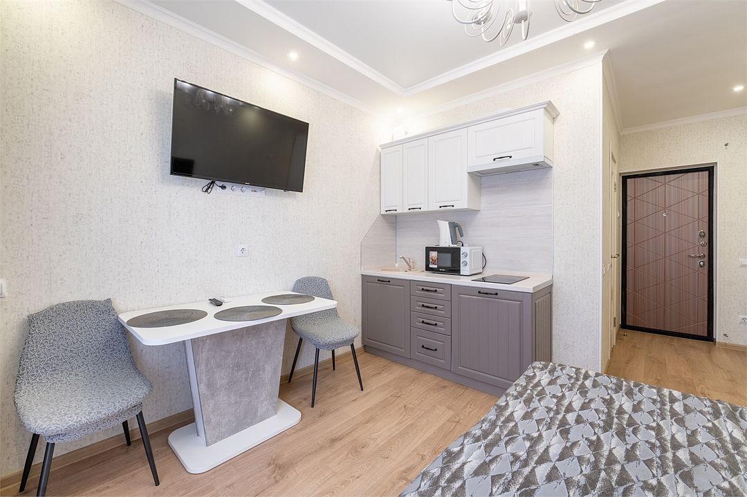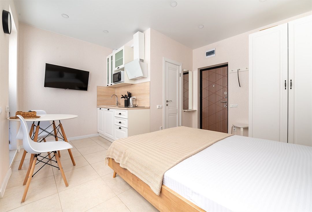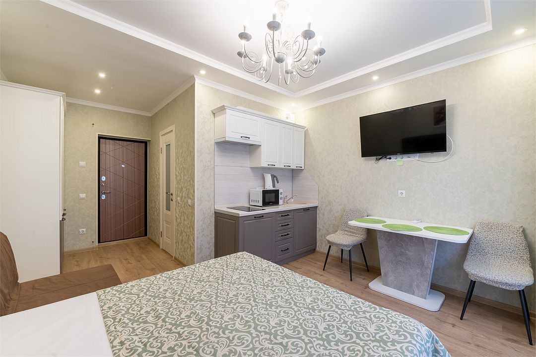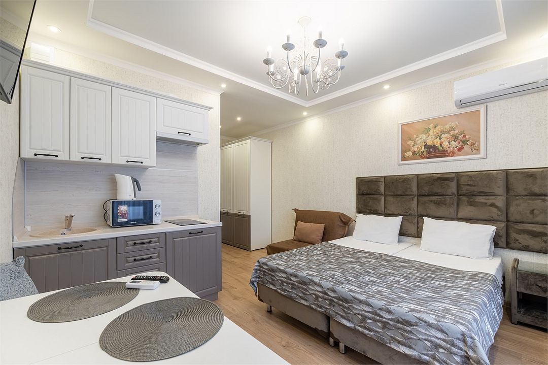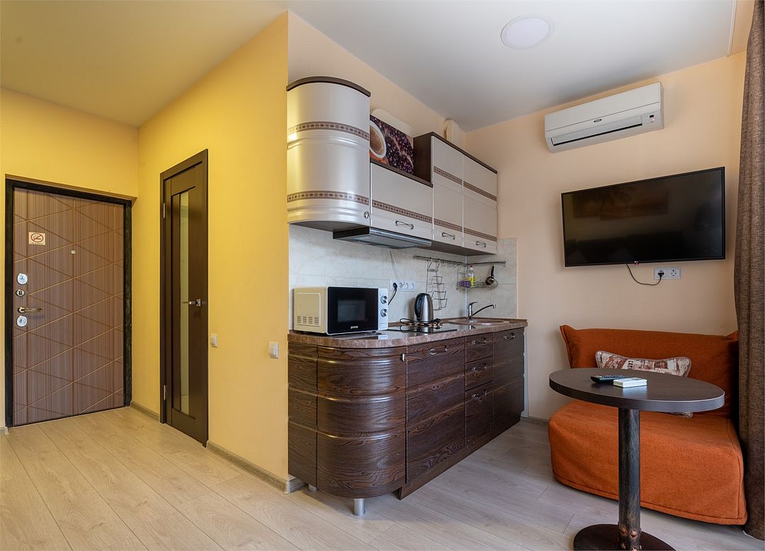 телевизор, кабельное телевидение, холодильник, плита для приготовления пищи, микроволновая печь, ванна или душевая кабина, шкаф для одежды, вешалки, зеркало, кухня, набор посуды, обслуживание номеров, сейф, чайник, мягкая мебель, вид во двор, стаканы, кухонная утварь, столовые приборы, стол, туалет, сплит-система, диван-кровать, номер для некурящихВ гостиничном номере