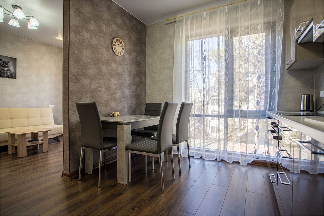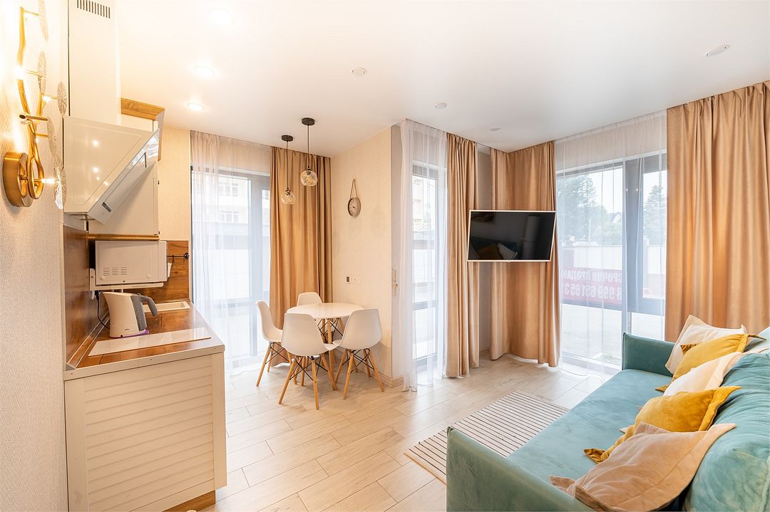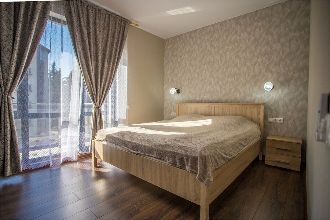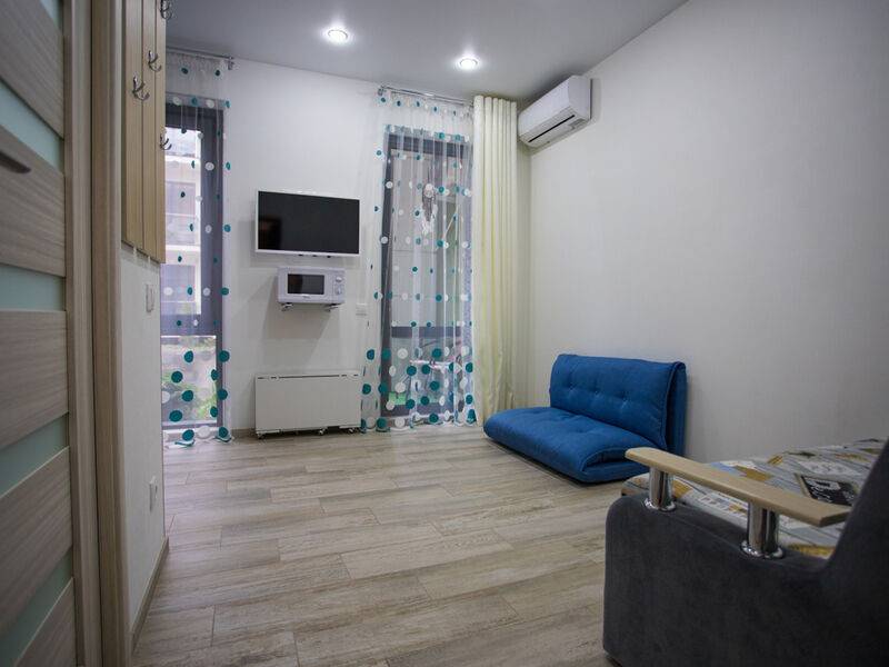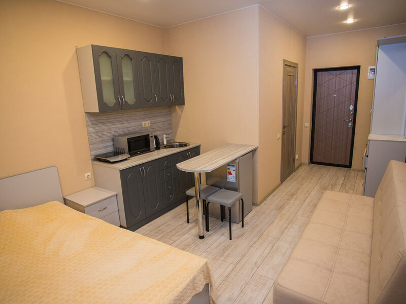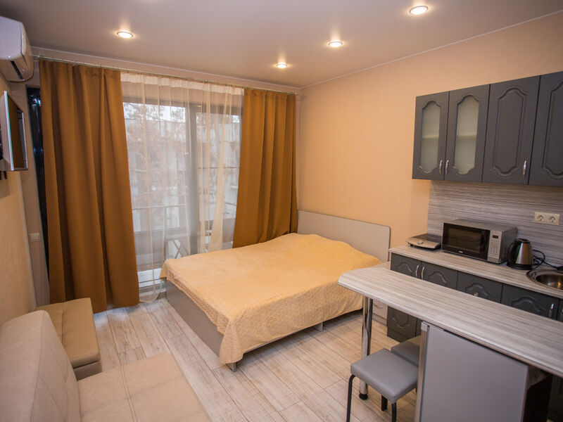 4-х местный номер, 35 кв. м. В каждом номере есть балкон, кухня, чайник, плита, холодильник, стиральная машина, посуда, сплит-система, утюг, фен.Услуги и удобства
