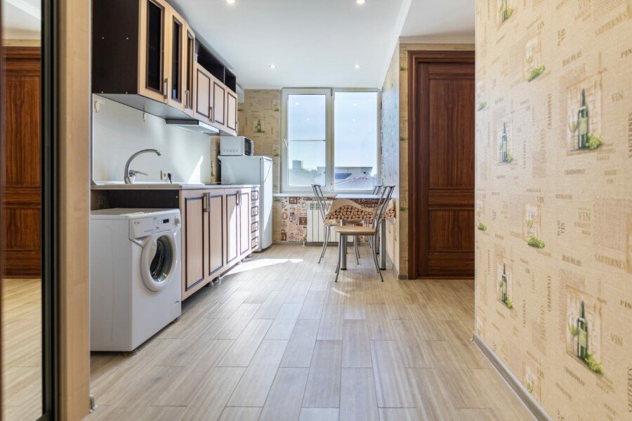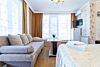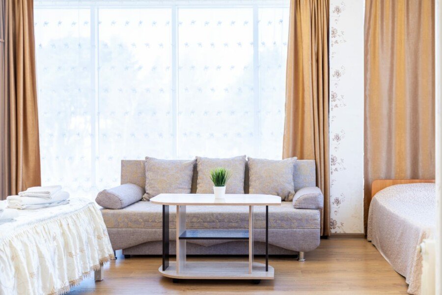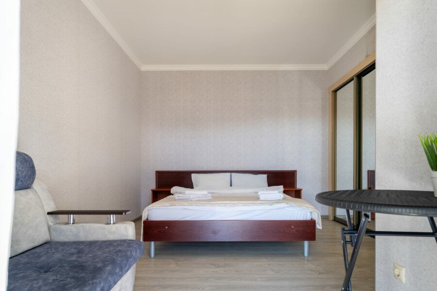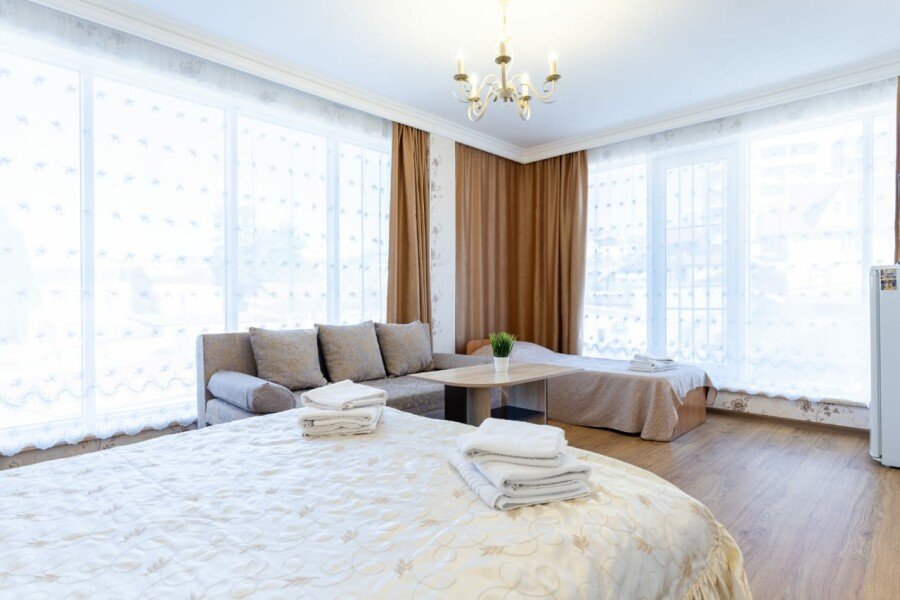 Семейный комфорт от 1 до 5 гостей, двуспальная кровать, диван, окна панорамные, вид на город.