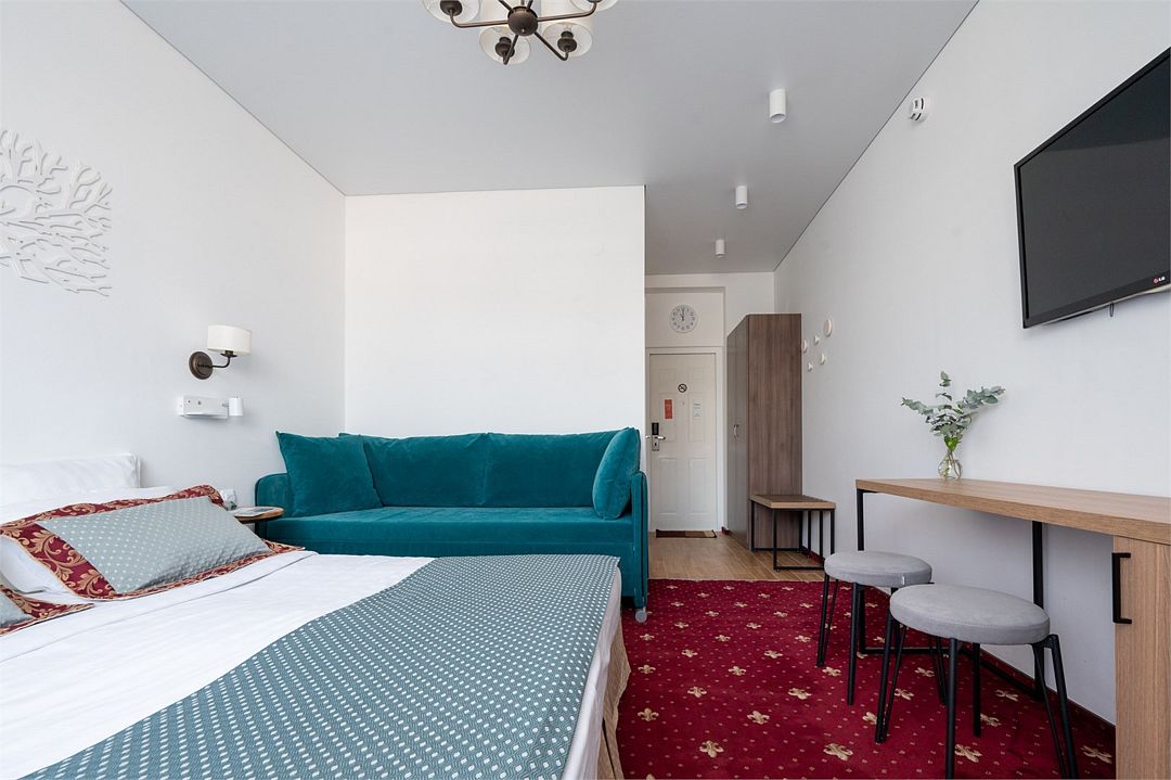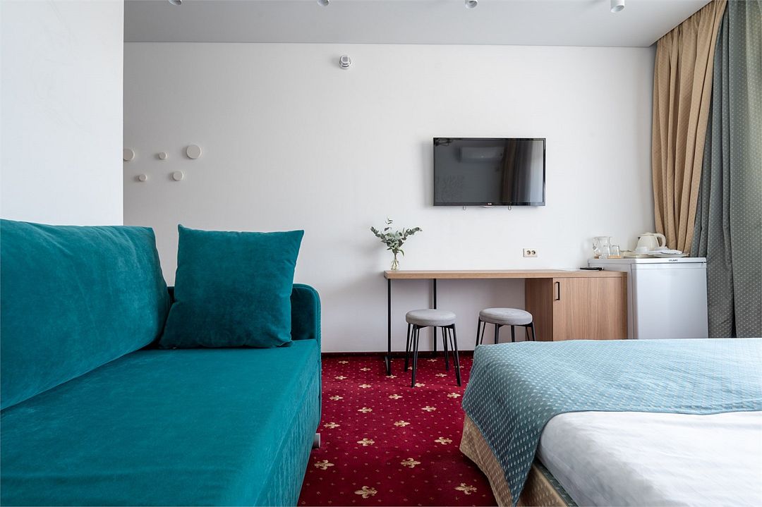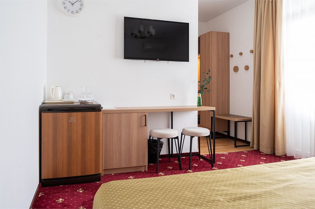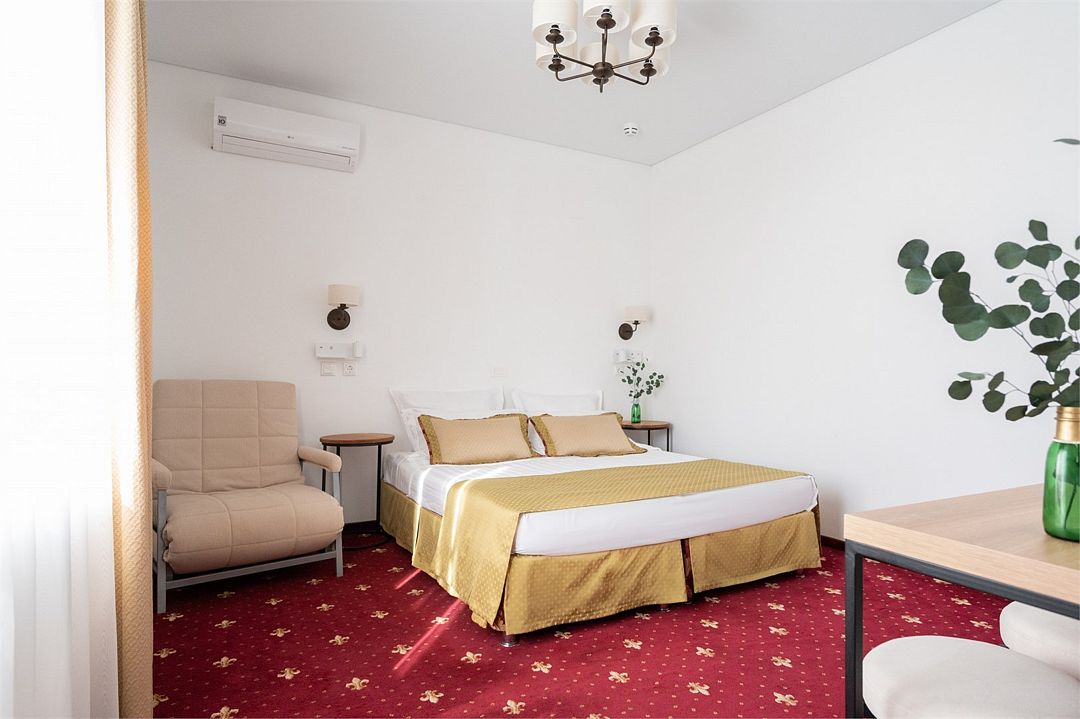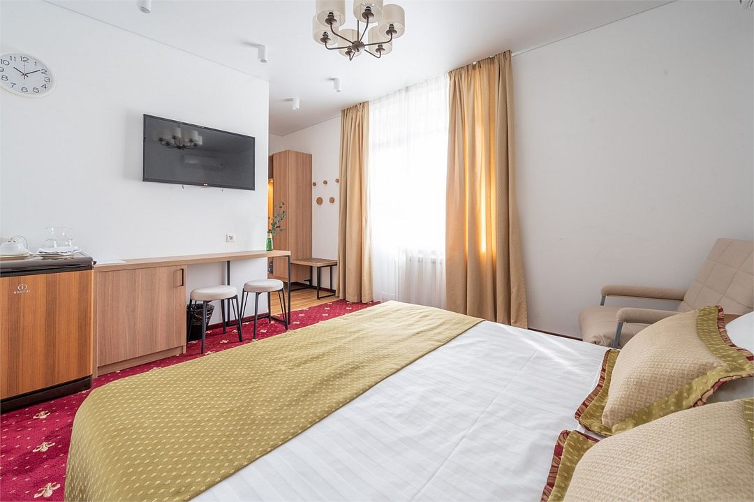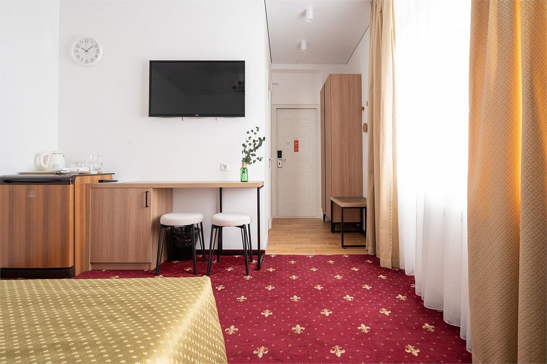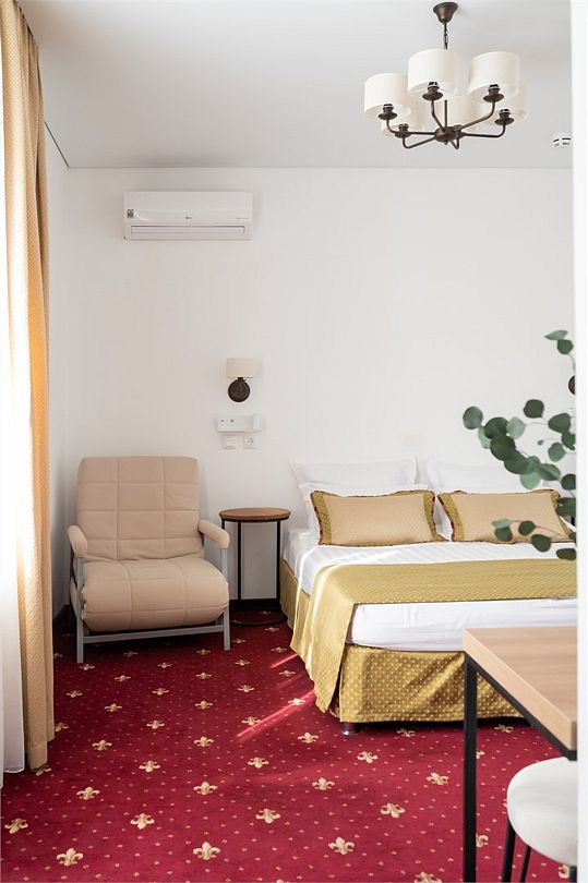 Стандартный номер расположен на первом этаже главного корпуса Отеля. По комфорту и оснащению все категории одинаковые, однако стандарт не имеет балкона. Площадь номера 20м2, имеется Сплит система, отопление, плоский 46” телевизор с выходом в интернет, холодильник, сейф для ноутбука, чайник, бесконтактная зарядка для телефона, зонируемое освещение, проходные выключатели, санузел со всеми удобствами, фен, полотенцесушитель, зеркало с подсветкой, а также мыльные принадлежности. В номере имеется набор посуды, одноразовые тапочки и пожарная сигнализация. Номер исключительно для не курящих. Если вы курите, на территории отеля имеется специальное для этого место. Номер рассчитан на: 2 человека, но благодаря современному дивану-трансформеру, возможно проживание до 4-х человек.Услуги и удобства