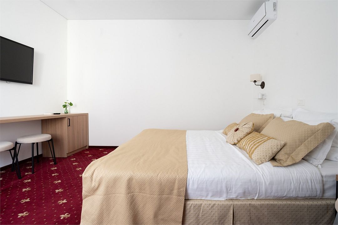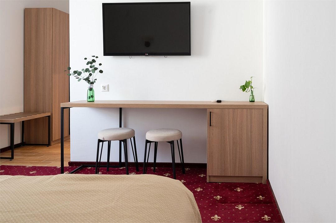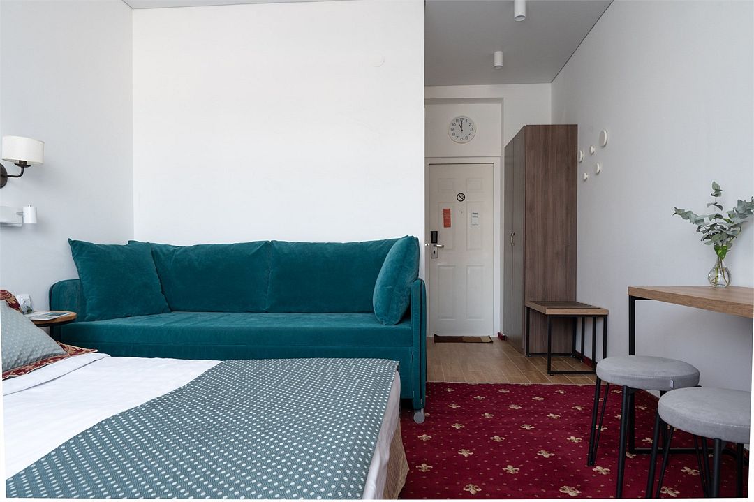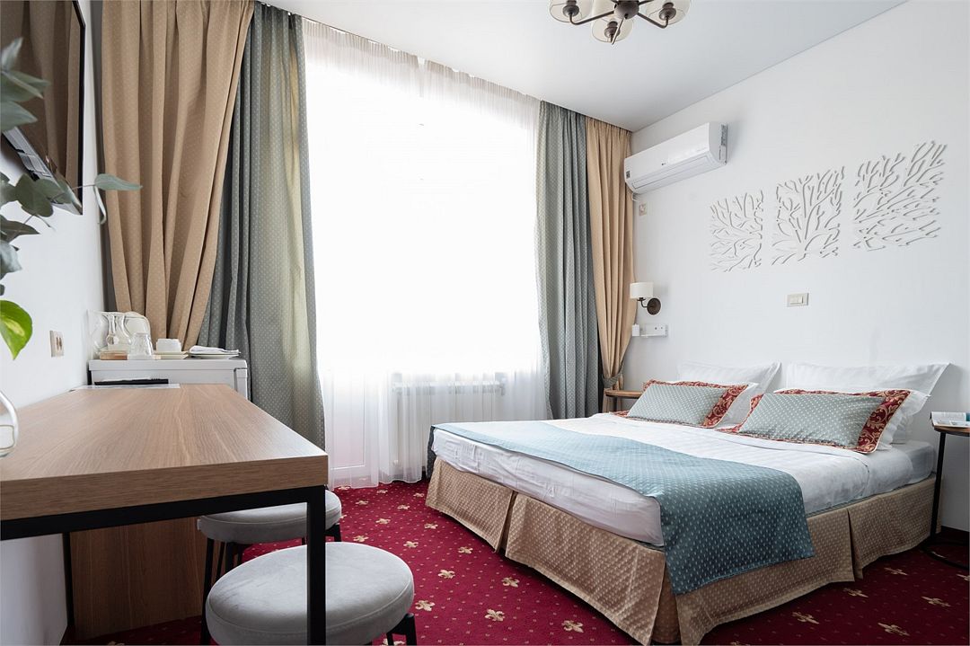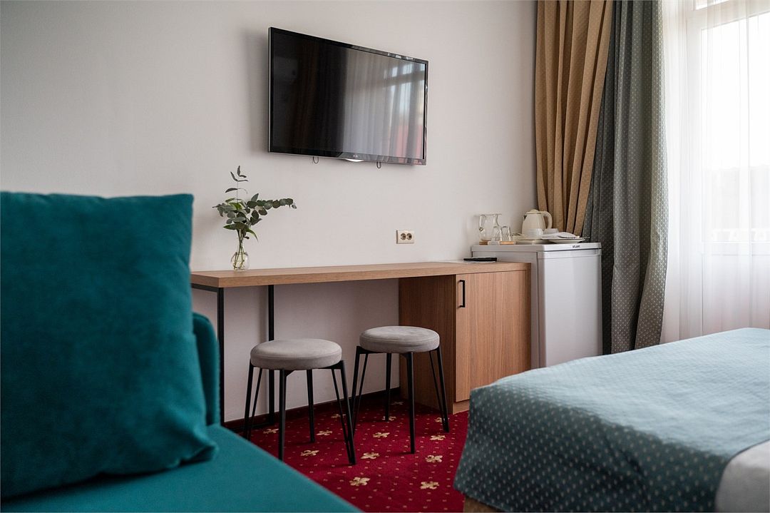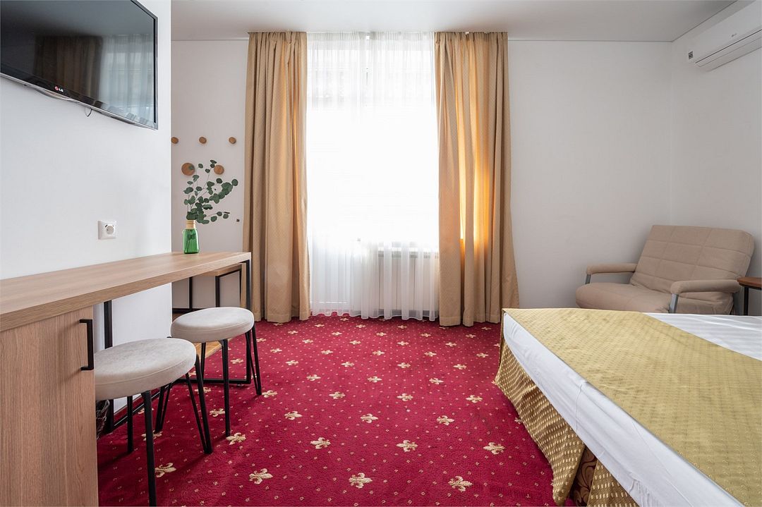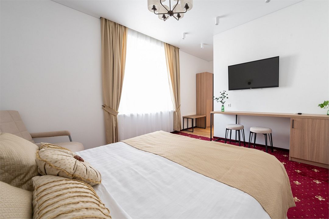 Стандартный номер расположен на первом этаже главного корпуса Отеля. По комфорту и оснащению все категории одинаковые, однако стандарт не имеет балкона. Площадь номера 20м2, имеется Сплит система, отопление, плоский 46” телевизор с выходом в интернет, холодильник, сейф для ноутбука, чайник, бесконтактная зарядка для телефона, зонируемое освещение, проходные выключатели, санузел со всеми удобствами, фен, полотенцесушитель, зеркало с подсветкой, а также мыльные принадлежности. В номере имеется набор посуды, одноразовые тапочки и пожарная сигнализация. Номер исключительно для не курящих. Если вы курите, на территории отеля имеется специальное для этого место. Номер рассчитан на: 2 человека, но благодаря современному дивану-трансформеру, возможно проживание до 4-х человек.Услуги и удобства