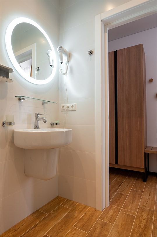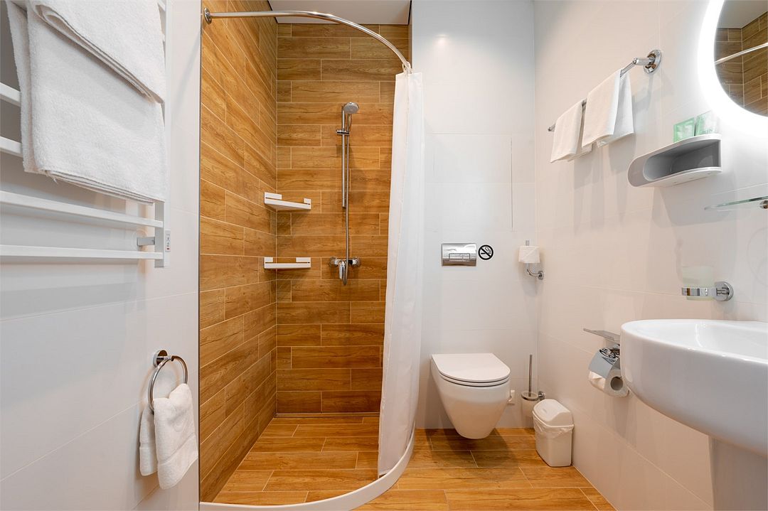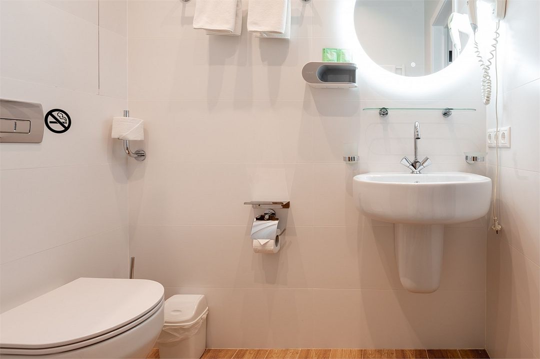 Номер комфорт расположен на втором и третьем этажах корпуса отеля. Площадь этой категории 20м2. Планировка и оснащение одинаковые со стандартной категорией, однако здесь имеется балкон с видом на окрестности, столик и стульчики, а также сушка для вещей. Номер оснащен сплит системой, отоплением, плоским 46” телевизором с выходом в интернет, холодильником, сейфом для ноутбука, чайником, бесконтактной зарядкой для телефона, установлено зонируемое освещение, проходные выключатели, набор посуды, одноразовые тапочки и пожарная сигнализация. Номер исключительно для не курящих. Если вы курите, на территории отеля имеется специальное для этого место. Санузел со всеми удобствами - фен, полотенцесушитель, зеркало с подсветкой, а также мыльные принадлежности.Услуги и удобства