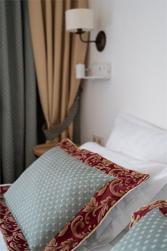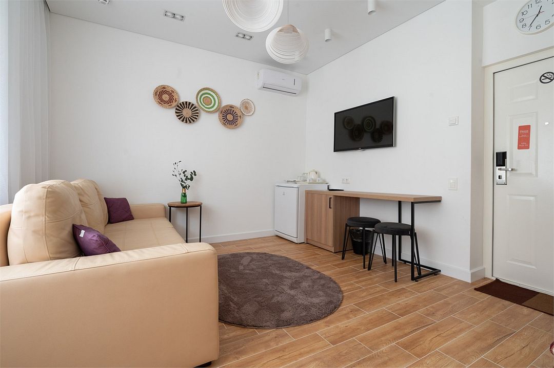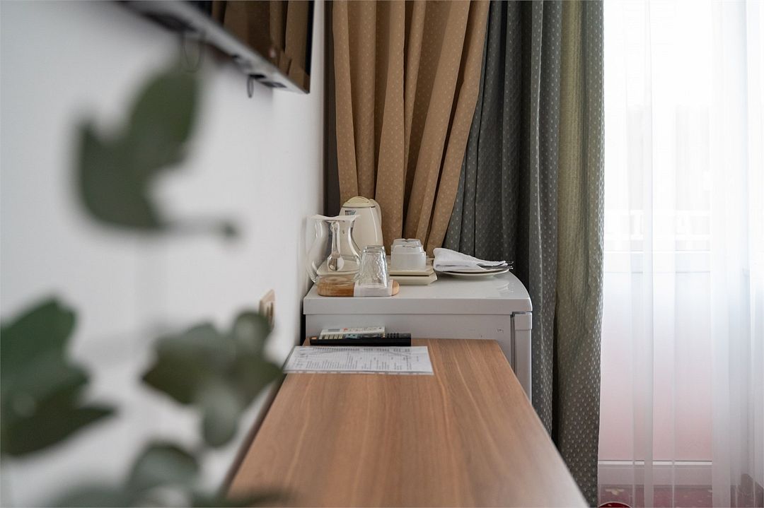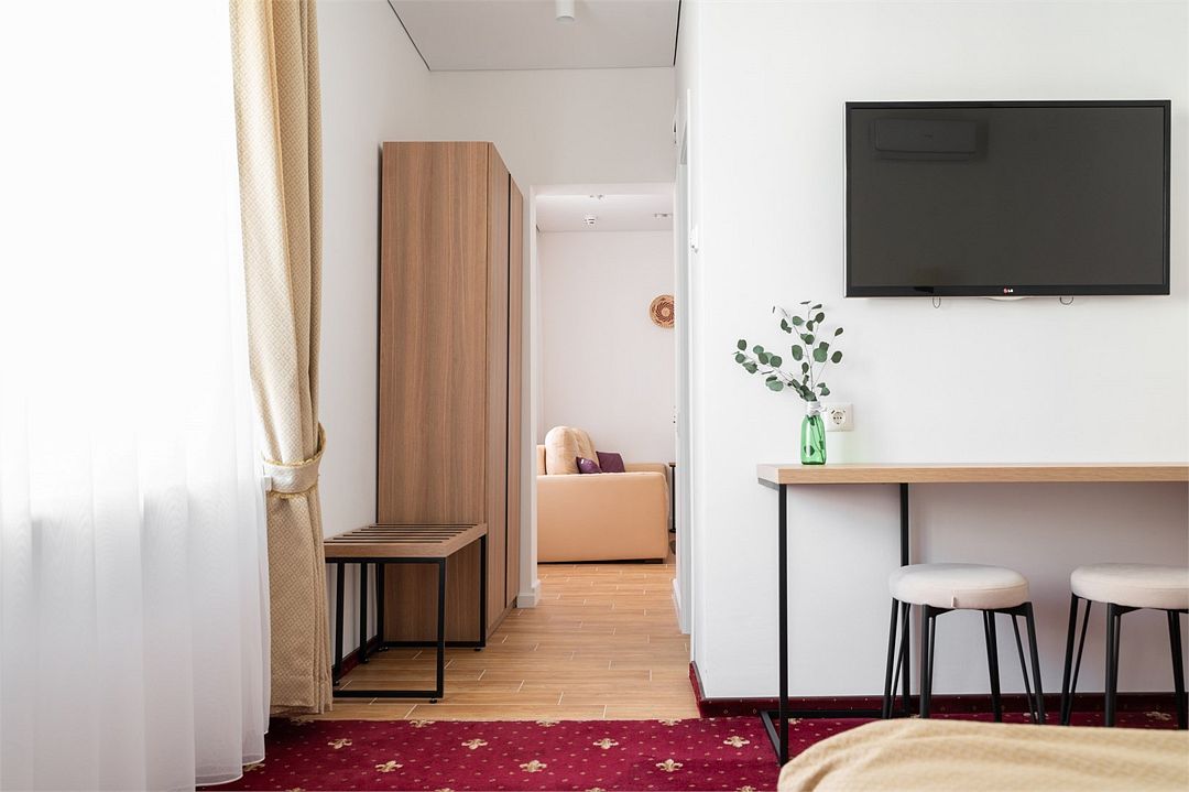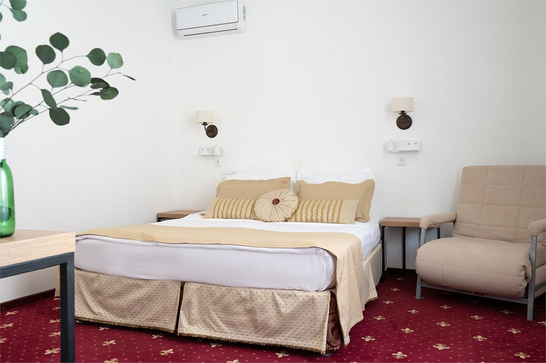 Комфорт+ расположен на втором и третьем этажах корпуса отеля. Такой категории номера всего 2. Они оснащены точно так же, как и категория комфорт, имеется сплит система, отопление, плоский 46” телевизор с выходом в интернет, холодильник, сейф для ноутбука, чайник, бесконтактная зарядка для телефона, зонируемое освещение, проходные выключатели, санузел со всеми удобствами, фен, полотенцесушитель, зеркало с подсветкой, а также мыльные принадлежности. В номере имеется набор посуды, одноразовые тапочки и пожарная сигнализация. Номер исключительно для не курящих. Если вы курите, на территории отеля имеется специальное для этого место. Главное отличие — это большой обособленный балкон с видом на зелень и сад. Также эта категория номеров имеет другую расстановку мебели.Услуги и удобства