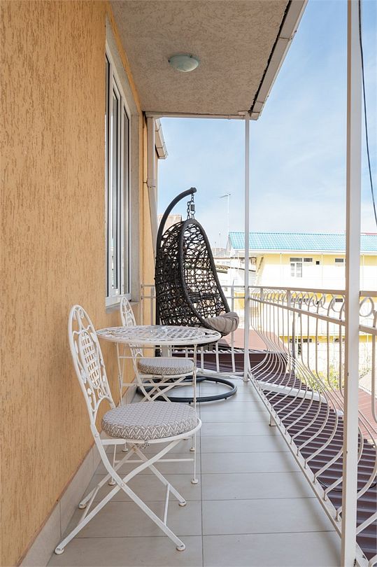 Общая площадь номера: ~36 кв.м. В номере имеется: совмещённый санузел с современной душевой кабиной, комфортабельная мебель, включая 2-х спальную кровать, раскладной кожанный диван и кресло. Также имеются: холодильник, 2 телевизора, сейф, обеденный стол, фен, электрический чайник, посуда, тапочки, сушилка для белья. Наличие кондиционера: имеется кондиционер (сплит-система) с ионизатором воздуха Наличие балкона: имеется отдельный изолированный балкон с мебелью. Выдача полотенец: полотенца выдаются. Этажность: номер расположен на 3-м этаже. Дополнительная информация: Номер состоит из 2-х комнат. Прекрасный интерьер. Метеллическая дверь, пластиковый стеклопакет.Услуги и удобства