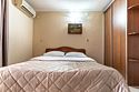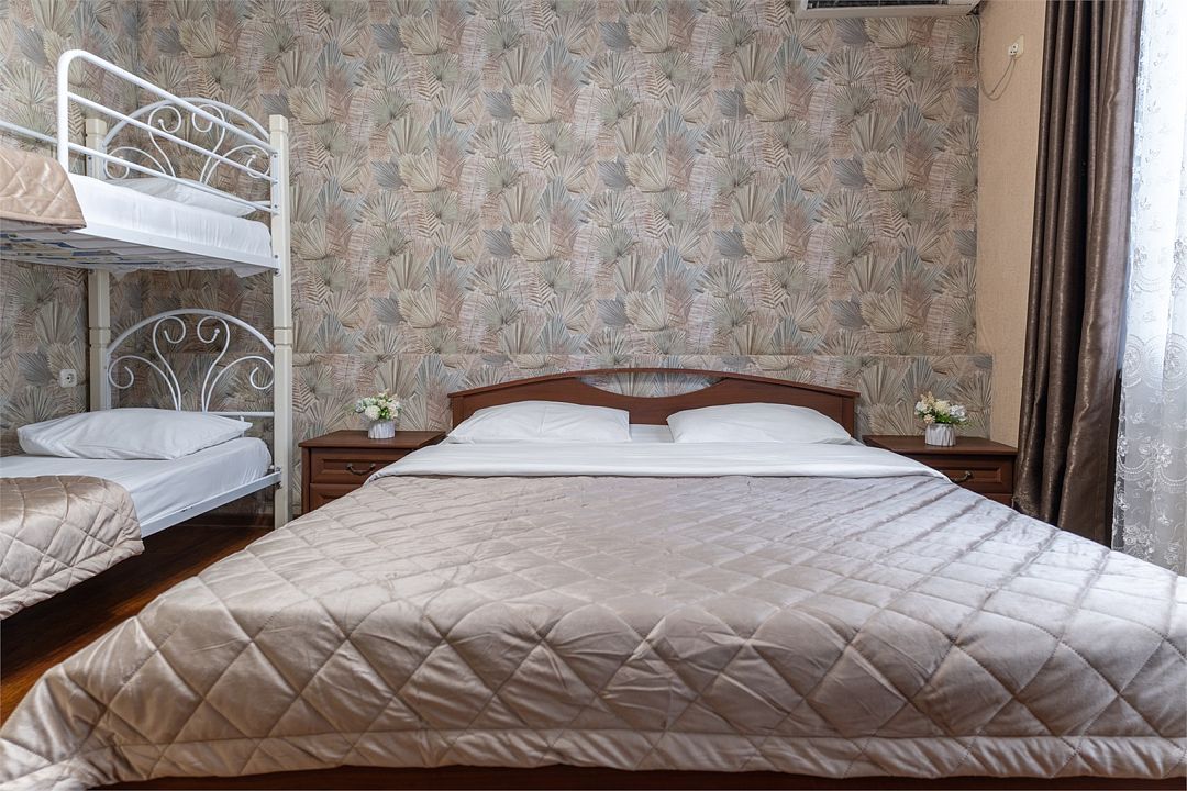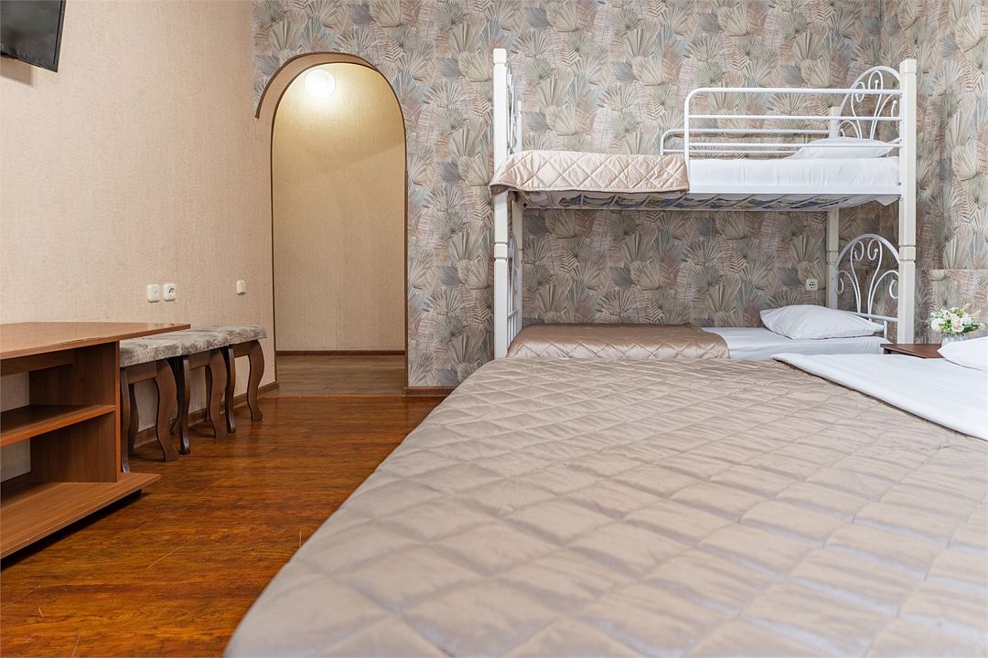 Уютный четырехместный номер с двуспальной кроватью, односпальной кроватью и креслом-кроватью, или двухспальной и двухъярусной кроватями. Номер оснащен шкафом для одежды, прикроватными тумбочками, журнальным столиком, зеркалом. Для комфортного отдыха в номере имеется: кондиционер, холодильник, телевизор, постельное белье, полотенца для лица, тела, ног. В зимнее время работает отопление.Услуги и удобства