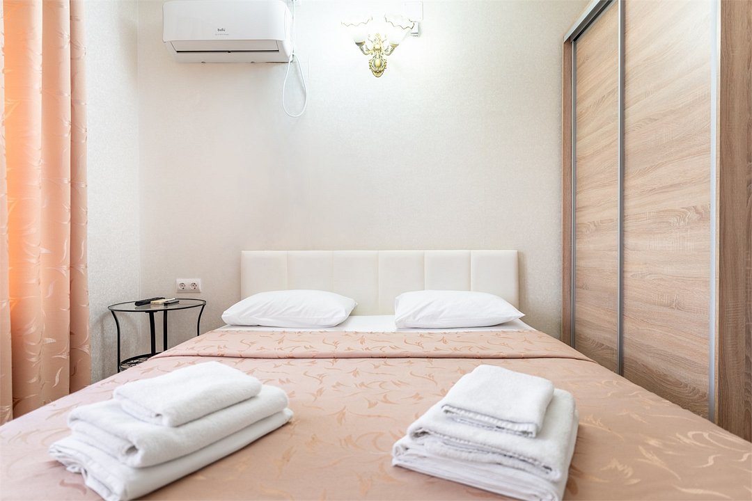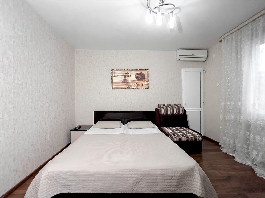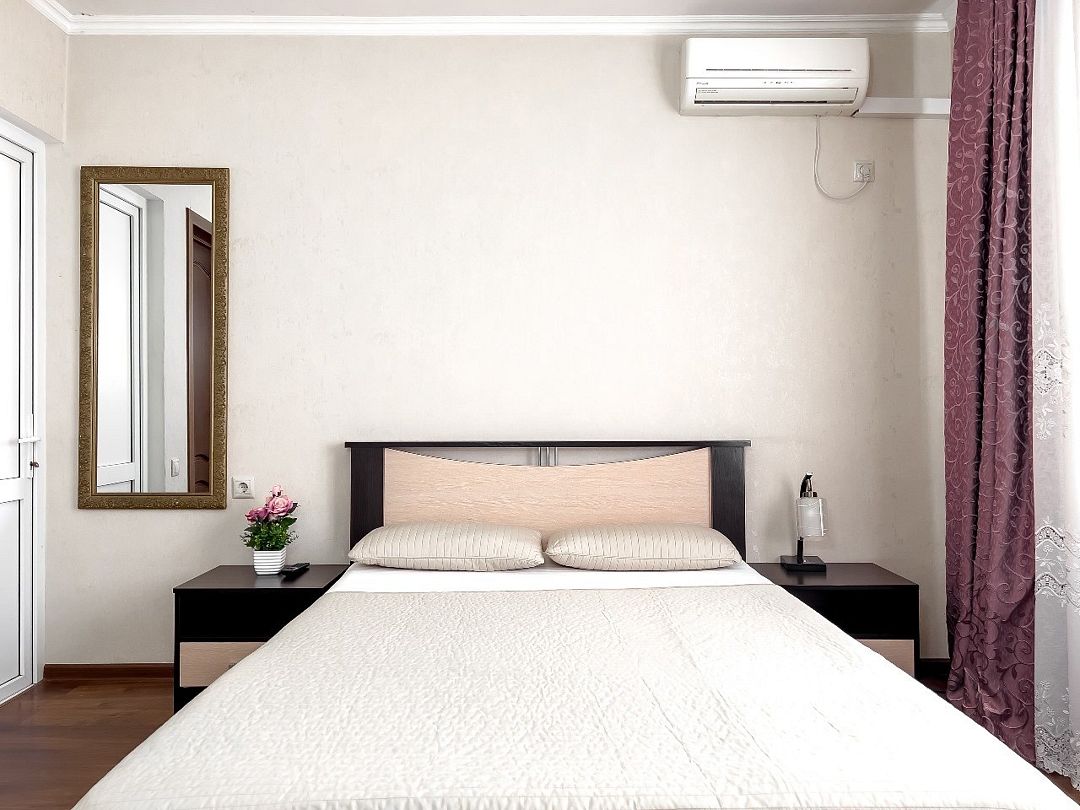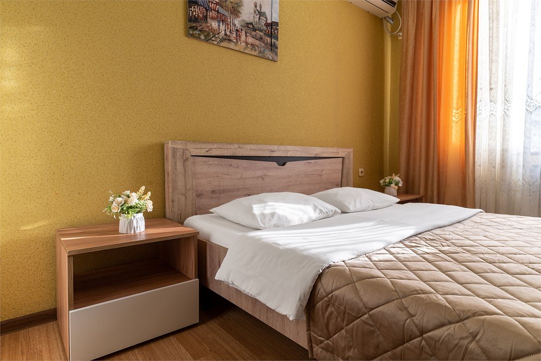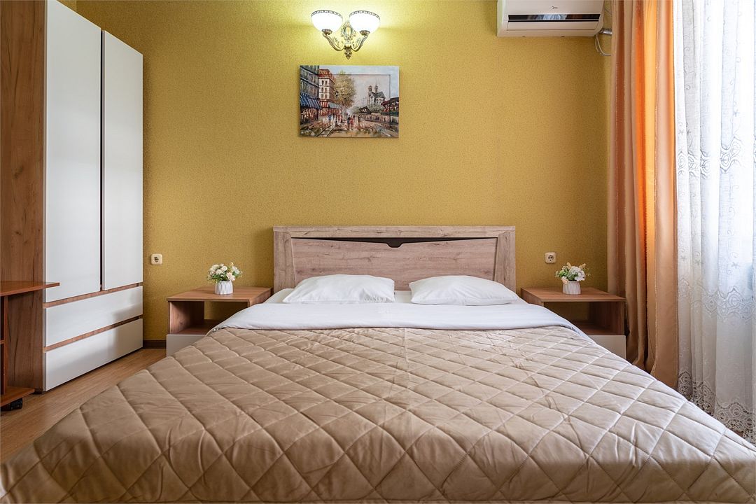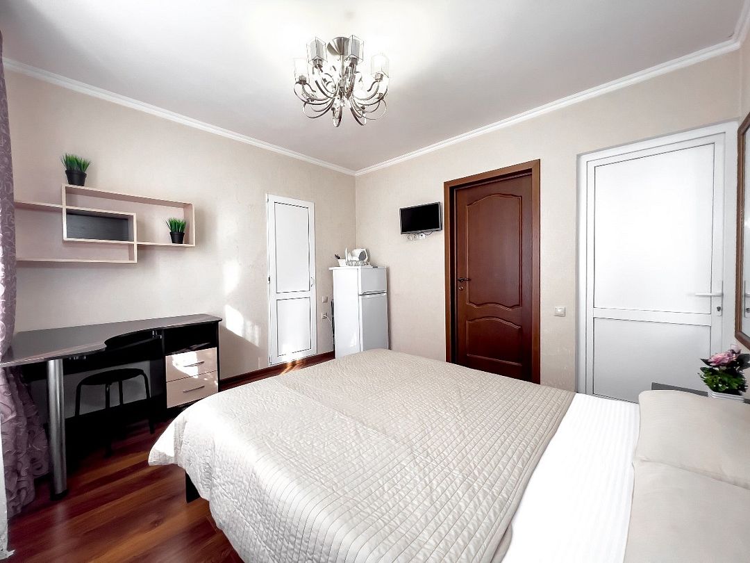 Уютные, комфортные апартаменты с 1 спальней, гостиной, кухней и террасой. В спальне двуспальная кровать, телевизор, кондиционер, шкаф-купе, выход на террасу, вид на улицу. В гостиной диван на 2 гостя, телевизор. Собственная ванная комната, кухня оборудованная холодильником, микроволновкой, чайником, плитой, набором посуды. Предоставляется комплект постельного белья, полотенец, фен. Заселение круглосуточное.Услуги и удобства