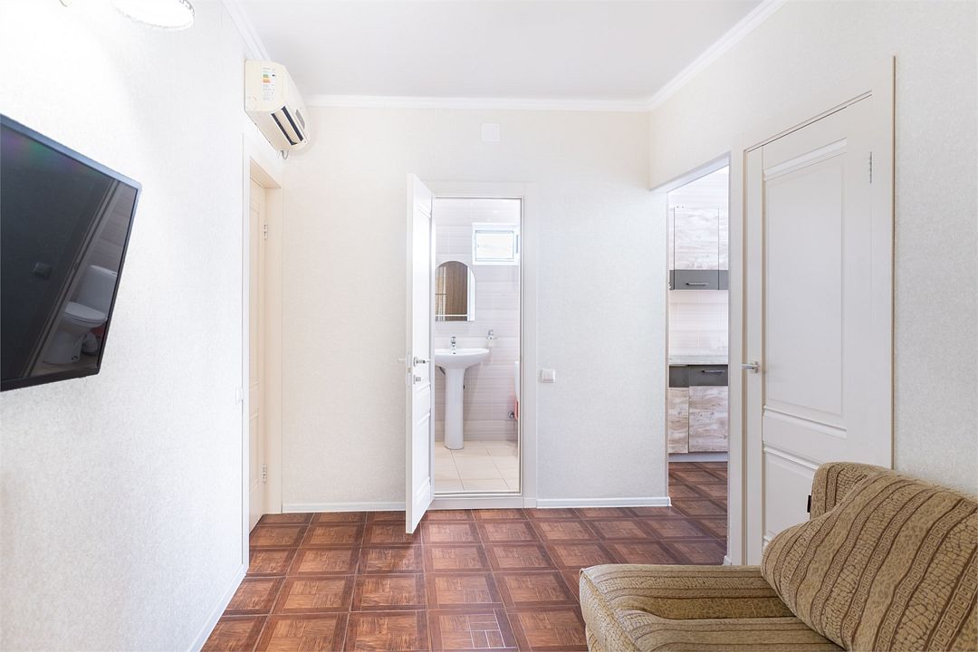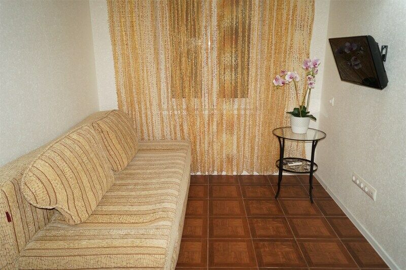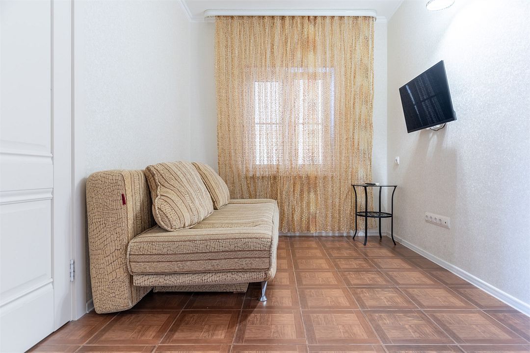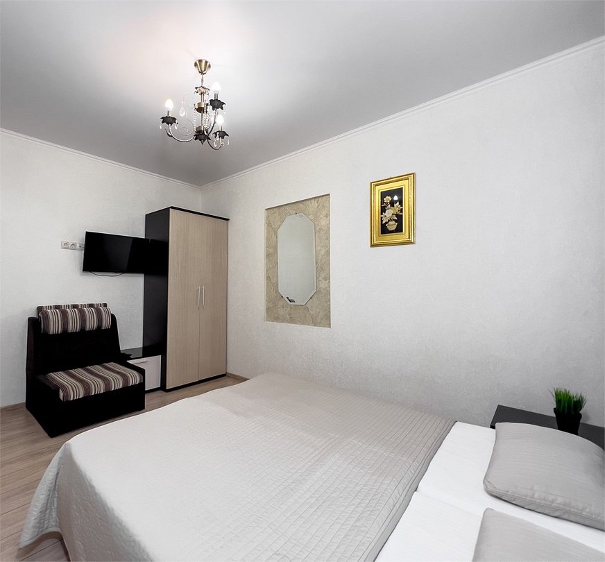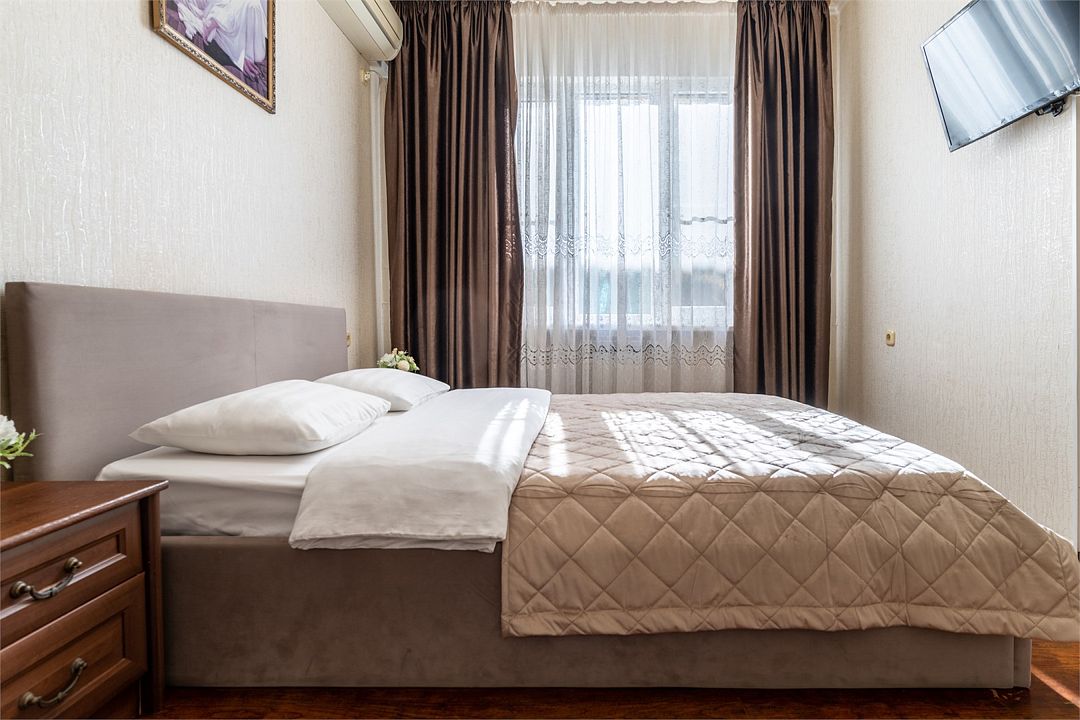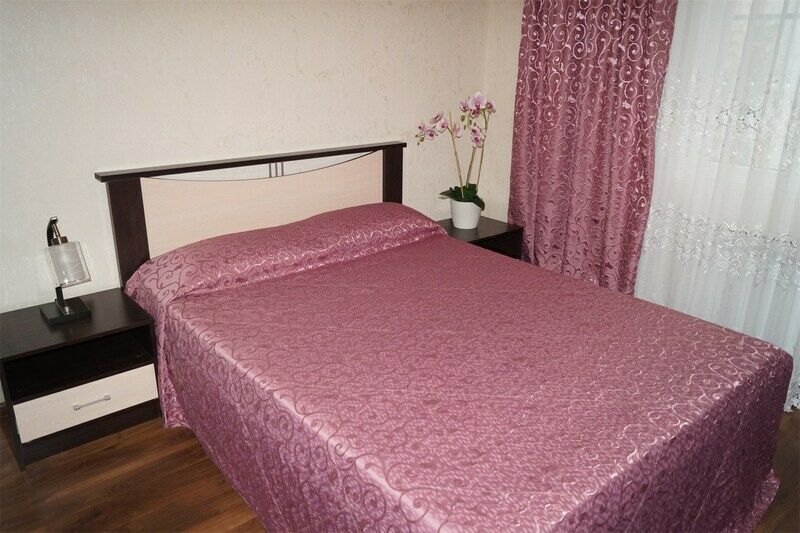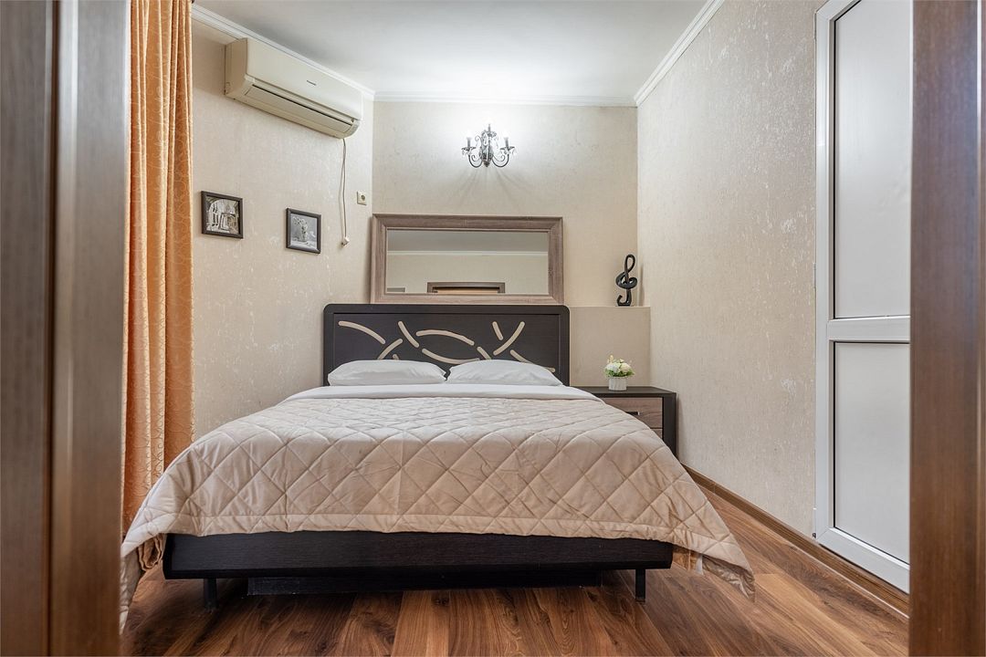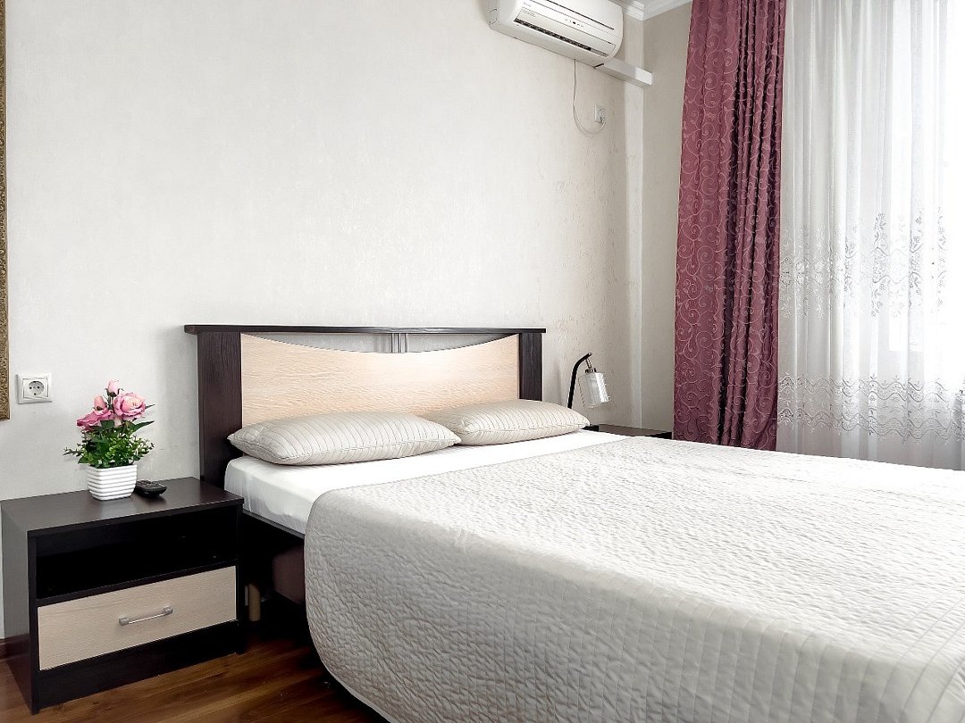 Уютные, комфортные апартаменты с 1 спальней, гостиной, кухней и террасой. В спальне двуспальная кровать, телевизор, кондиционер, шкаф-купе, выход на террасу, вид на улицу. В гостиной диван на 2 гостя, телевизор. Собственная ванная комната, кухня оборудованная холодильником, микроволновкой, чайником, плитой, набором посуды. Предоставляется комплект постельного белья, полотенец, фен. Заселение круглосуточное.Услуги и удобства