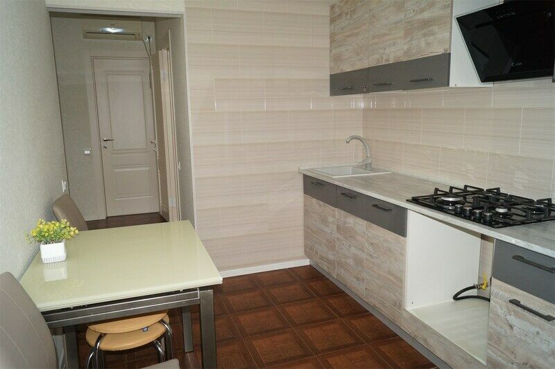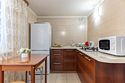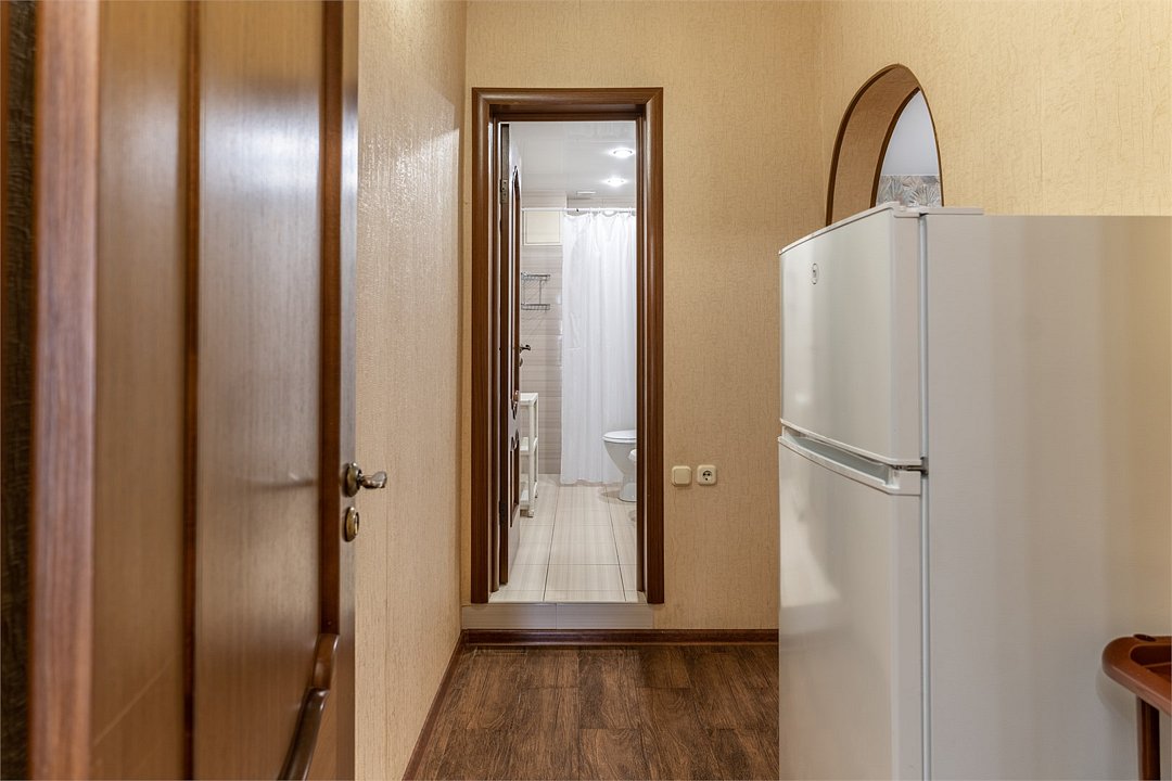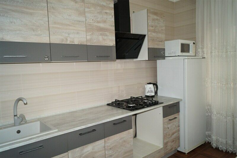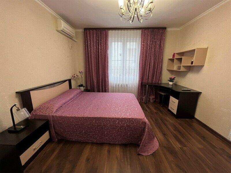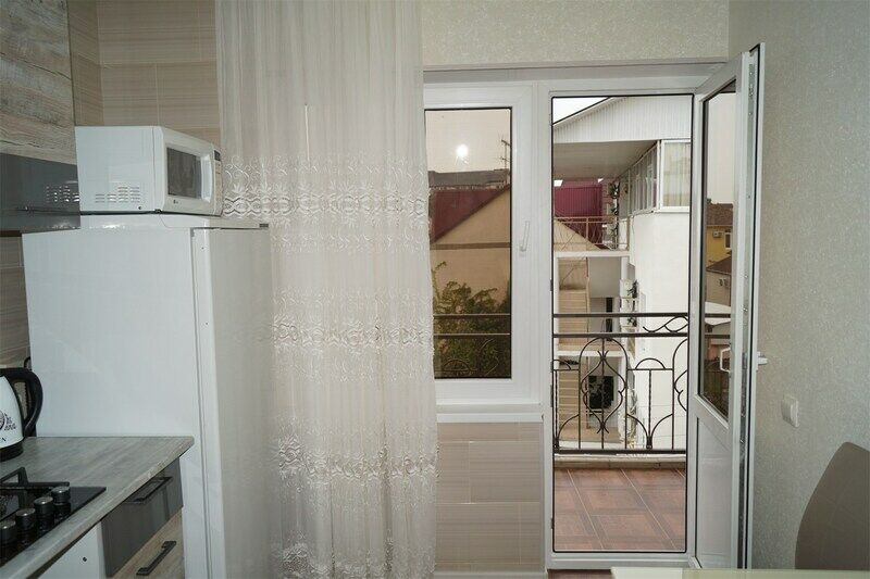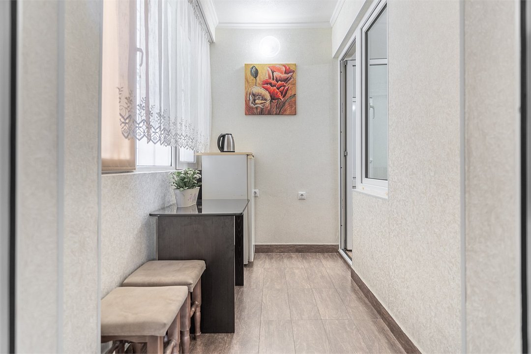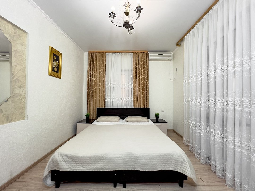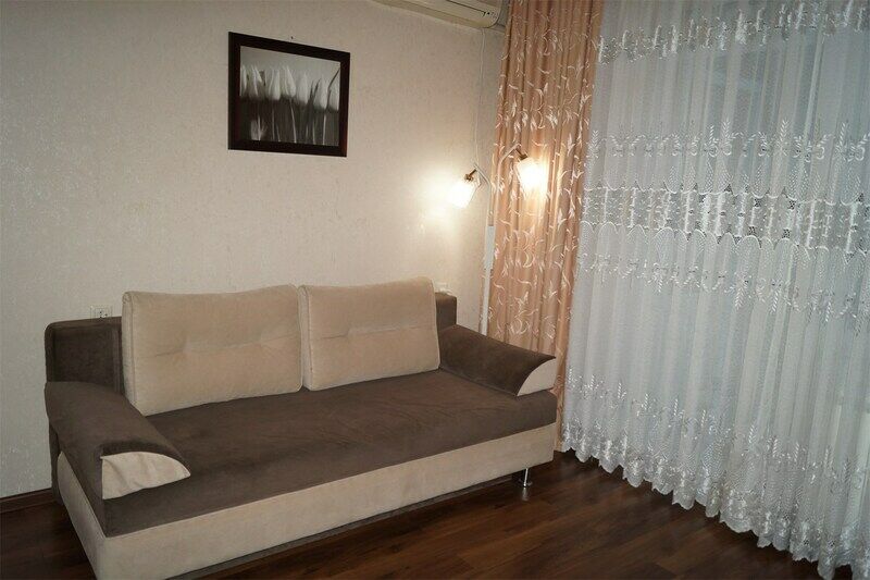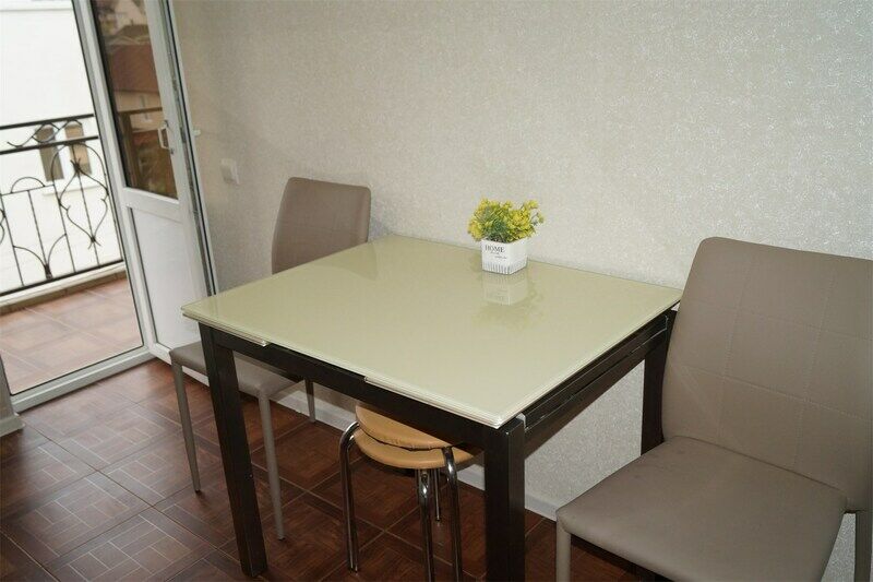 Уютные, комфортные апартаменты с 1 спальней, гостиной, кухней и террасой. В спальне двуспальная кровать, телевизор, кондиционер, шкаф-купе, выход на террасу, вид на улицу. В гостиной диван на 2 гостя, телевизор. Собственная ванная комната, кухня оборудованная холодильником, микроволновкой, чайником, плитой, набором посуды. Предоставляется комплект постельного белья, полотенец, фен. Заселение круглосуточное.Услуги и удобства