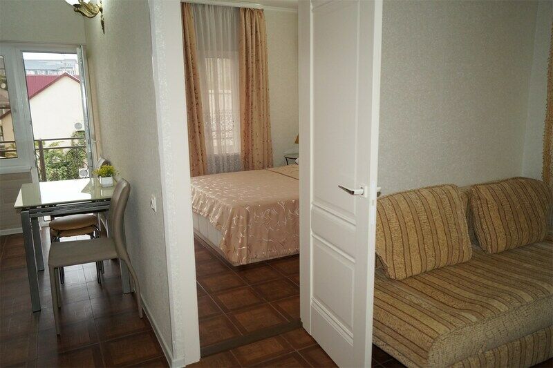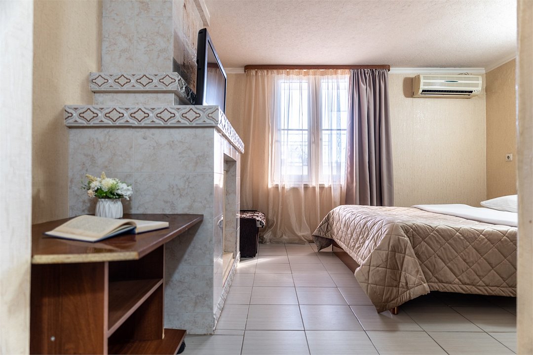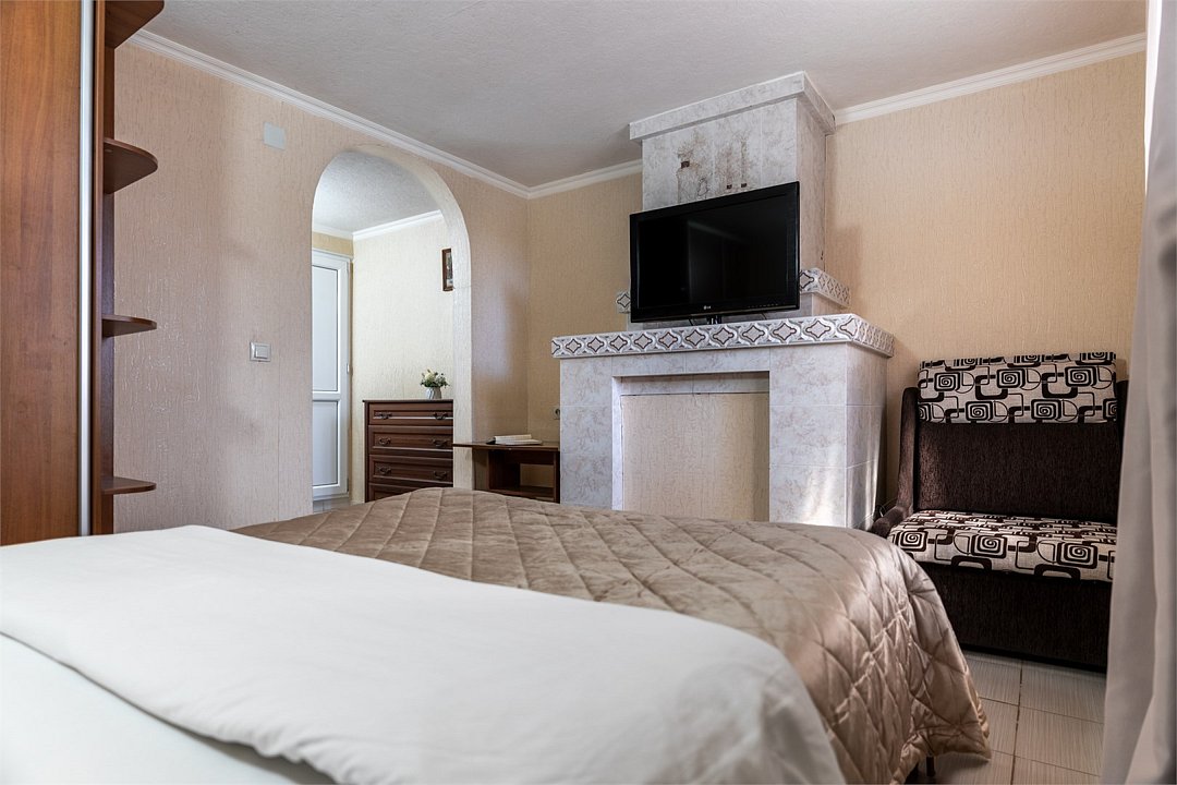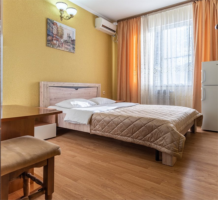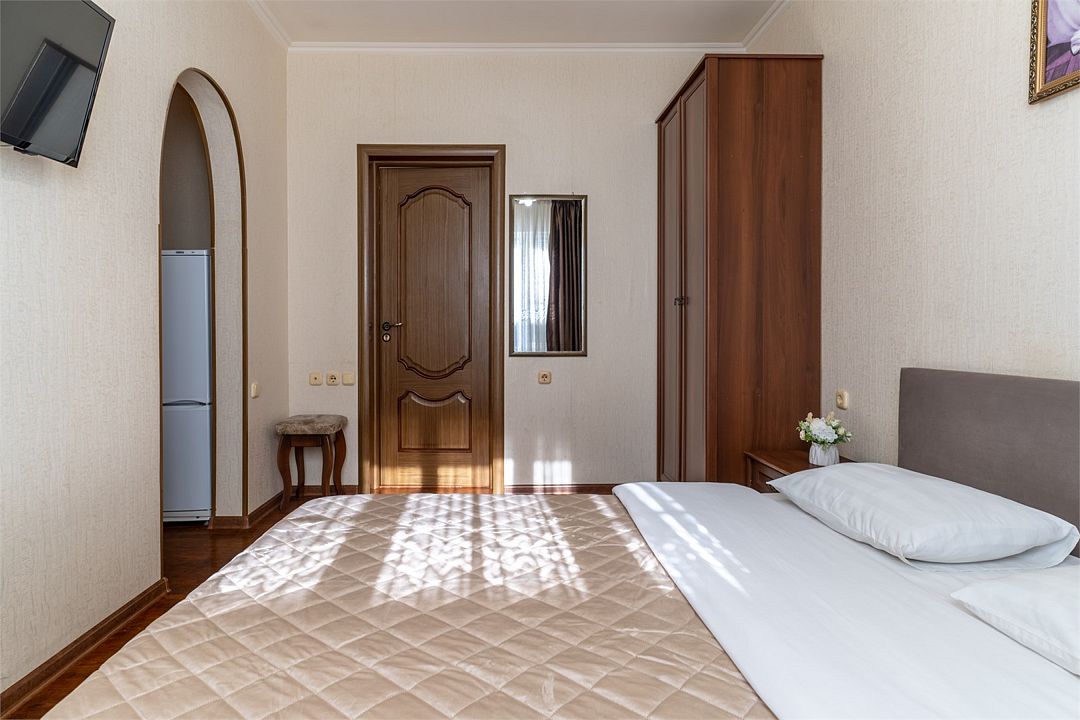Двухкомнатный номер с двуспальной кроватью и диван-кроватью. В номере необходимый набор мебели, телевизор, кондиционер, холодильник. Собственная ванная комната.Услуги и удобства