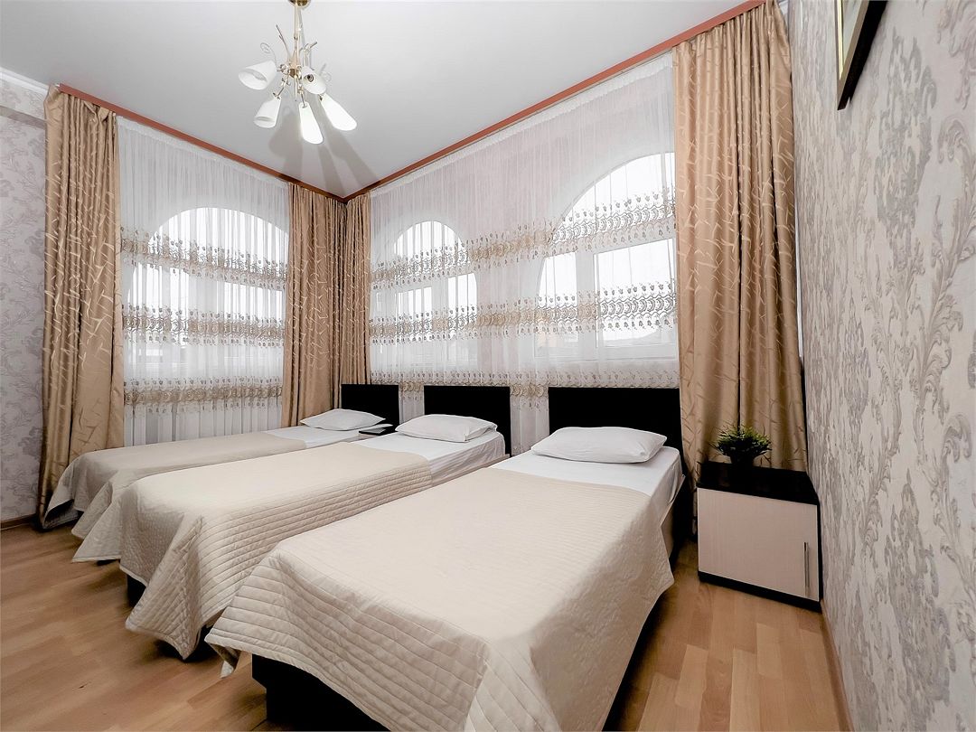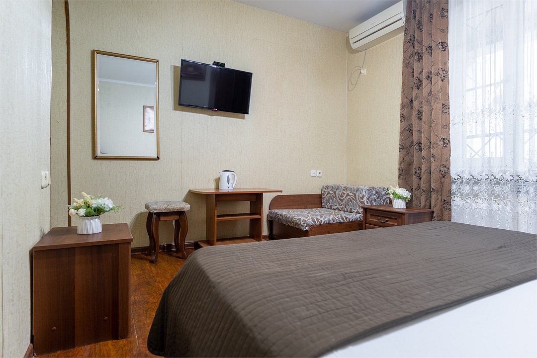 Уютный трехместный номер с тремя односпальными кроватями или одной совмещенной и односпальной или одной совмещенной и тахтой. Номер оснащен шкафом для одежды, прикроватными тумбочками, журнальным столиком, зеркалом. Для комфортного отдыха в номере имеется: кондиционер, холодильник, телевизор, постельное белье, полотенца для лица, тела, ног. В зимнее время работает отопление.Услуги и удобства