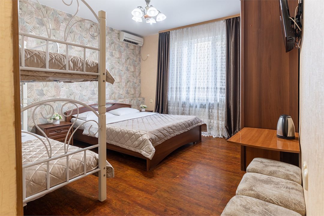 кабельное телевидение, Wi-Fi, холодильник, фен, ванная комната, двуспальная кровать, две односпальные кровати, гладильная доска, тумбы, стулья, шкаф для одежды, вешалки, журнальный столик, зеркало, стиральная машина, чайник, унитаз, раковина, двухъярусные кровати, душ, вид на город, вид во двор, стаканы, тумба, сплит-система, сушилка для белья, телевизор с плоским экраном, мыло, без питомцевВ гостиничном номере