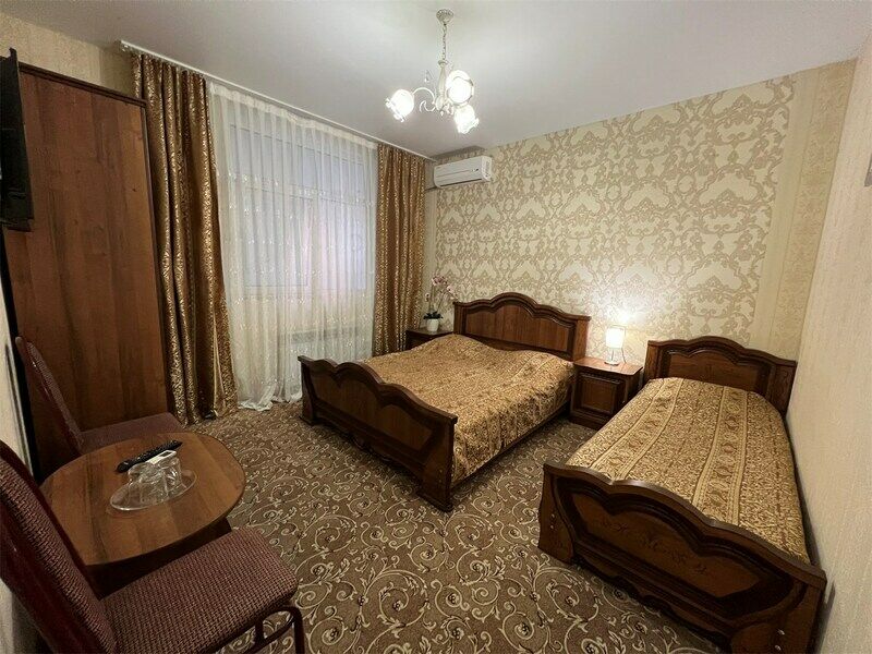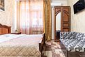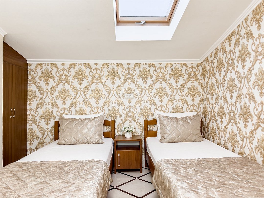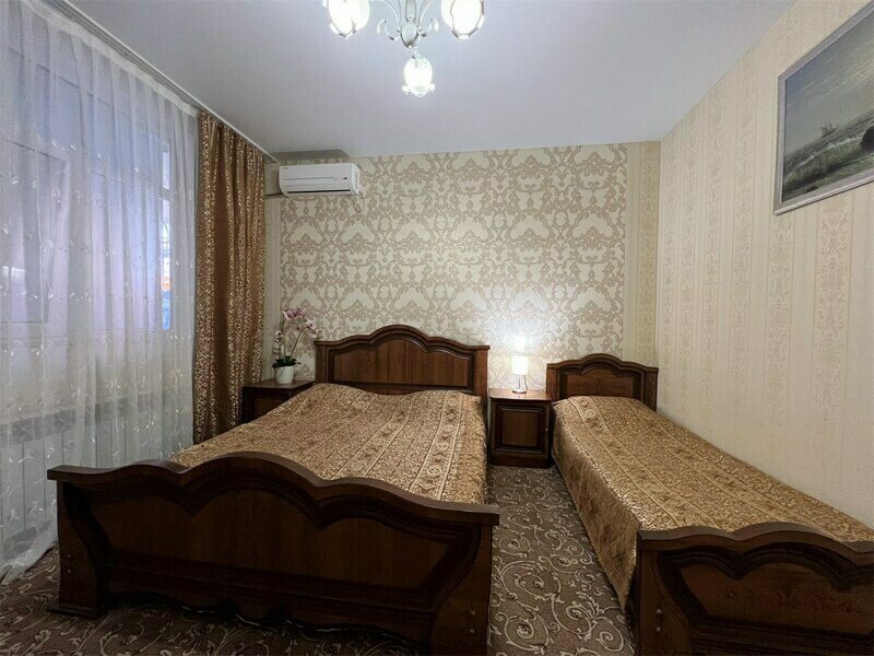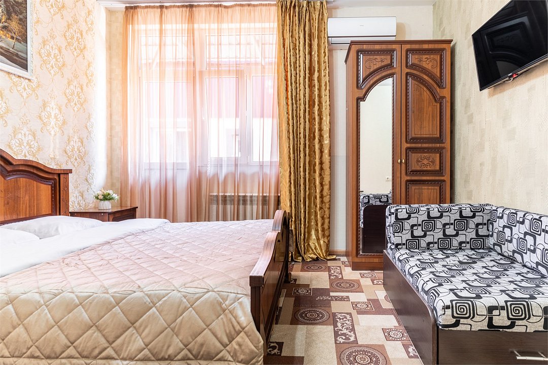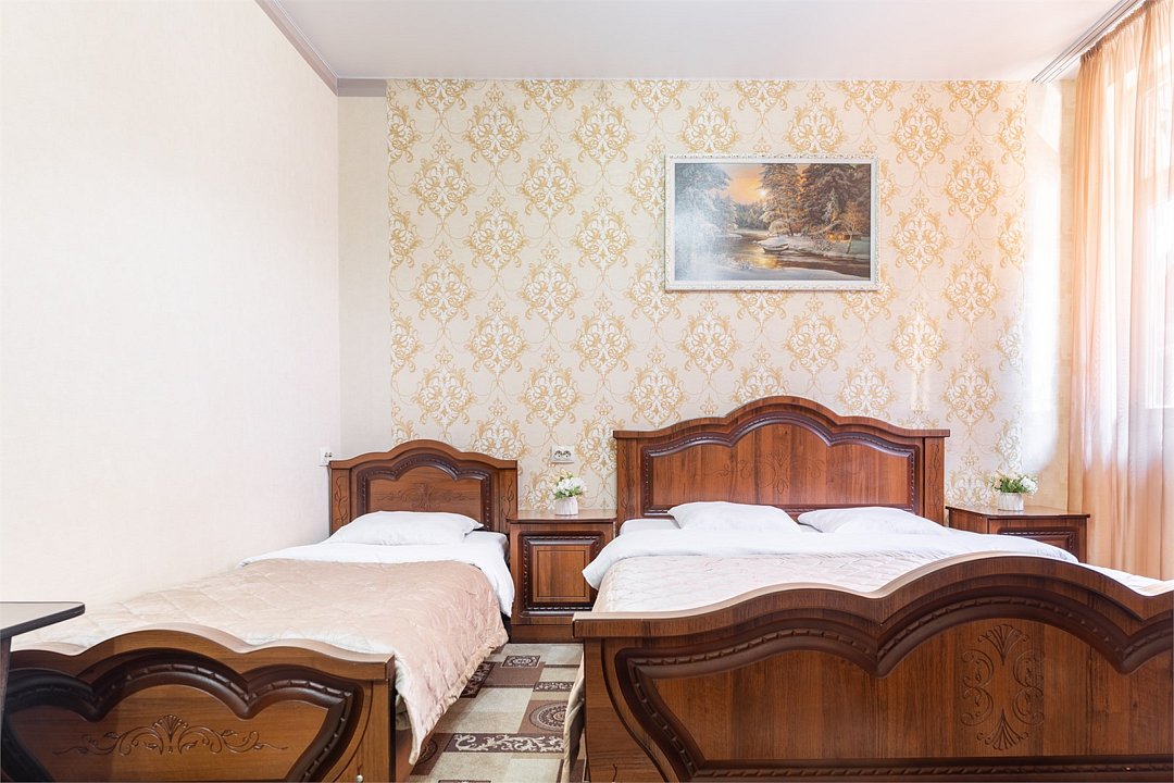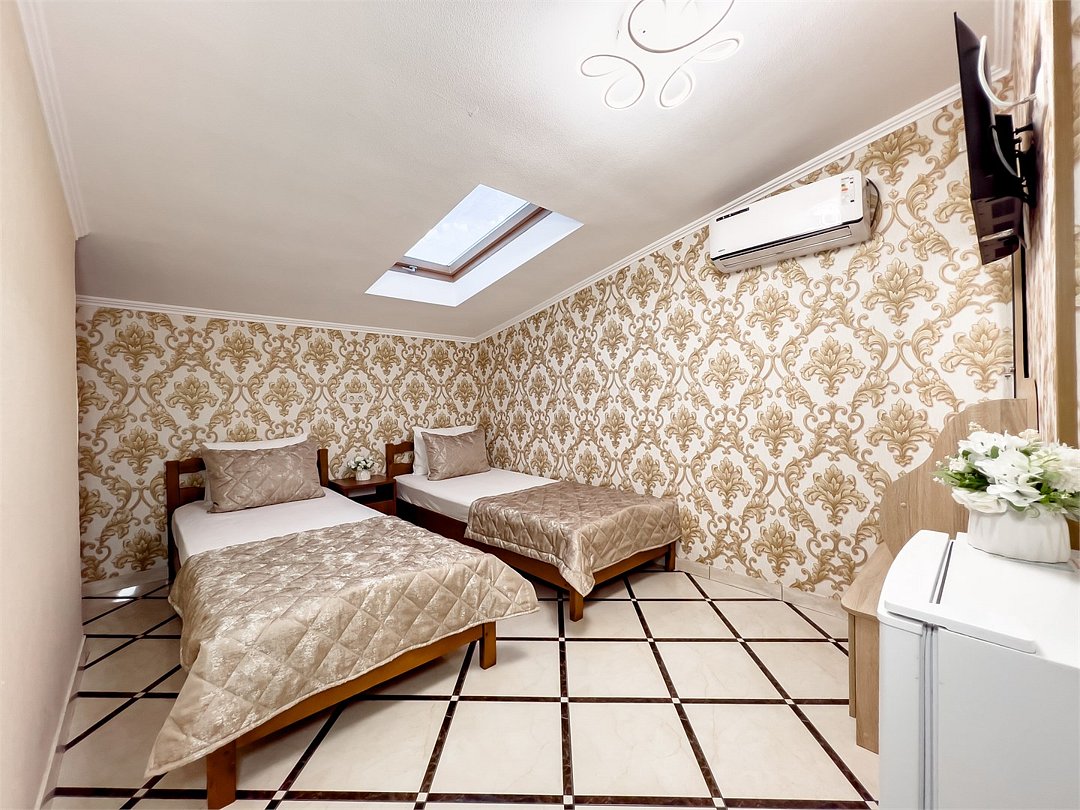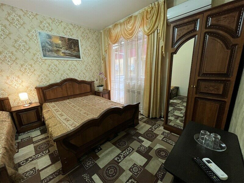 Двухкомнатный семейный номер, оформлен в классическом стиле. В номере имеется все необходимое для удобного время препровождения, включая удобную мебель двуспальную кровать в одной спальне и две односпальные в другой, 2 кондиционера, 2 телевизора , холодильник, Wi-Fi, полотенца. Собственная ванная комната. Номера расположены на 2,3 этажах.Услуги и удобства