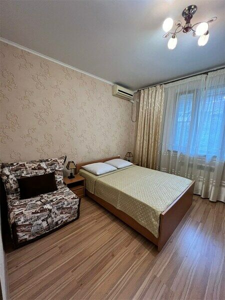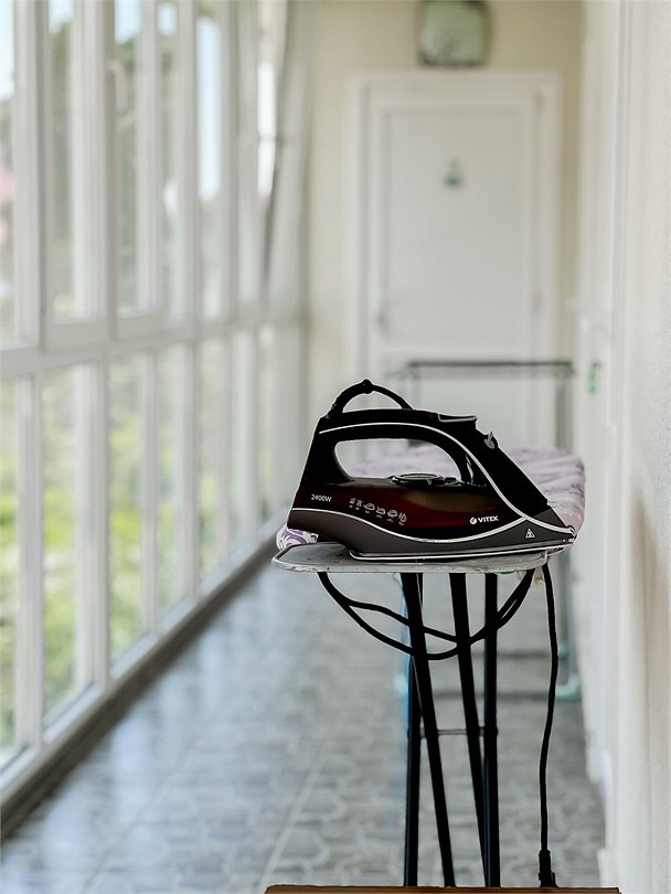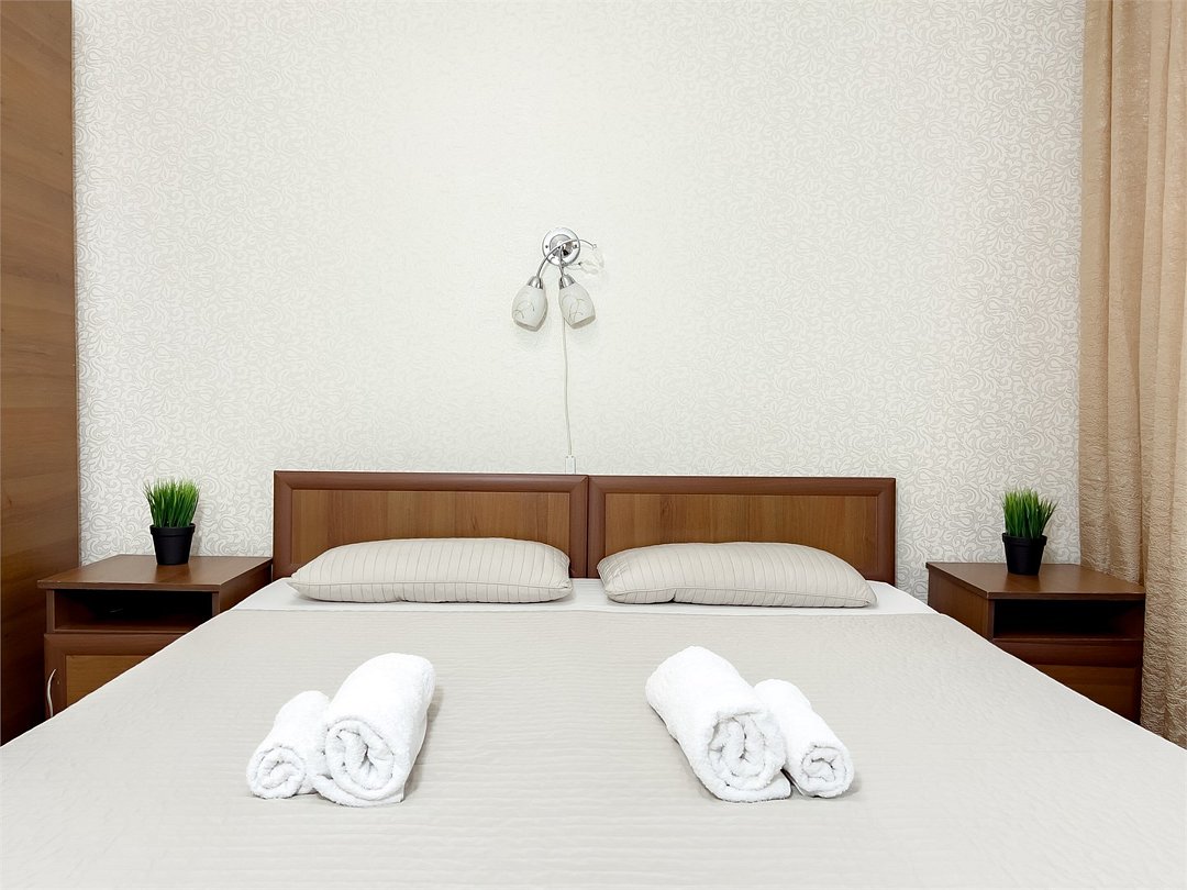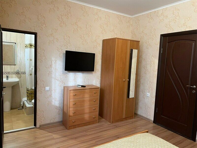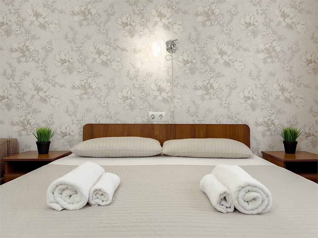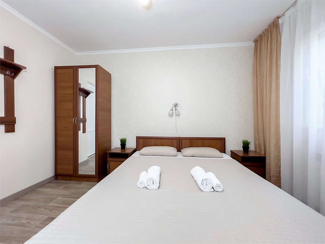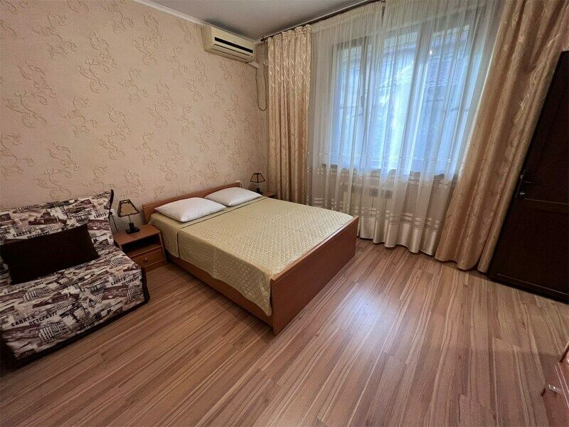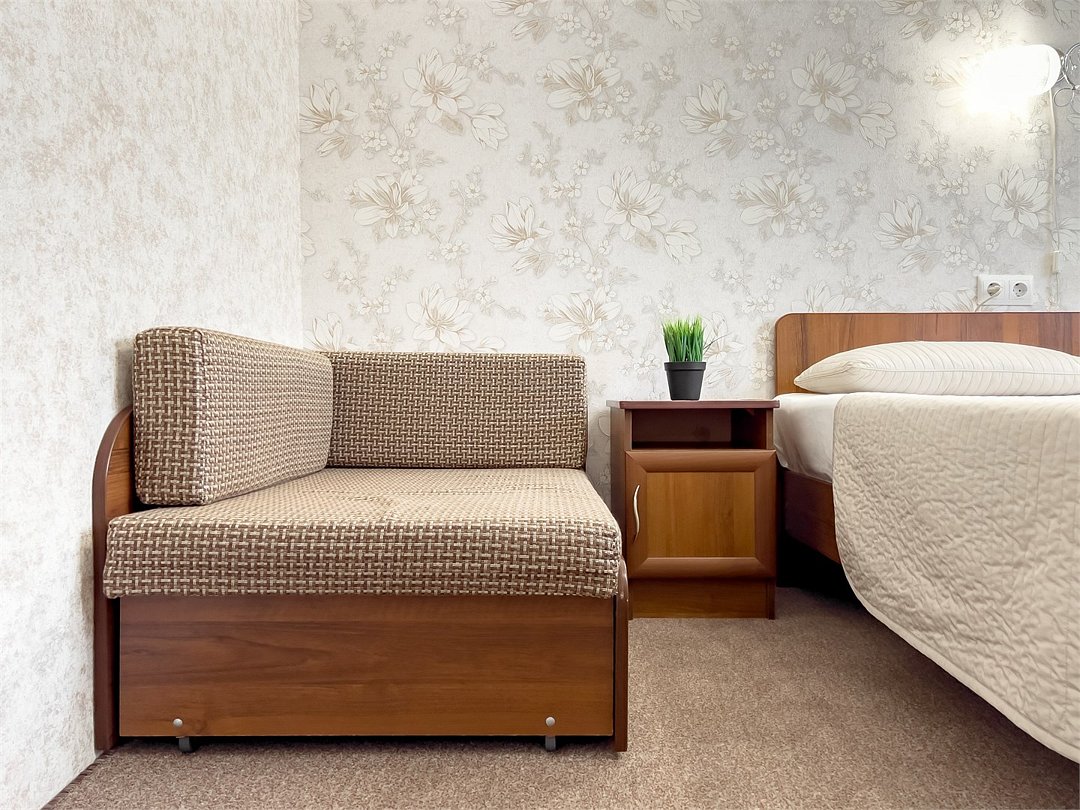телевизор, Wi-Fi, холодильник, фен, утюг, ванная комната, банные полотенца, двуспальная кровать, тумбы, шкаф для одежды, вешалки, зеркало, унитаз, раковина, душ, вид на город, вид во двор, стул, сплит-система, цифровое тв, диван-кровать, номер для некурящих, рабочий стол, мыло, без питомцевВ номере