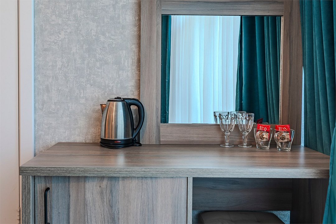 Номера оснащены всем необходимым для комфортного отдыха, кондиционер, телевизор, мини — холодильник, в санузле имеется душ, фен, набор полотенец. Бесплатно для гостей предоставляется гладильная комната, утюг и гладильная доска.