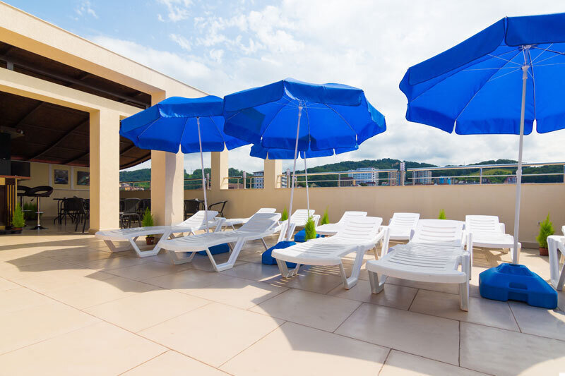 В солярии топчаны, кресла, качалки, столики и неплохой вид на море. Едален по близости нет, запахи и музыка жизнь не портят. Только достаёт массовик-затейник в ресторане Причал (очень громкая аудиосистема). Бассейн небольшой и довольно глубокий (детей без взрослых пускать нельзя), вода пресная, хлорированная (и, с учётом эпидобстановки, хорошо, что хлорированная).