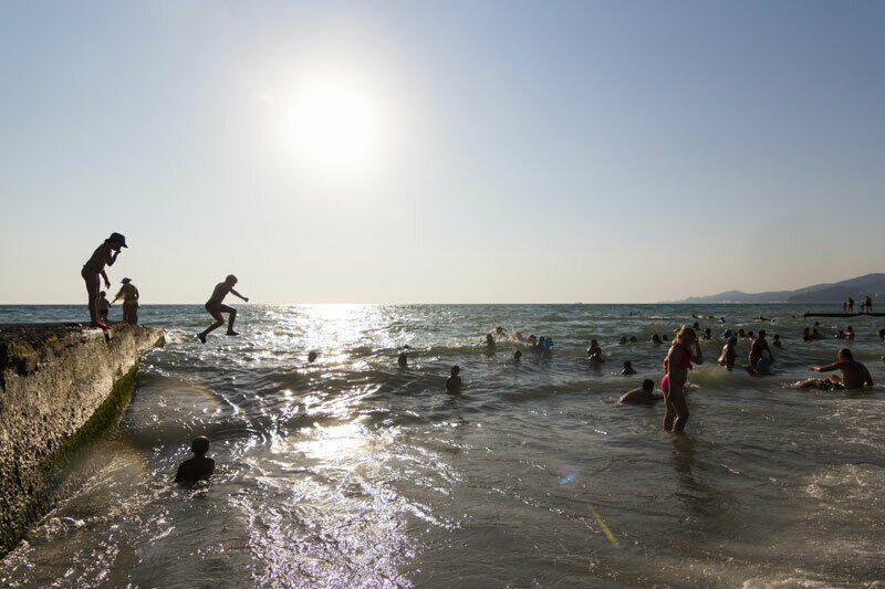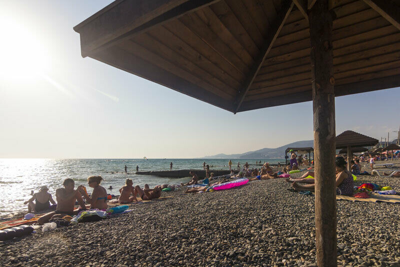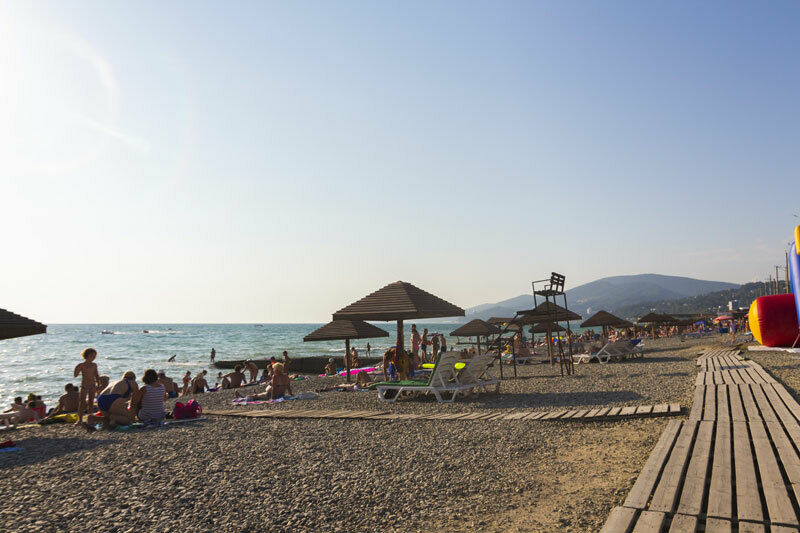 Пляж – средняя галька. Топчаны – 1000 рублей в день (каждый!), в Европе дешевле. Мы приехали через 2 дня после сильного дождя и вода была мутной, но на следующий день заметно посветлела. После этого мы заболели ротавирусной инфекцией в тяжёлой форме (местным властям пора уже озаботиться очисткой сточных вод!), неделю не выходили из отеля (спасибо ресторану) и на пляж больше не ходили, загорали у бассейна, дышали морским воздухом и любовались морем издали.
