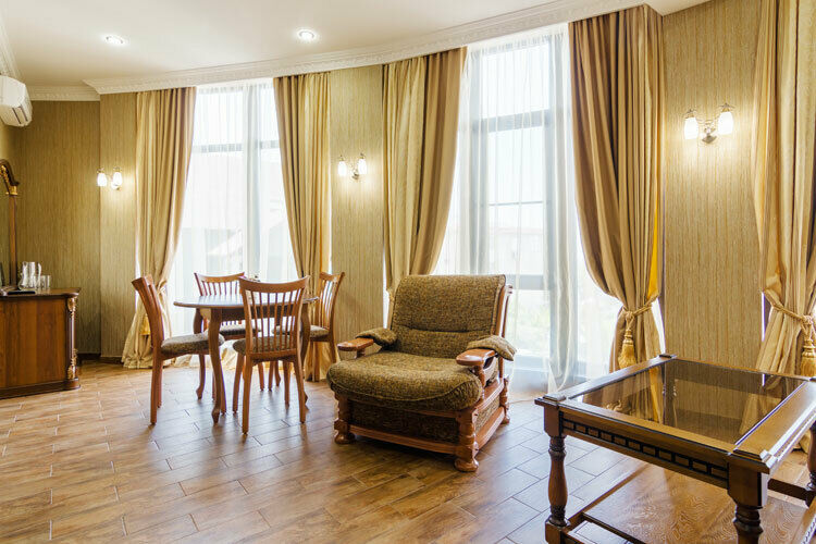 Мы брали люкс на 3м этаже. Огромная гостиная с панорамными окнами в сторону моря (к сожалению, вид частично загорожен соседними домами). Во второй половине дня в окна жарит солнце, глухие шторы спасают не до конца. В комнате диван, кресло, 2 стола (круглый обеденный и журнальный), несколько стульев, телевизор, холодильник, чайник, чашки, тарелки, стаканы, приборы. Небольшая спальня с выходом на балкон (столик, 2 табуретки, небольшая сушилка с прищепками). Почти всю спальню занимает двуспальная кровать (отличный ортопедический матрас). Кроме того, есть платной шкаф (в нём сейф), 2 тумбочки, письменный стол, стул и табурет, напольная вешалка, телевизор. В обеих комнатах кондиционеры.