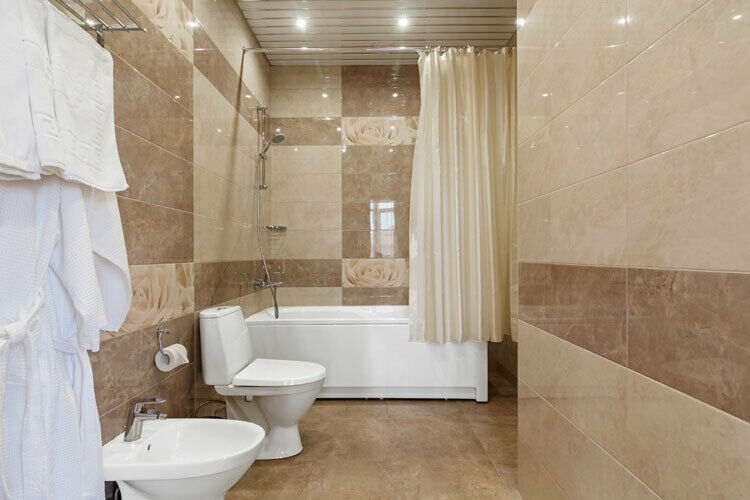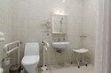 Санузел просторный. Большая ванна, раковина с зеркалом, унитаз, биде, полотенцесушитель. По 3 полотенца и халату на человека. Есть одноразовые тапочки, зубные щётки и шапочки. Мыло и гели для душа докладывали с избытком.