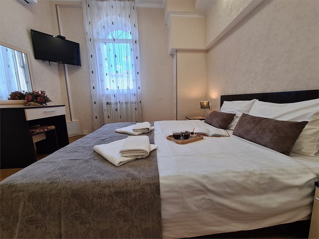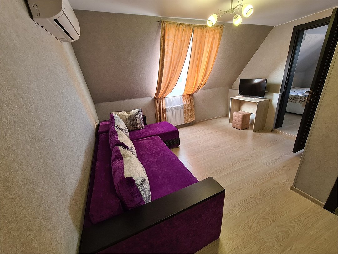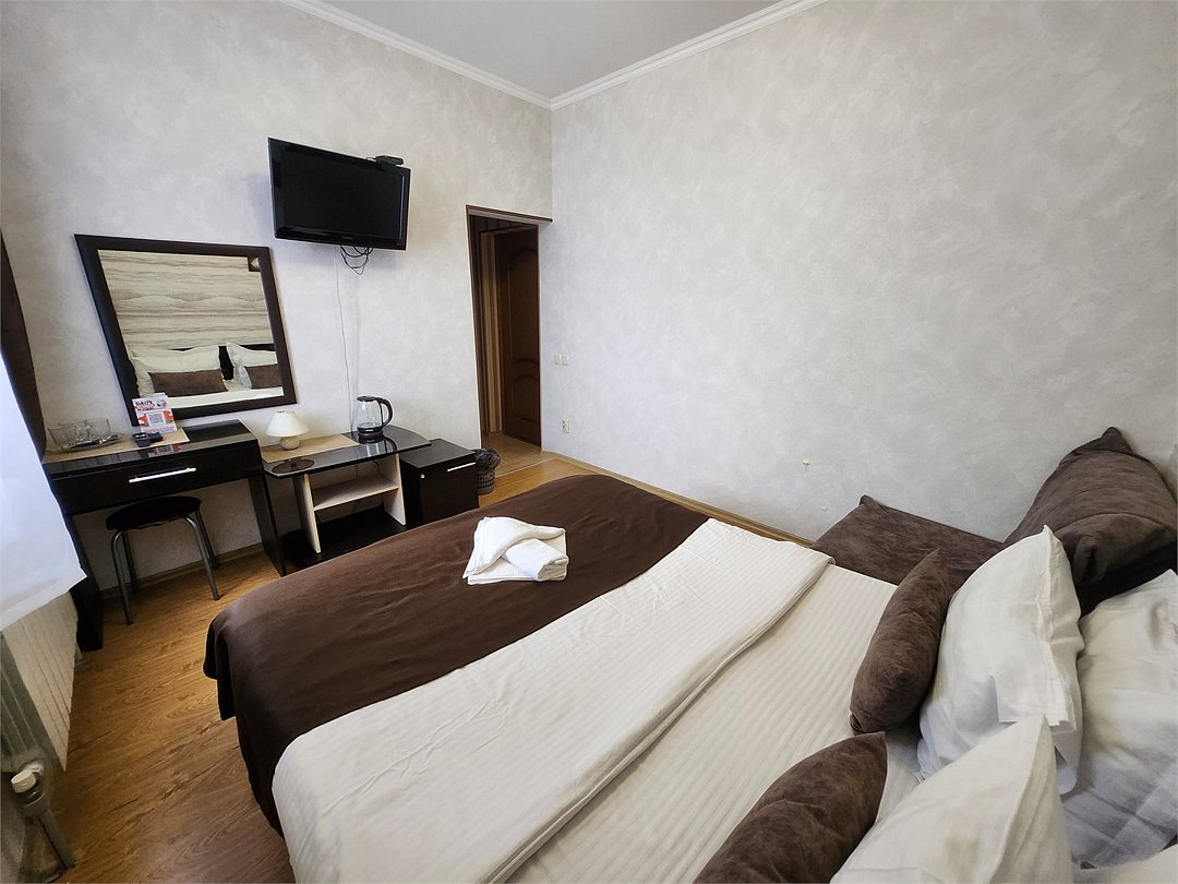 Двухкомнатный номер люкс. Спальные места: двуспальная кровать и диван-кровать или двуспальная кровать и две односпальные. Возможно поставить допместо (раскладушку). Взимается залог в размере 2000рУслуги и удобства